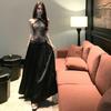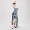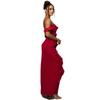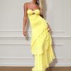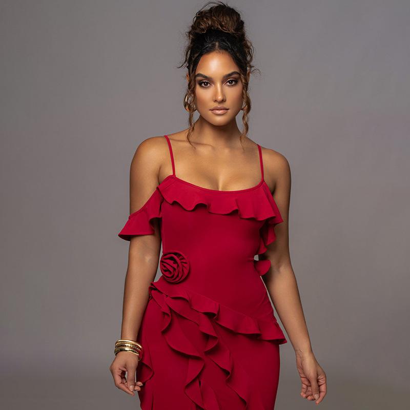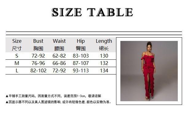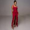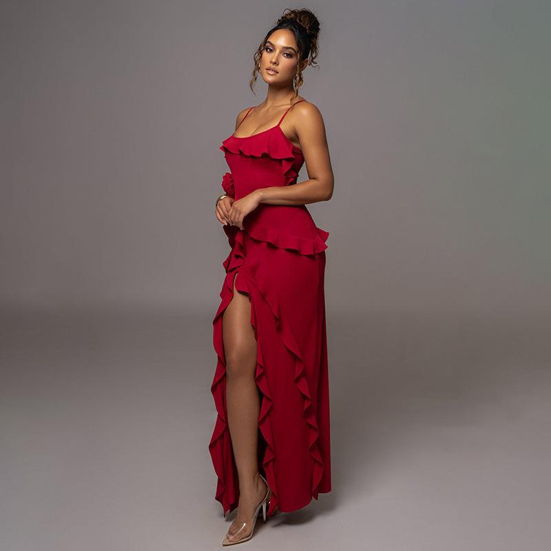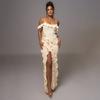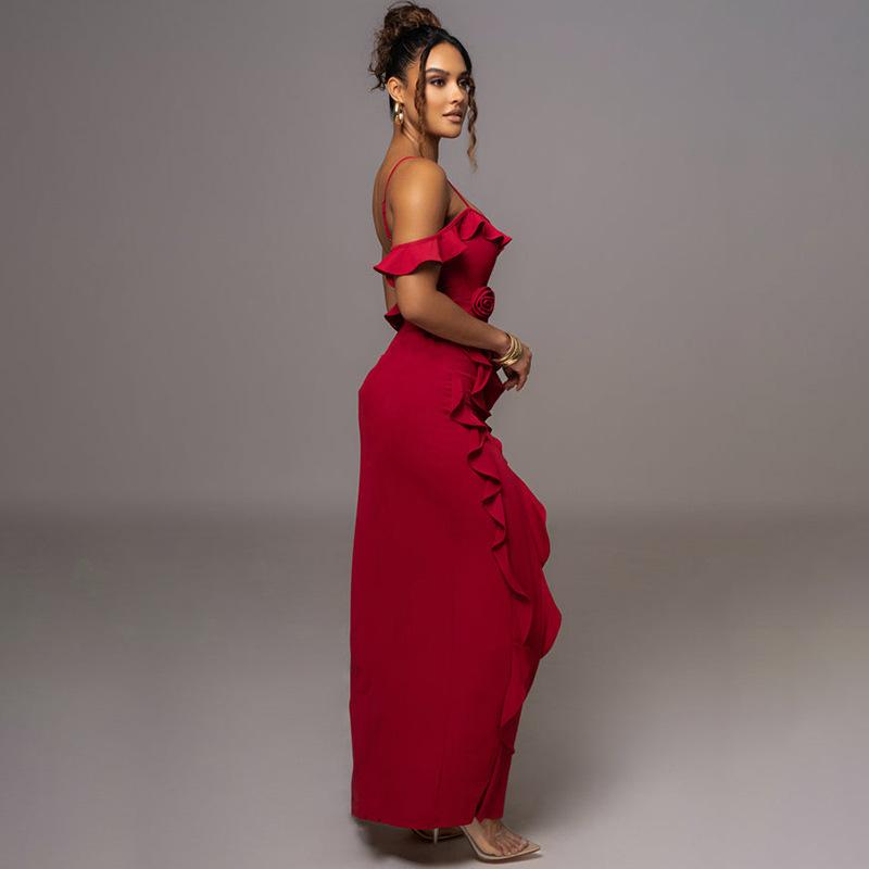 2025 Elegante y Delicado Elegante Color Puro Tirantes Hombro Descubierto Asimétrico Volantes Costuras Flor Estéreo Abertura Falda Larga para Mujer
