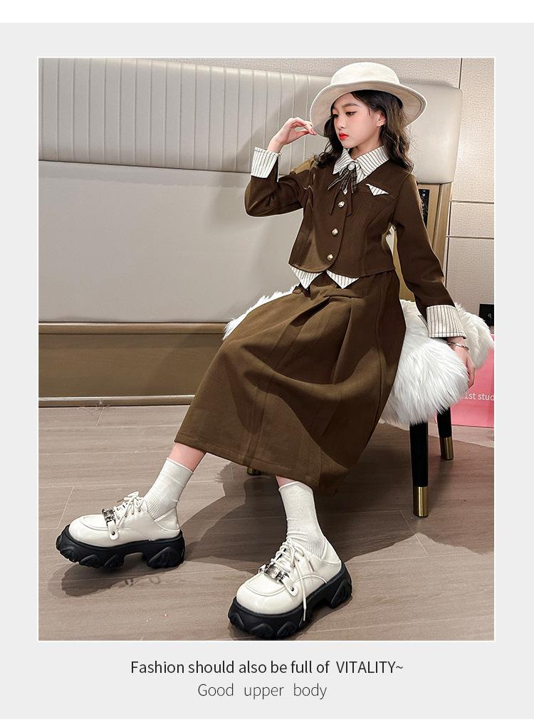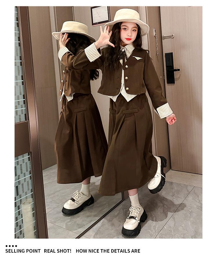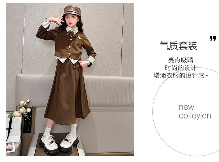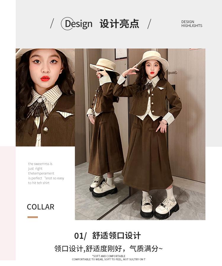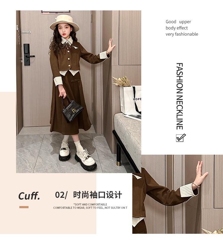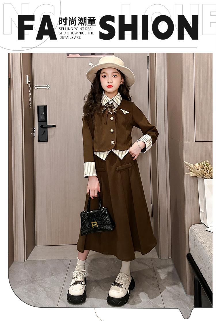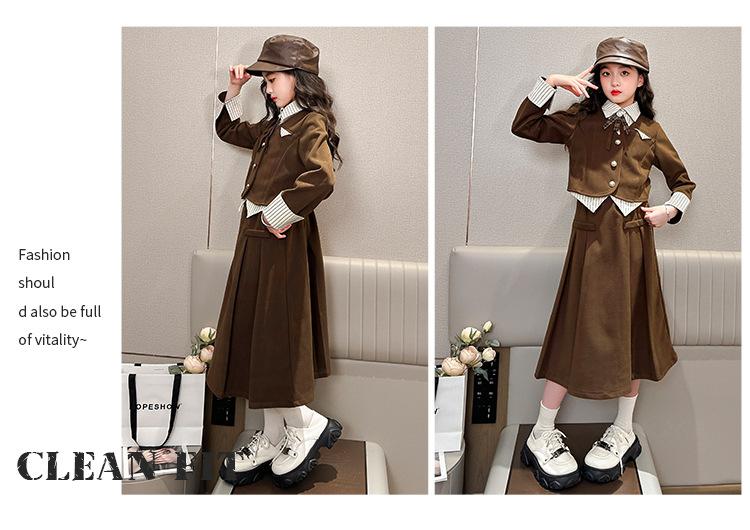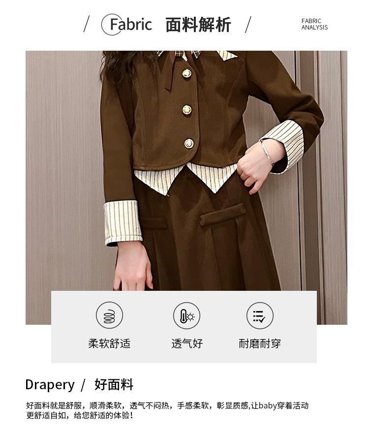 Traje de estilo universitario para niñas 2024 Otoño Nueva Moda Top de dos piezas falsas Falda Dos piezas Vestido Otoño Transfronterizo