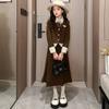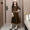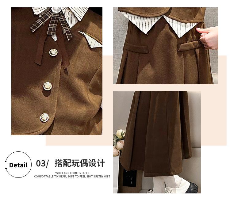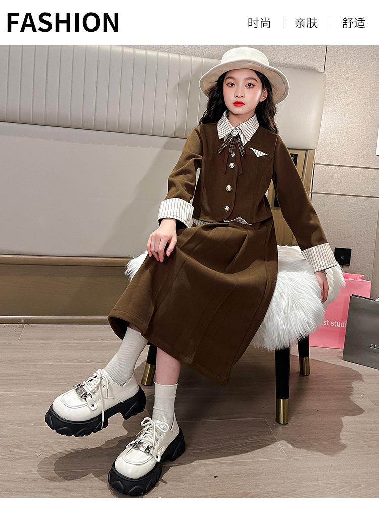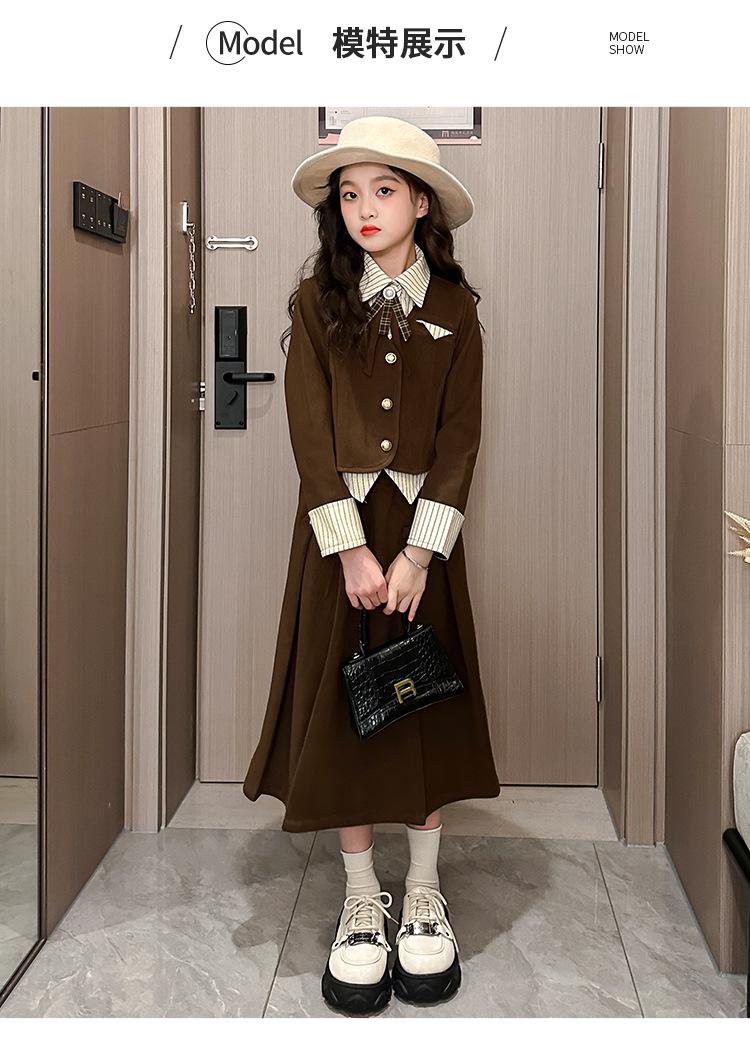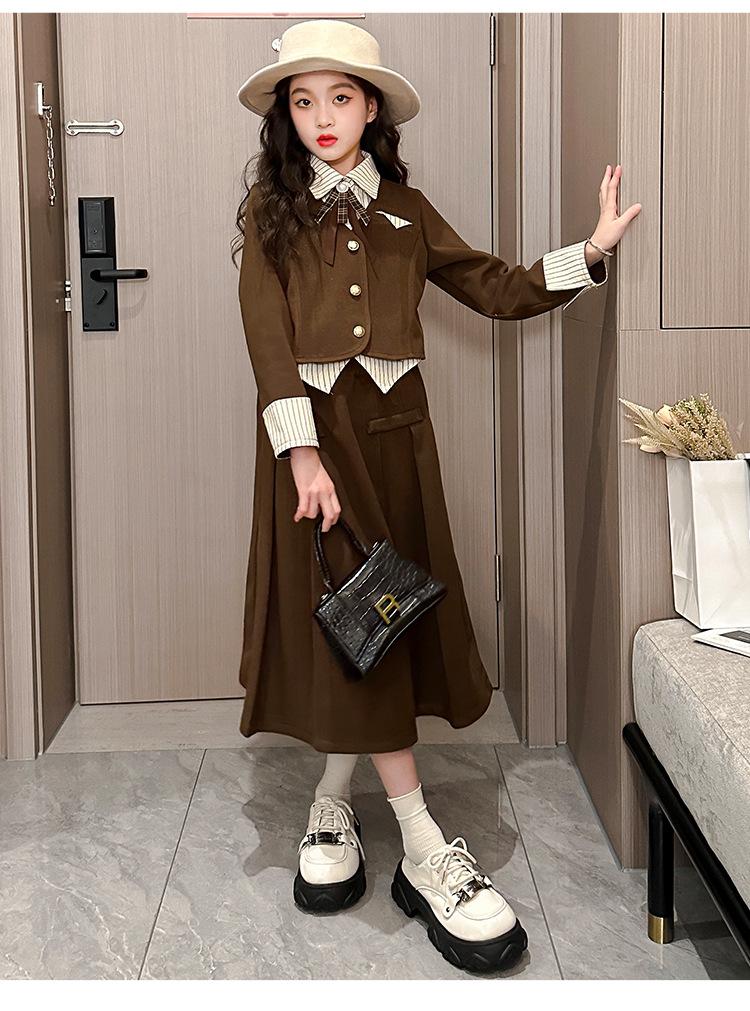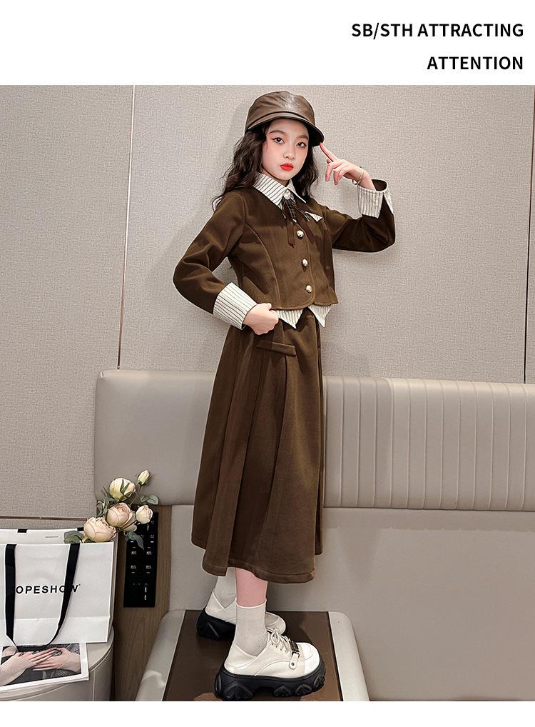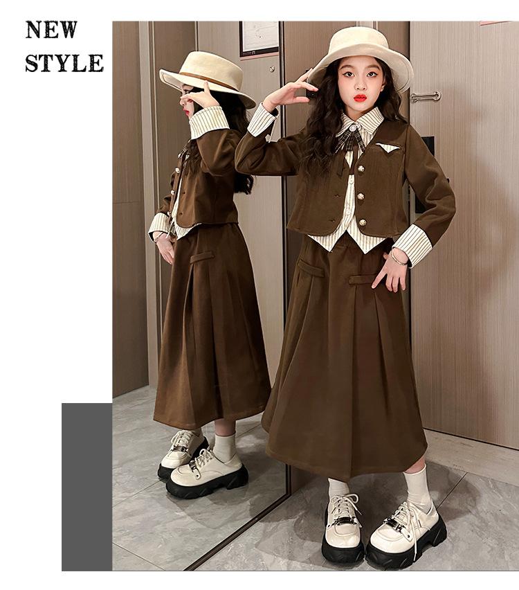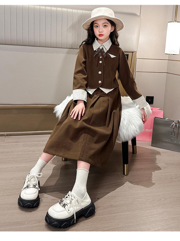 Traje de estilo universitario para niñas 2024 Otoño Nueva Moda Top de dos piezas falsas Falda Dos piezas Vestido Otoño Transfronterizo