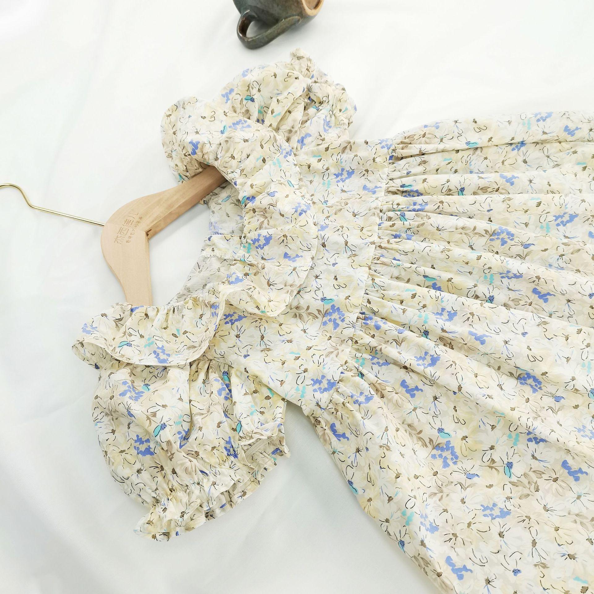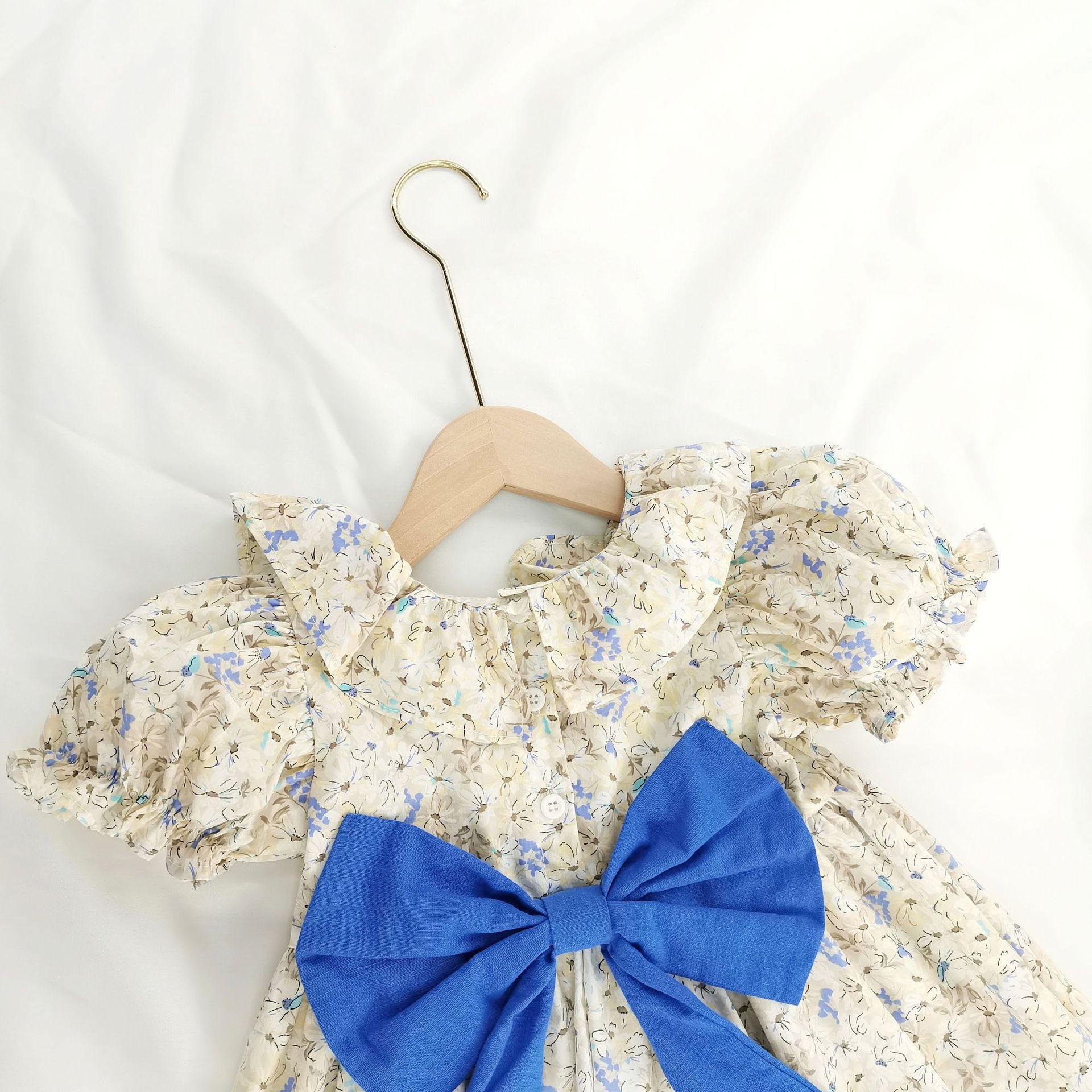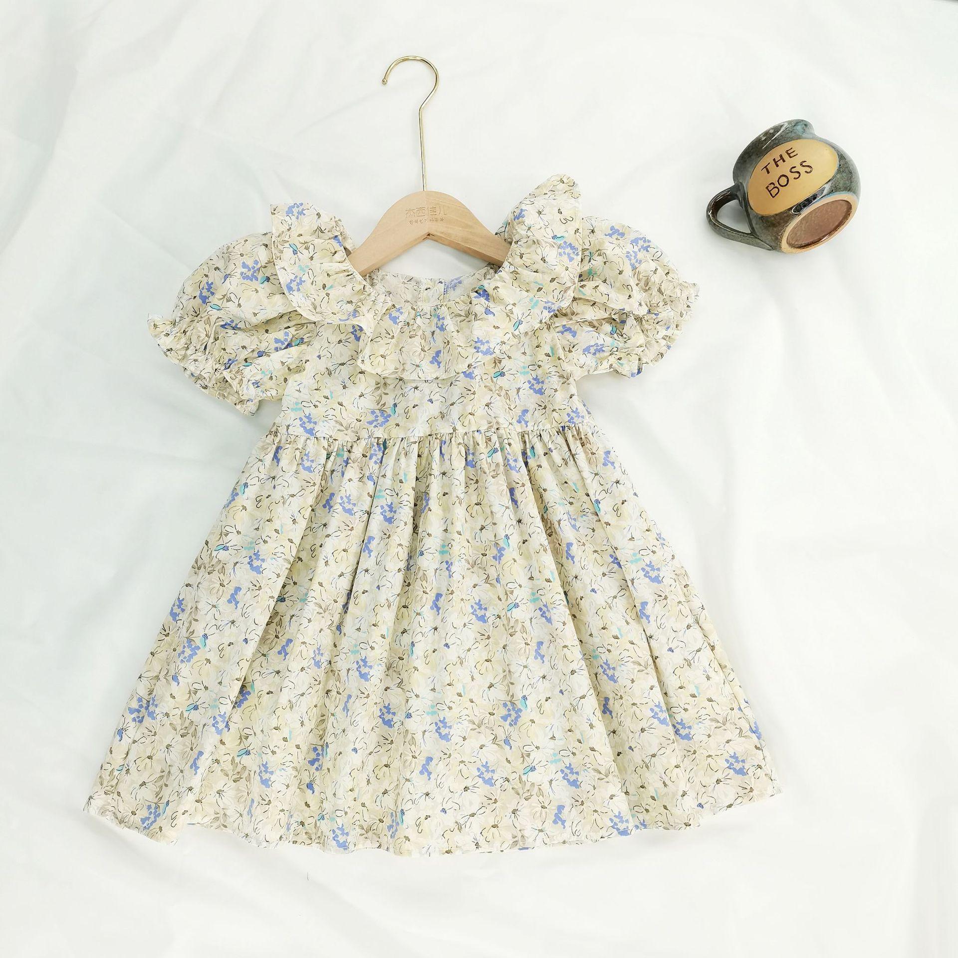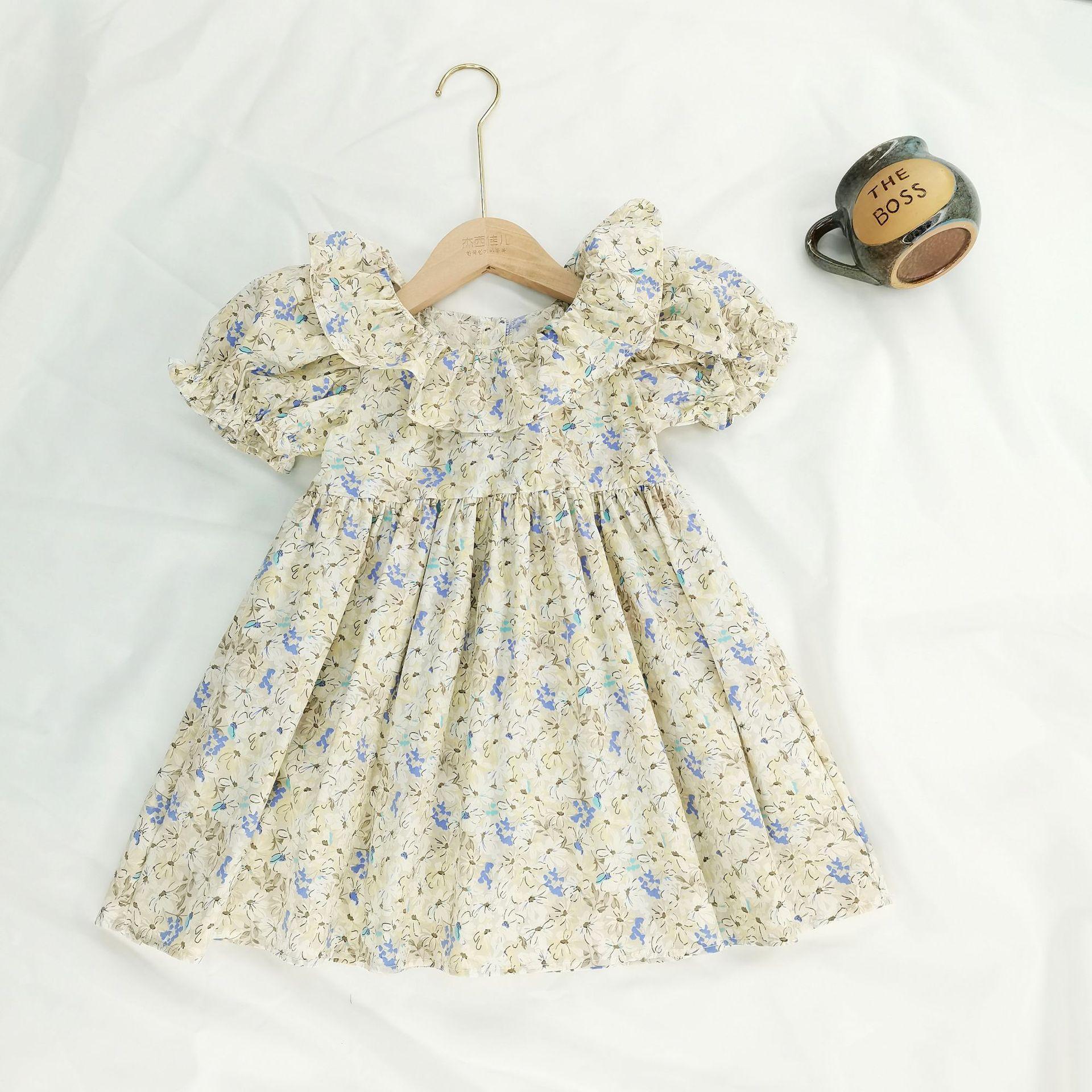 Vestido Nuevo de Verano para Niñas y Bebés Estilo Coreano Ins Retro Dulce Floral Manga Abullonada Lazo Vestido de Princesa