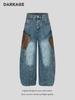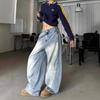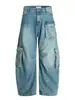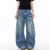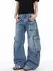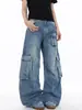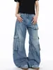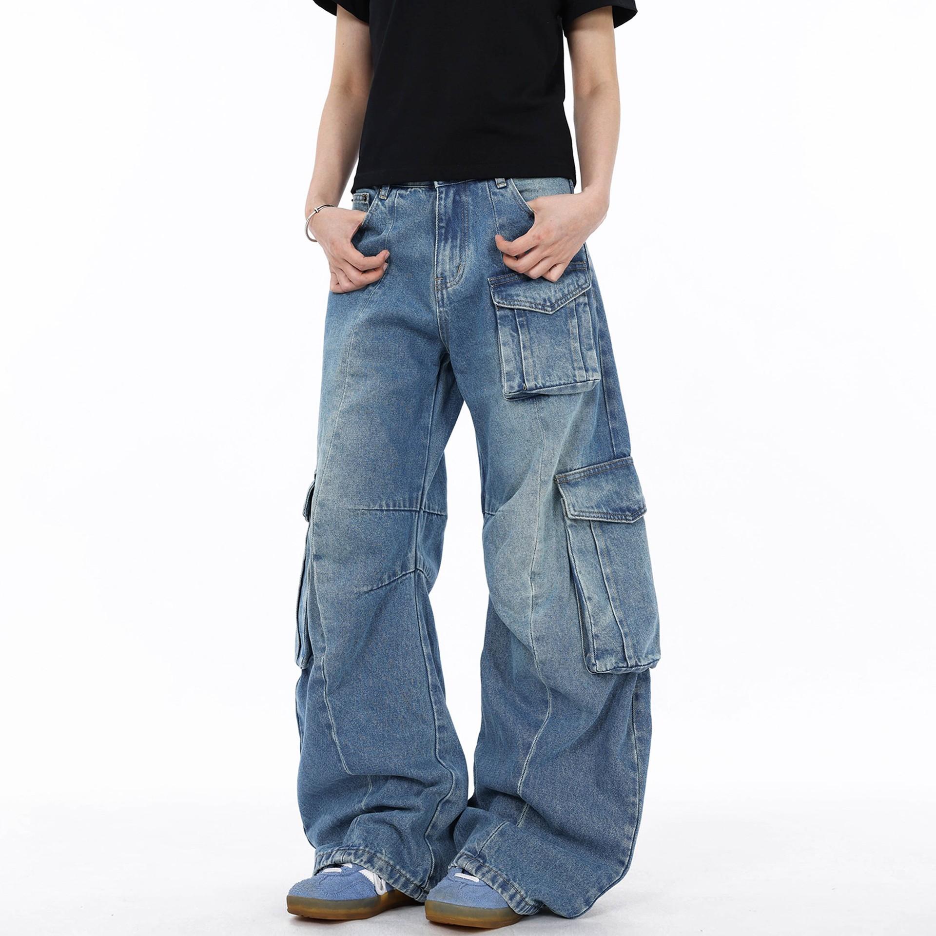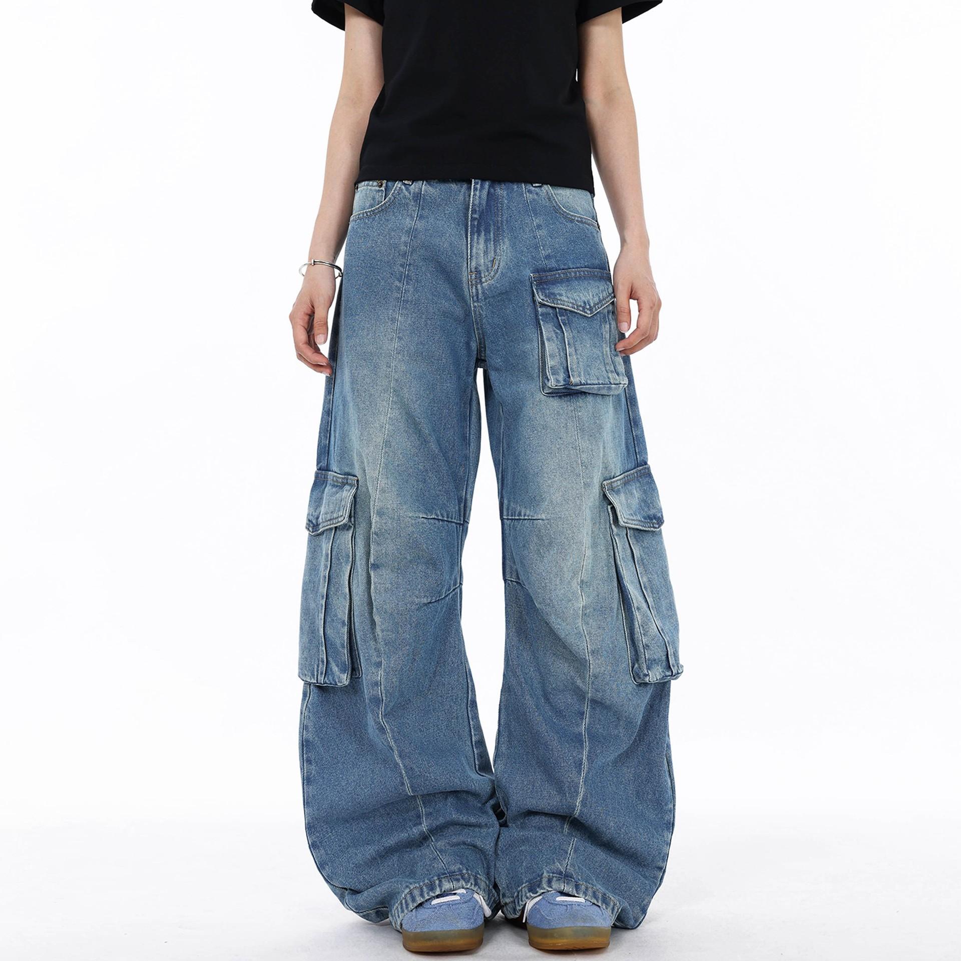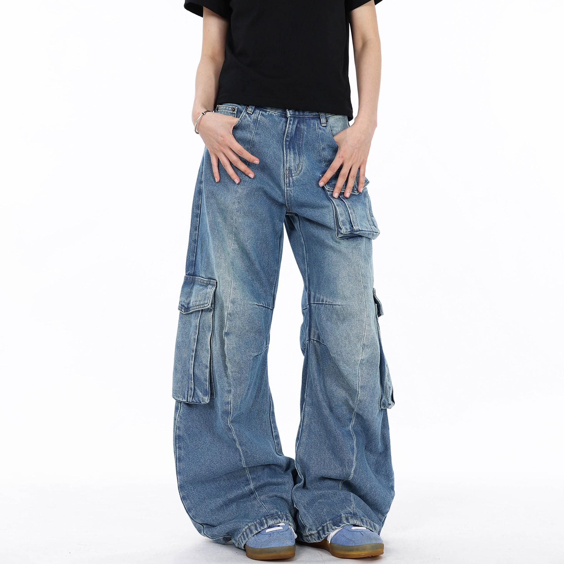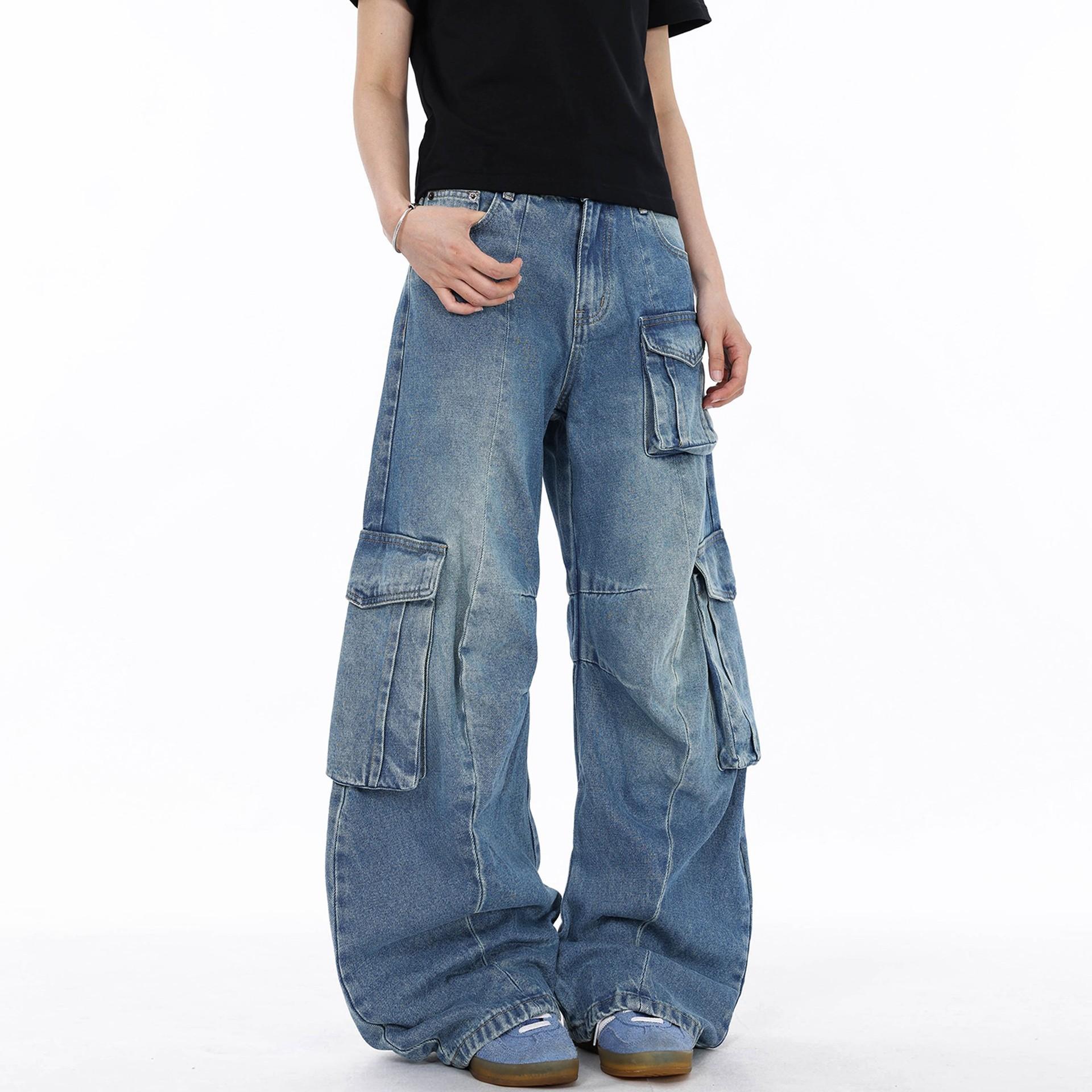 Estilo Callejero Americano Lavado Plisado Multibolsillos Cimitarra Jeans Sueltos Rectos Desgastados Pantalones Pierna Ancha Unisex Nuevo Moderno