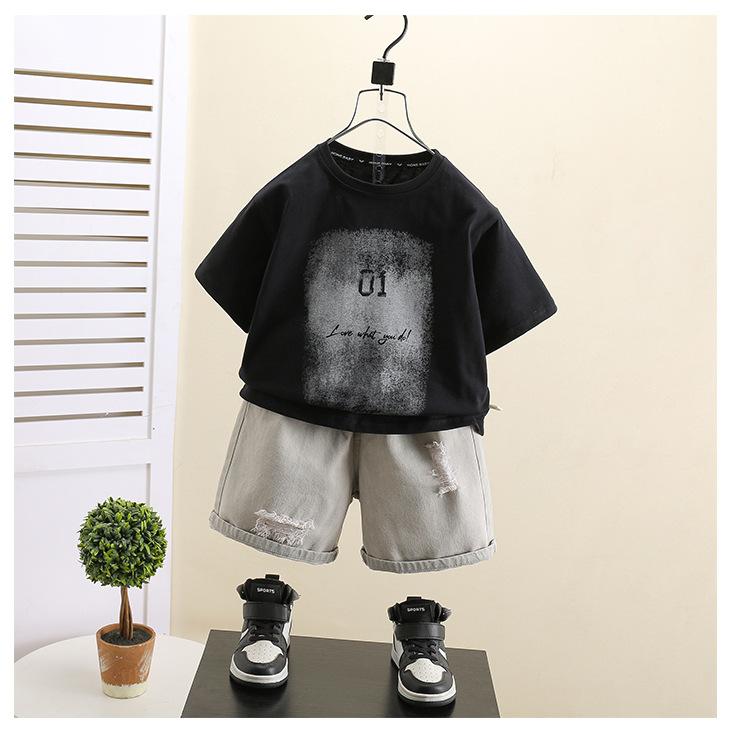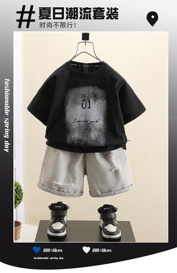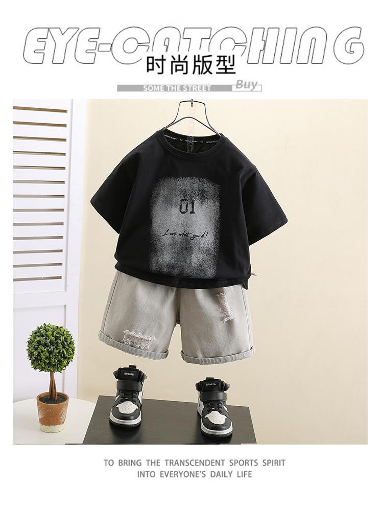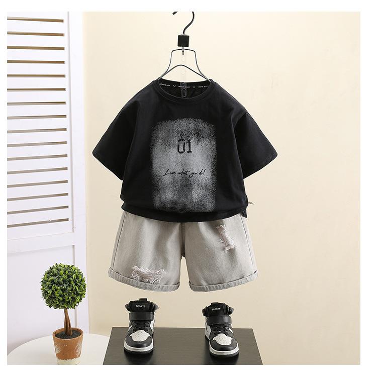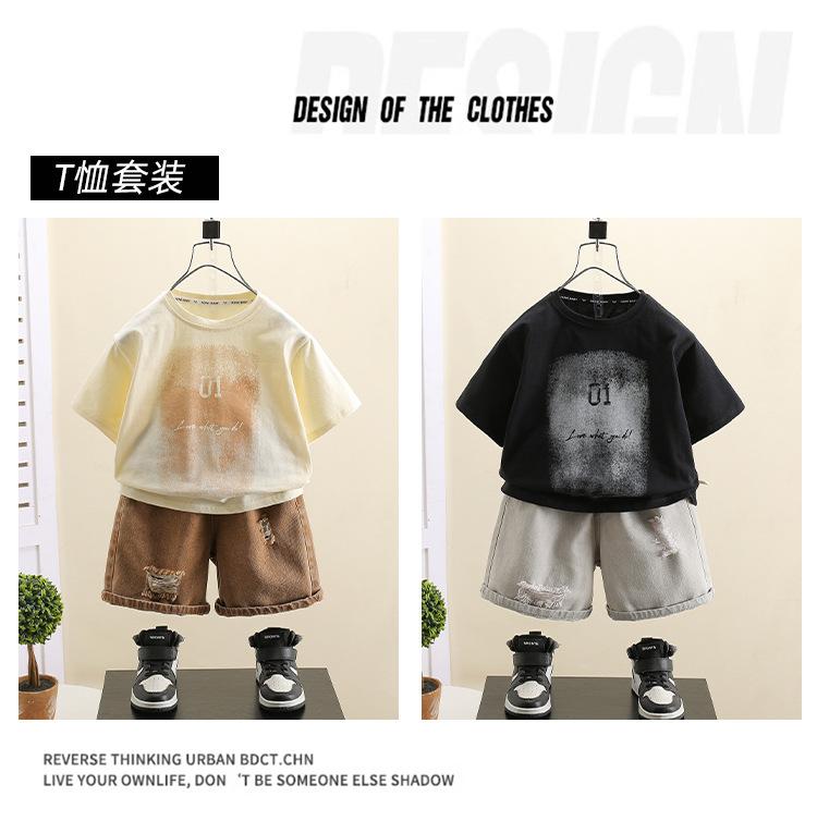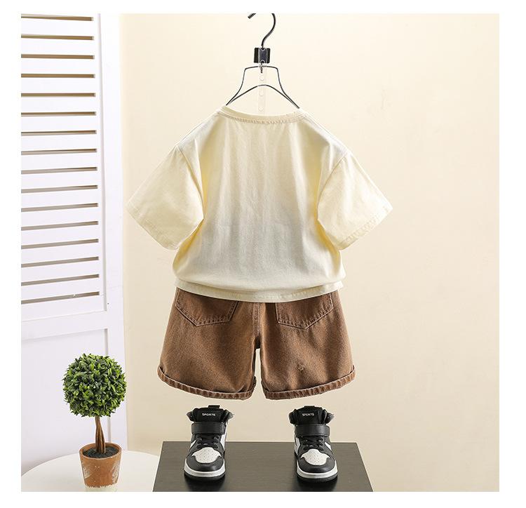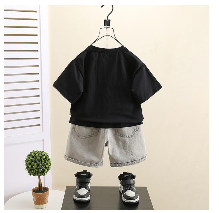 Traje de verano para niño de manga corta de algodón para verano, delgado, guapo, moderno, shorts de mezclilla, conjunto casual de dos piezas para niños