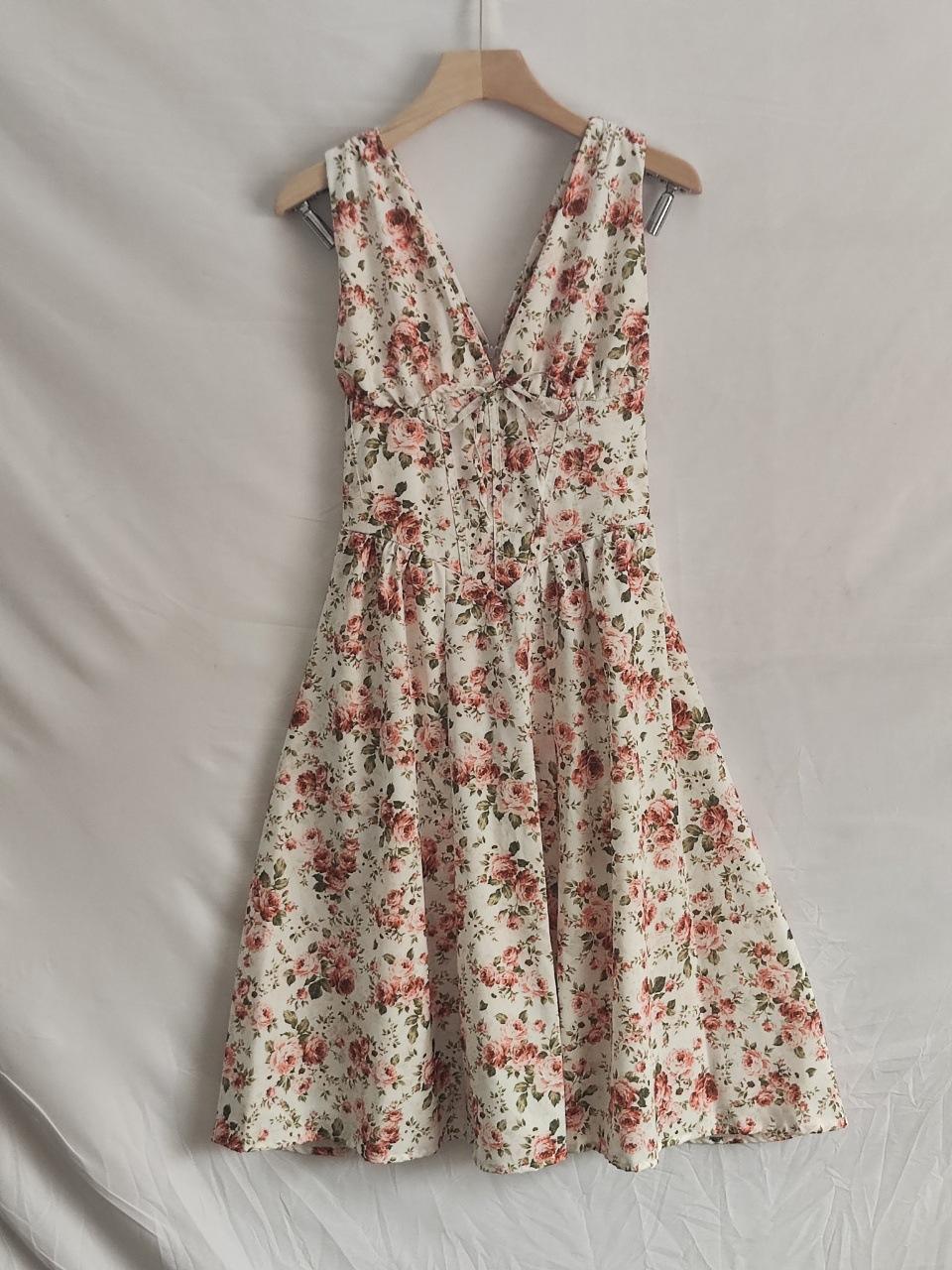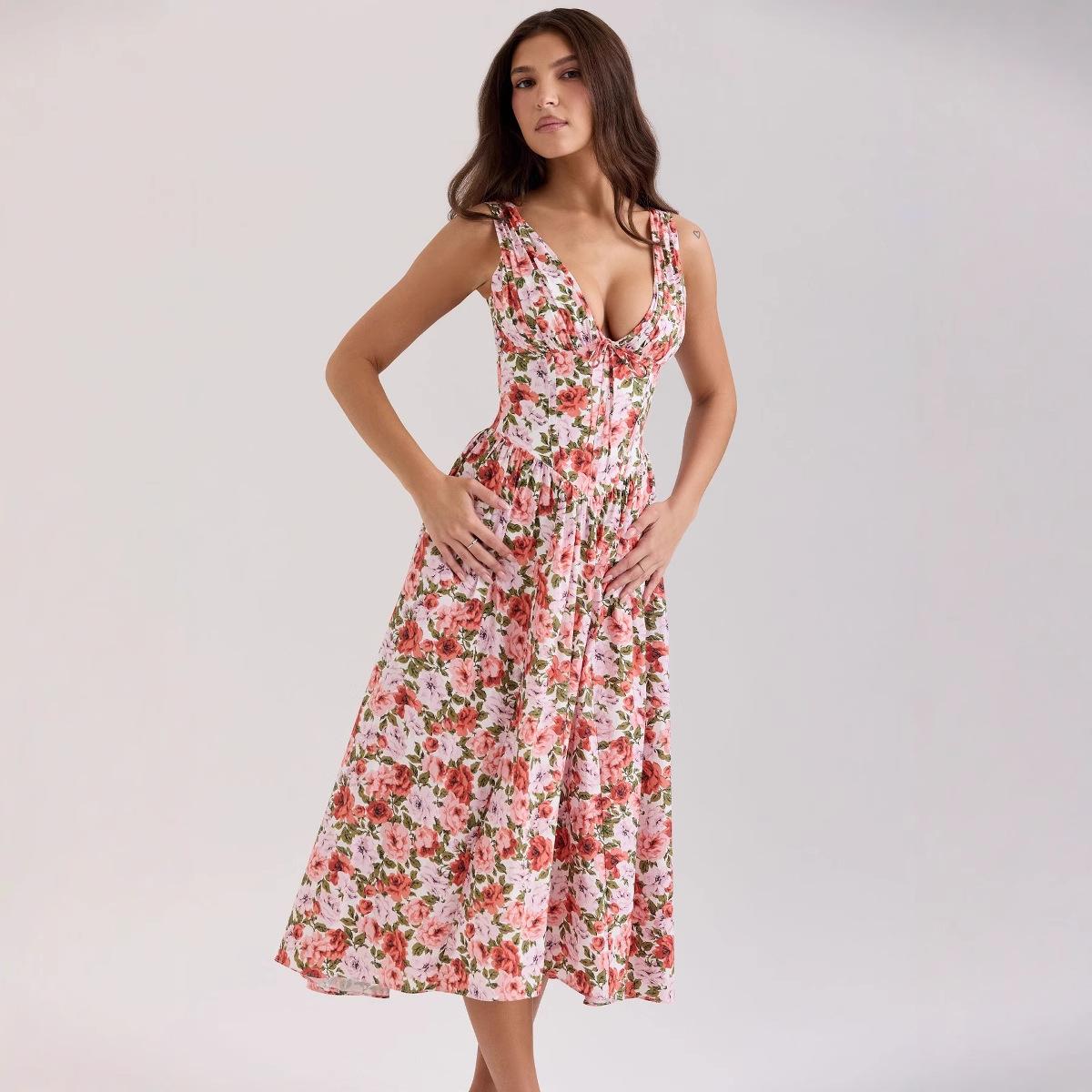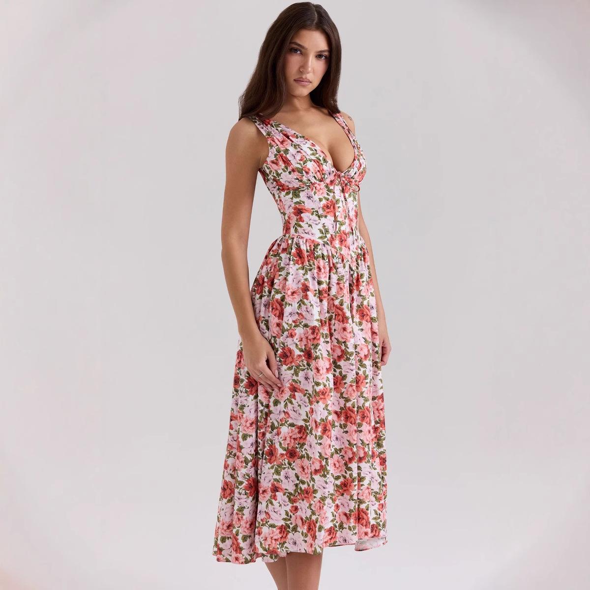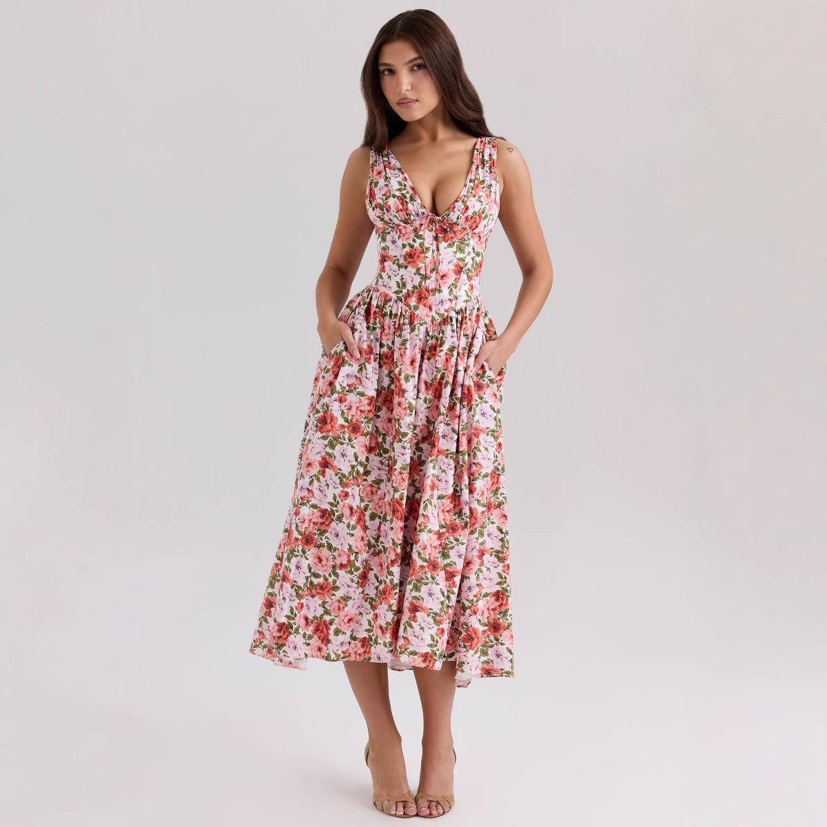 Europeo y Americano Transfronterizo 2025 Verano Fresco y Dulce Ajustado Tirantes Estampado Cuello en V Elegante Vestido de Fiesta para Mujer Venta al por Mayor