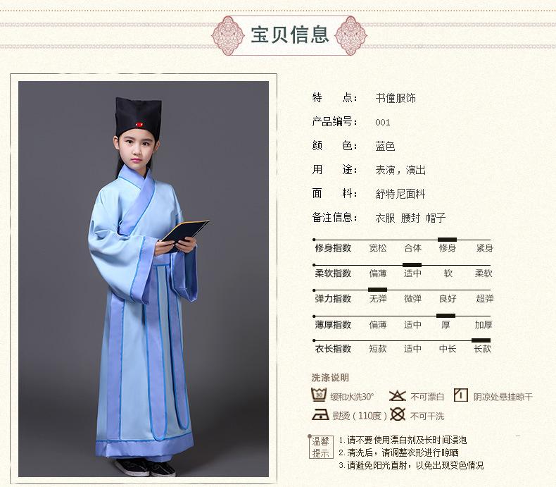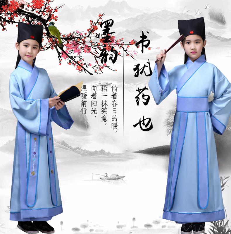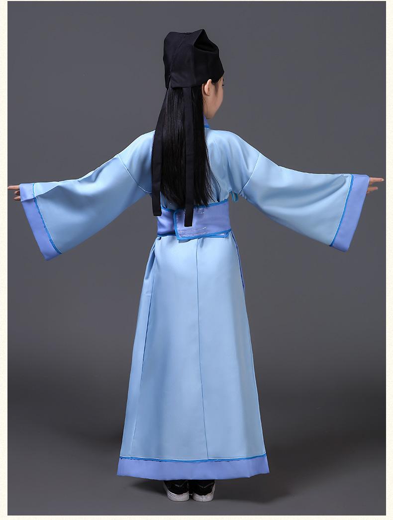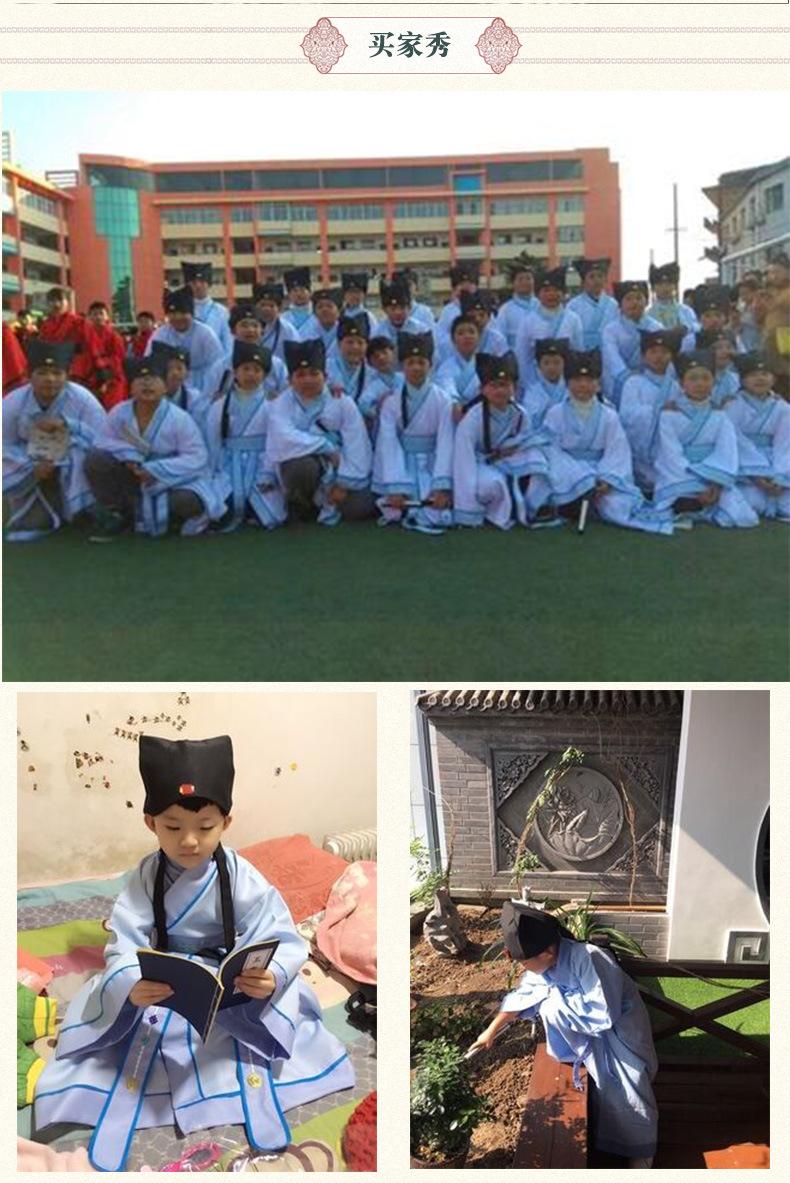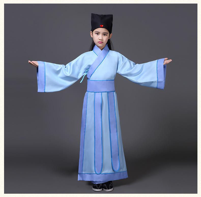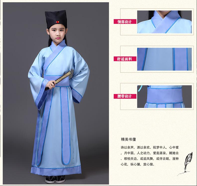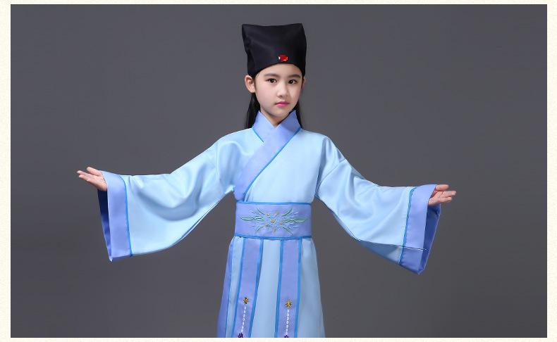 Traje de Actuación Tradicional Chino Hanfu Confuciano para Estudiantes para Niños al por Mayor en Existencia, Traje de Actuación Infantil Clásico de Tres Caracteres