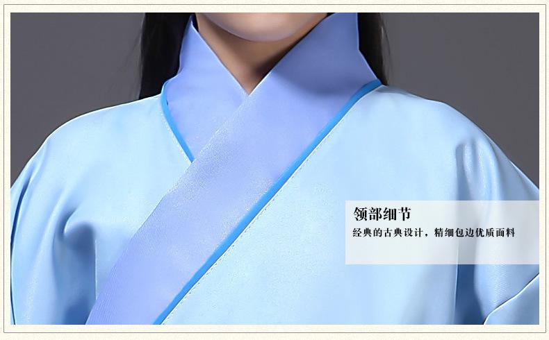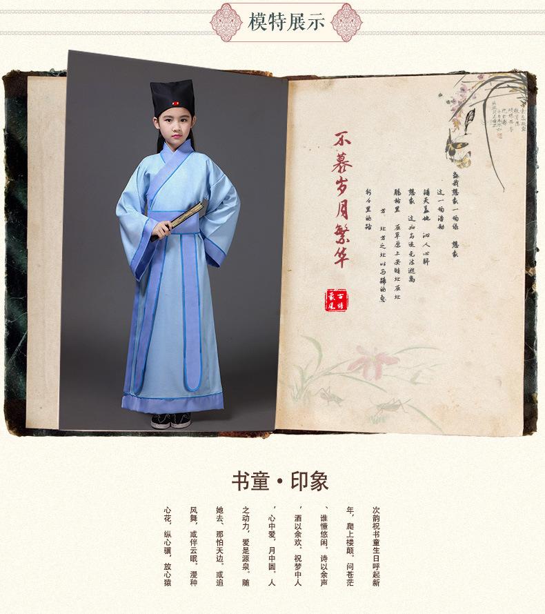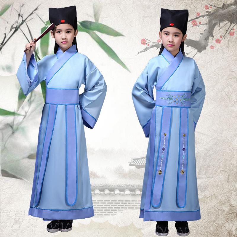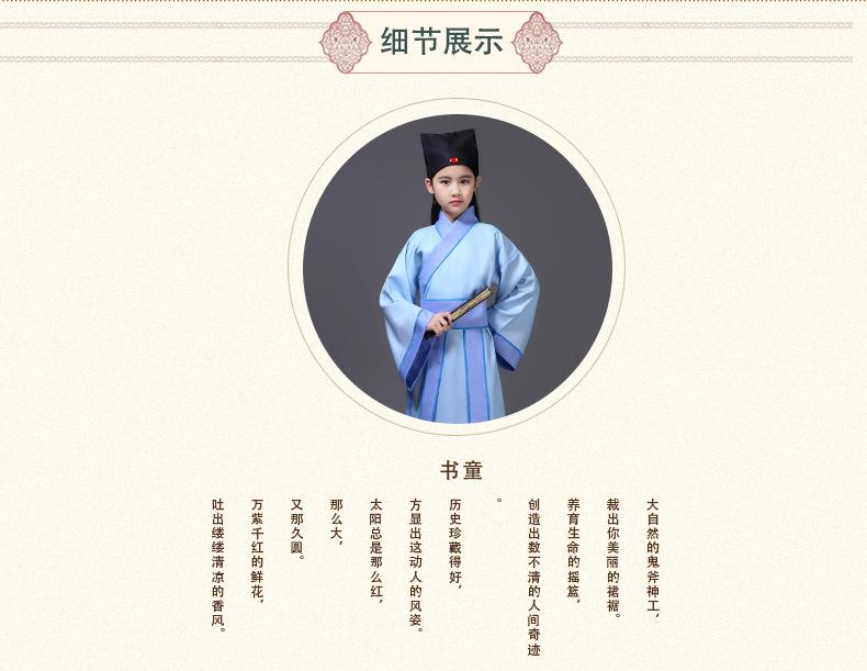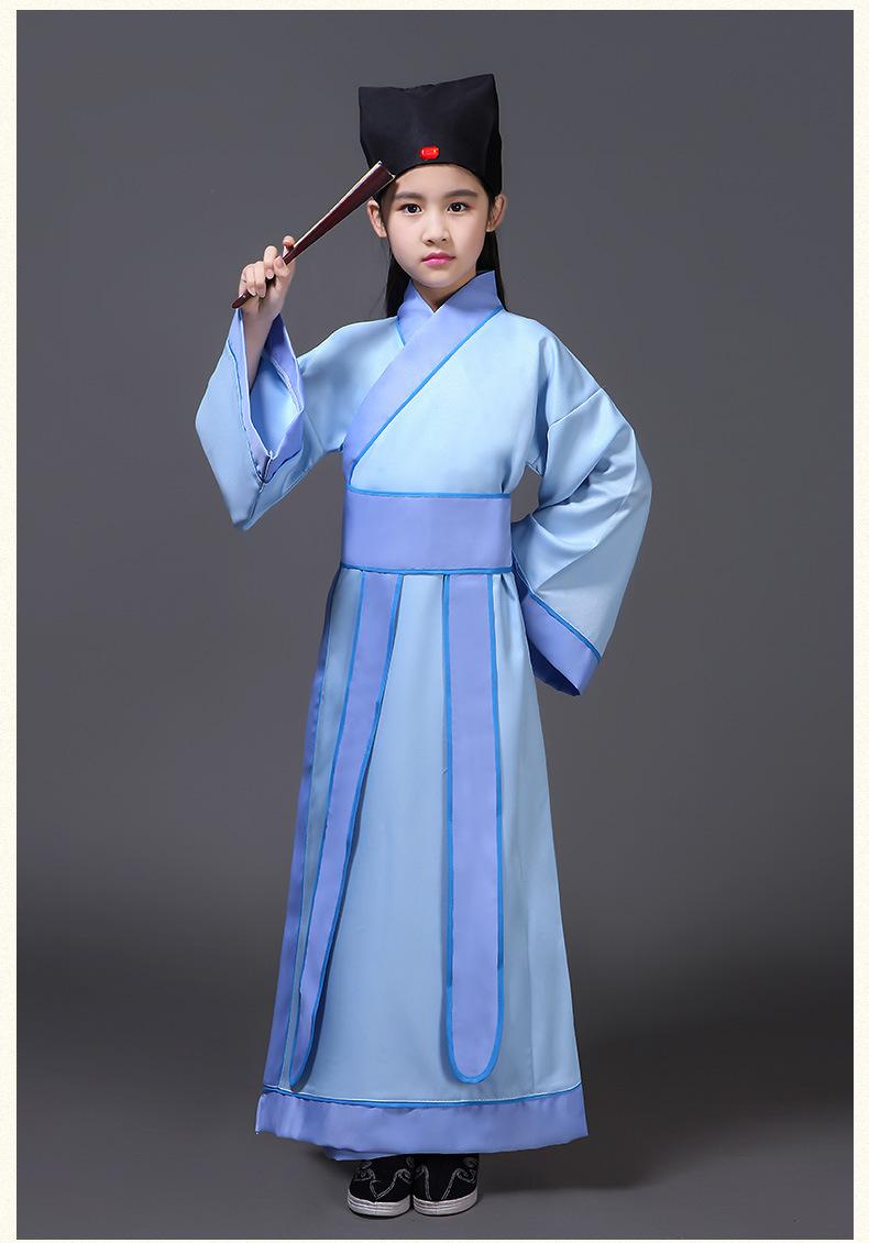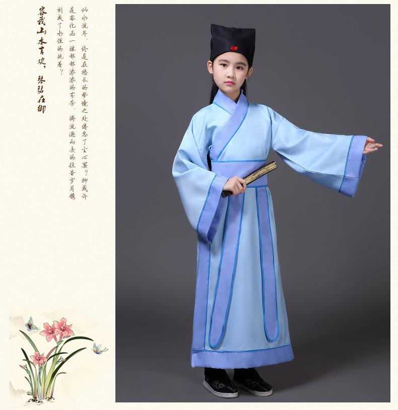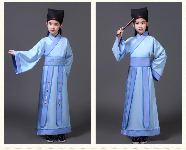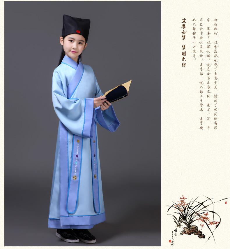 Traje de Actuación Tradicional Chino Hanfu Confuciano para Estudiantes para Niños al por Mayor en Existencia, Traje de Actuación Infantil Clásico de Tres Caracteres