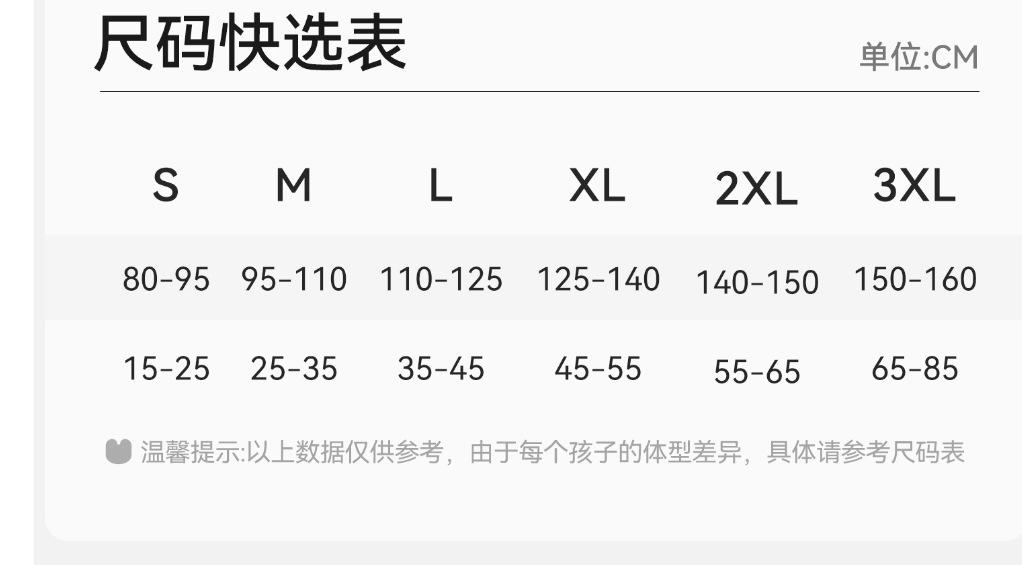 110cm, 120cm, 130cm, 140cm, 150cm, 160cm