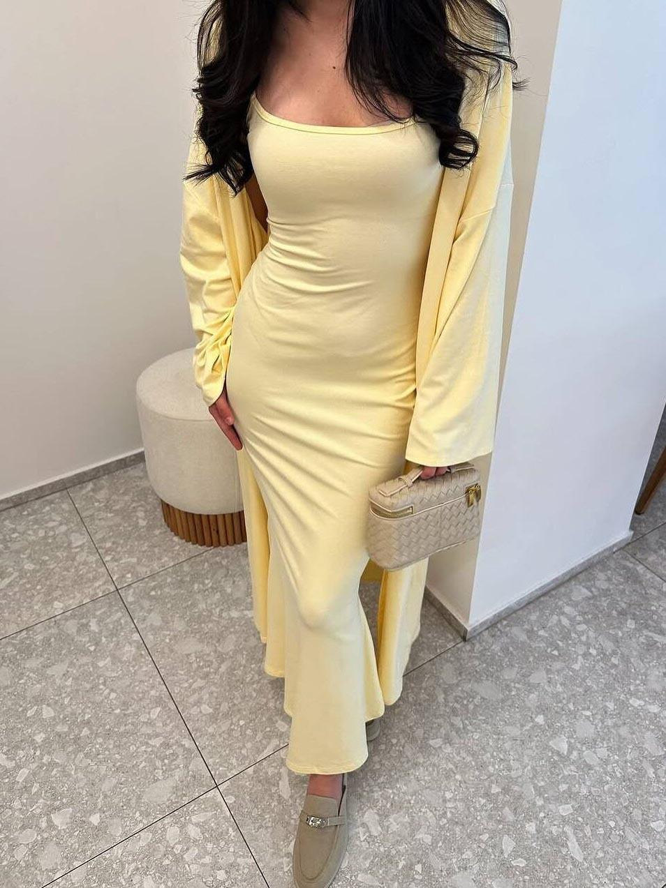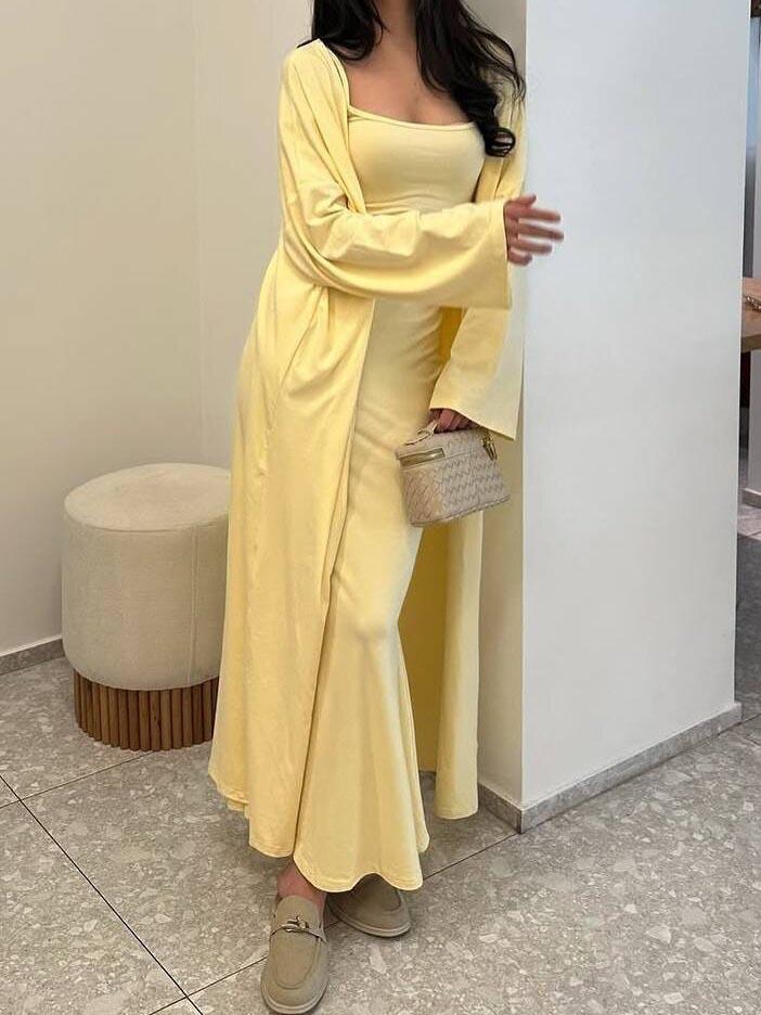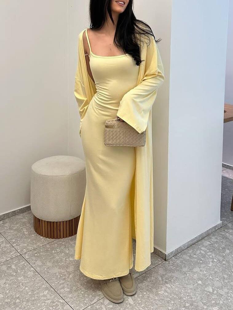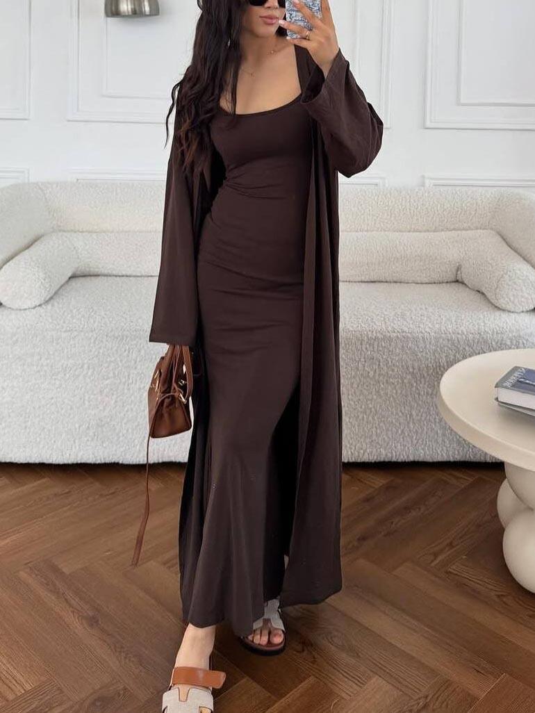 Vestido ajustado sin mangas con tirantes de estilo nuevo de moda transfronteriza, cárdigan largo exterior de color puro, conjunto de dos piezas
