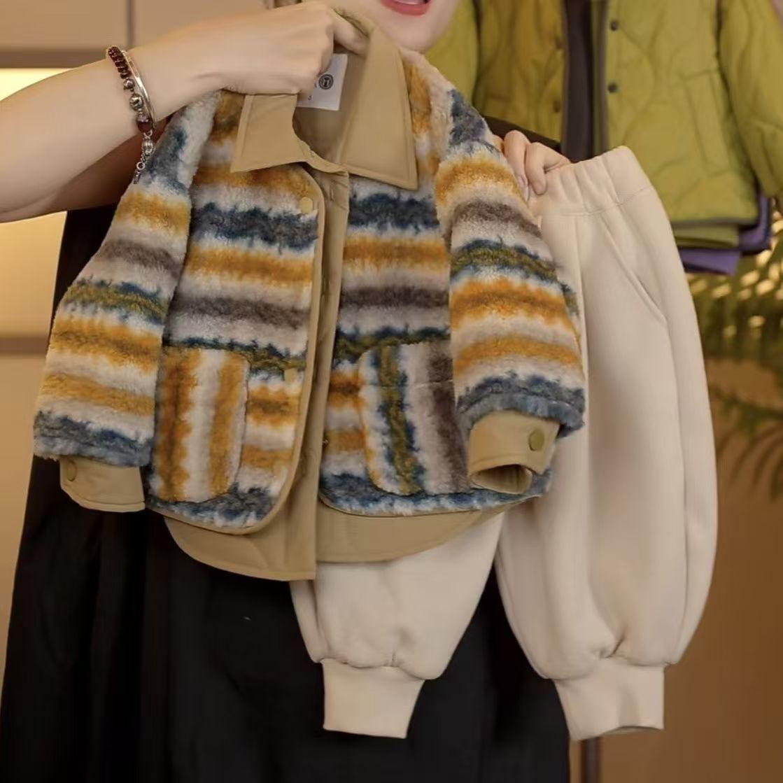 Traje de suéter de lana coreano para niños 2024 otoño e invierno nuevo para niños y niñas grueso cálido moderno abrigo falso de dos piezas