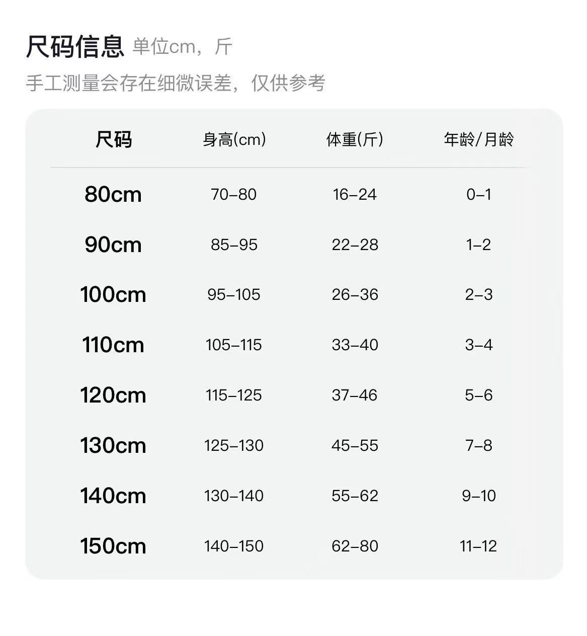 80cm, 90cm, 100cm, 110cm, 120cm, 130cm, 140cm