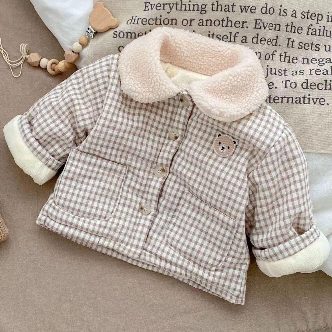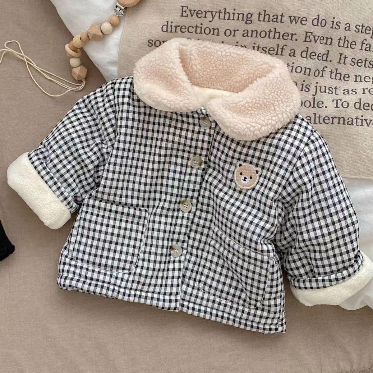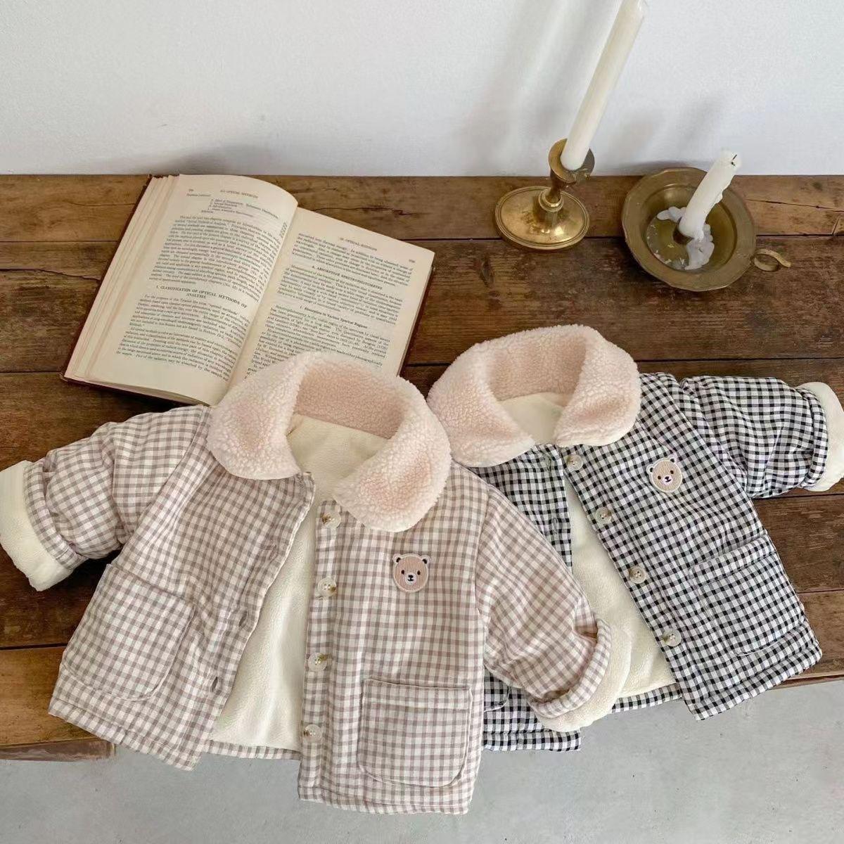 Abrigo coreano de invierno para bebé 2024 para niños y niñas, abrigo de bebé a cuadros de oso, acolchado de algodón cálido, chaqueta acolchada de algodón engrosada para niños