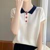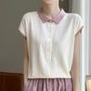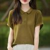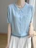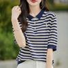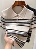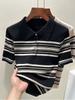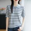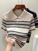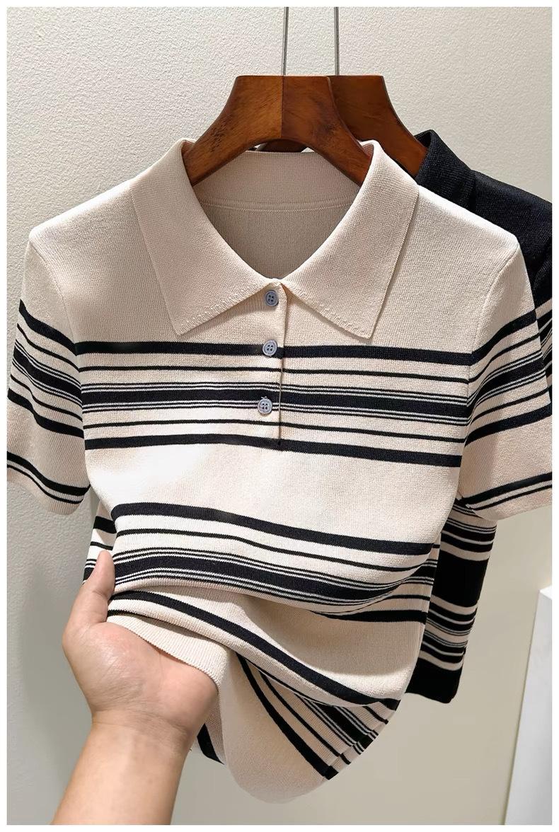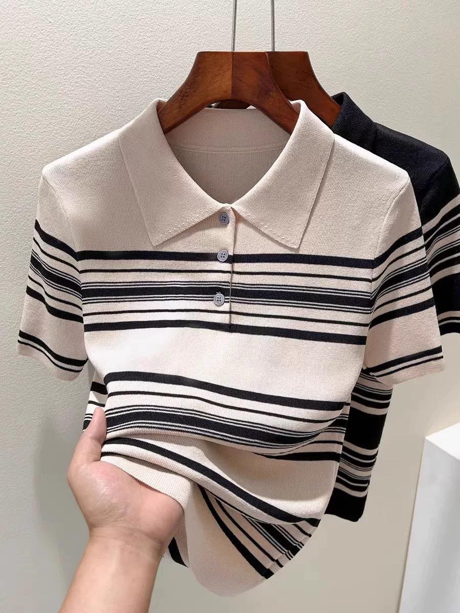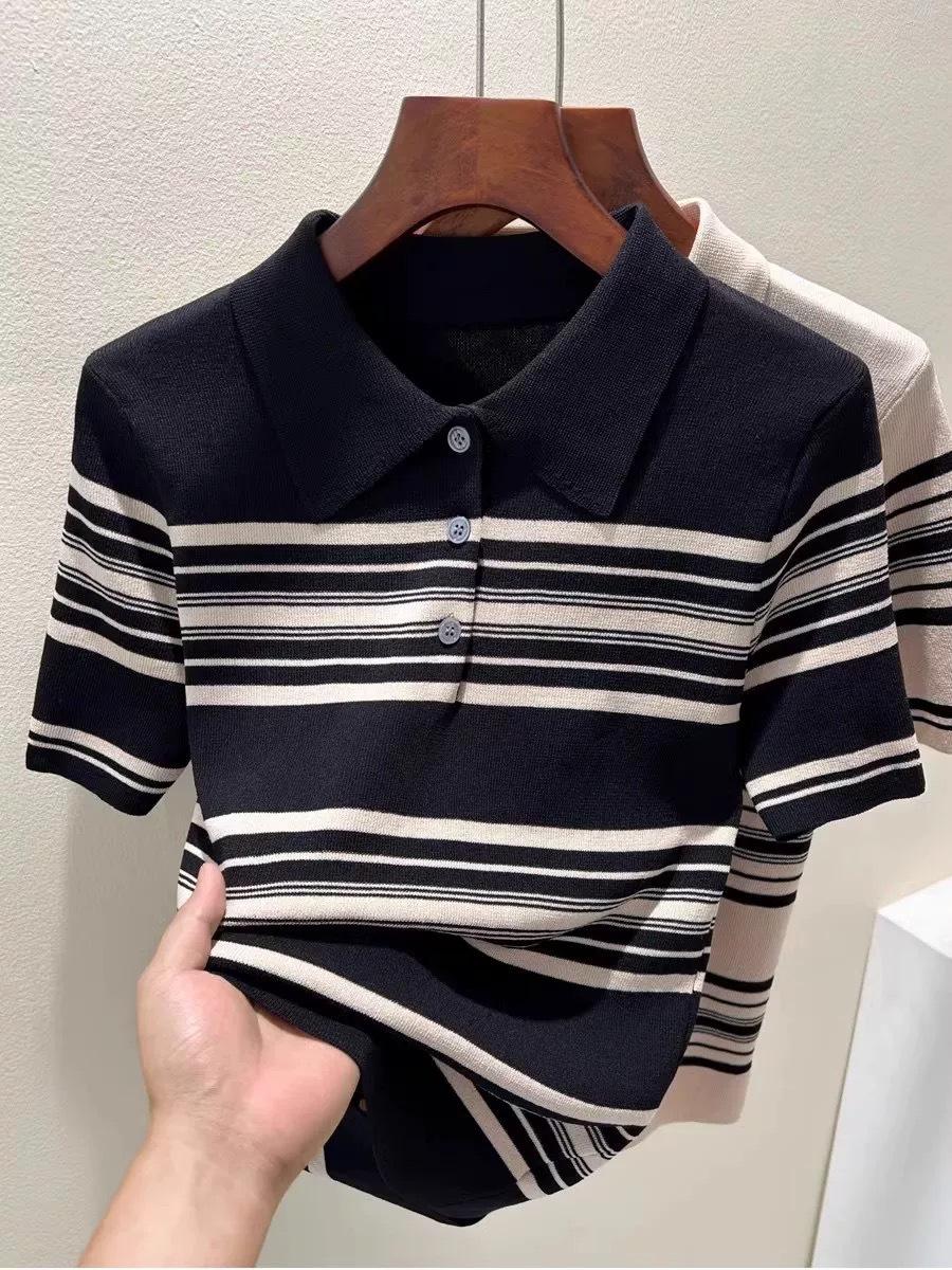 Polo de Verano Lyocell Tencel Medio Abotonado Cuello de Botón Manga Corta Rayado Tejido de Seda Helada Top de Hombro Francés para Mujer