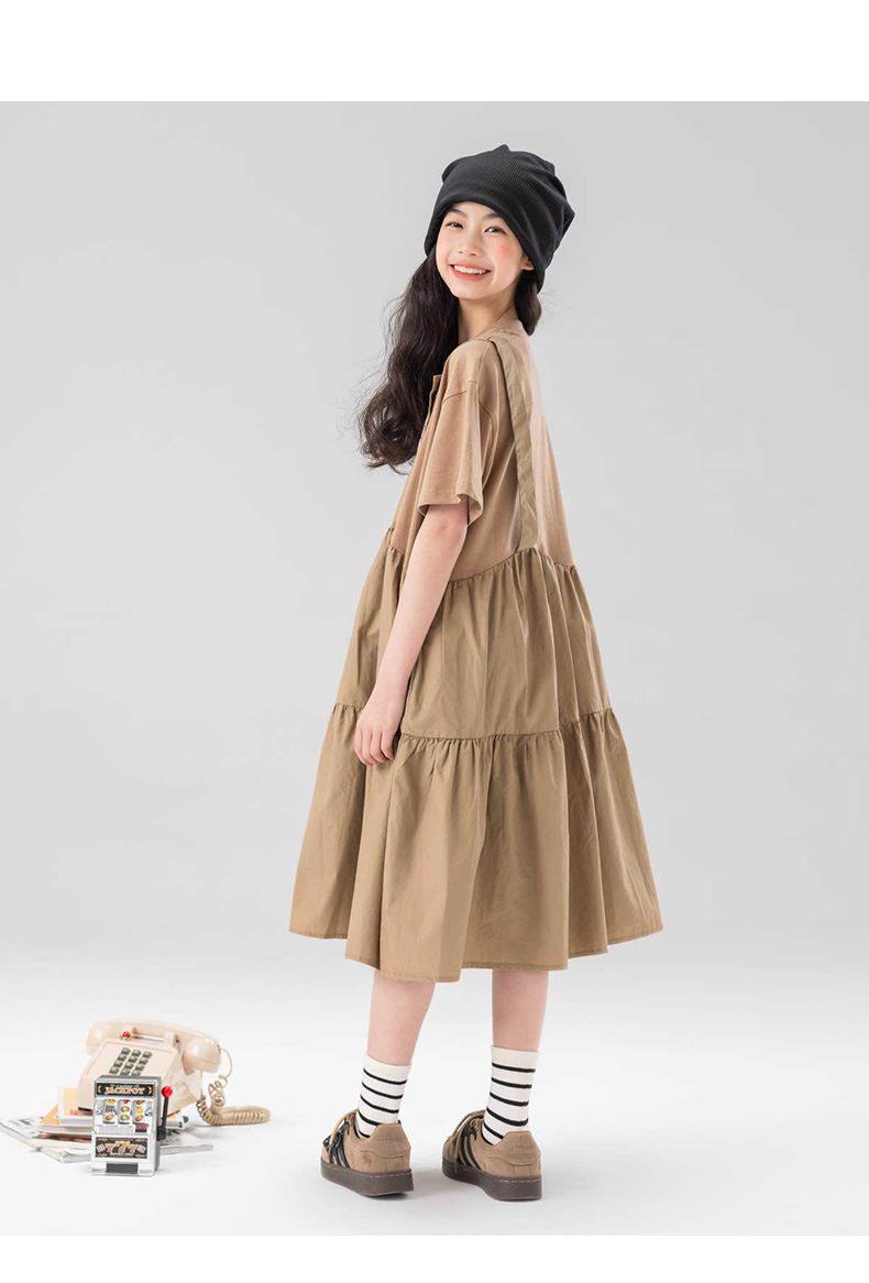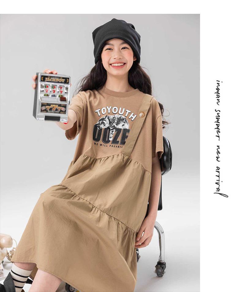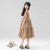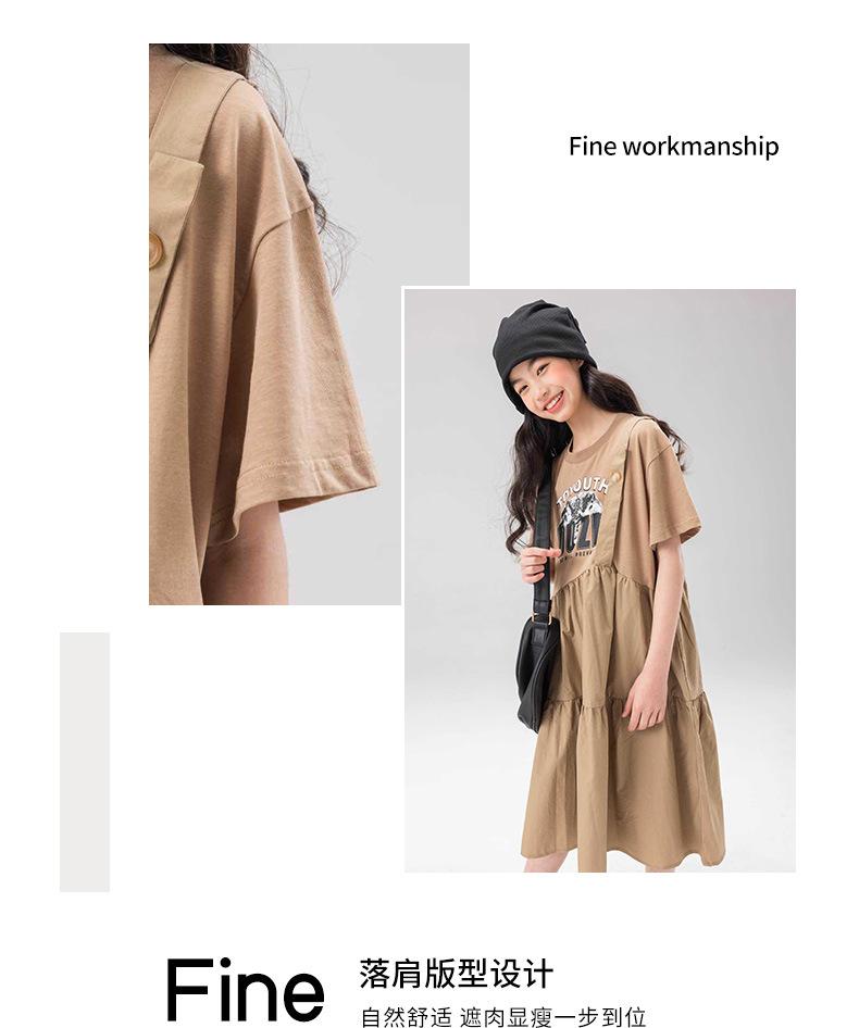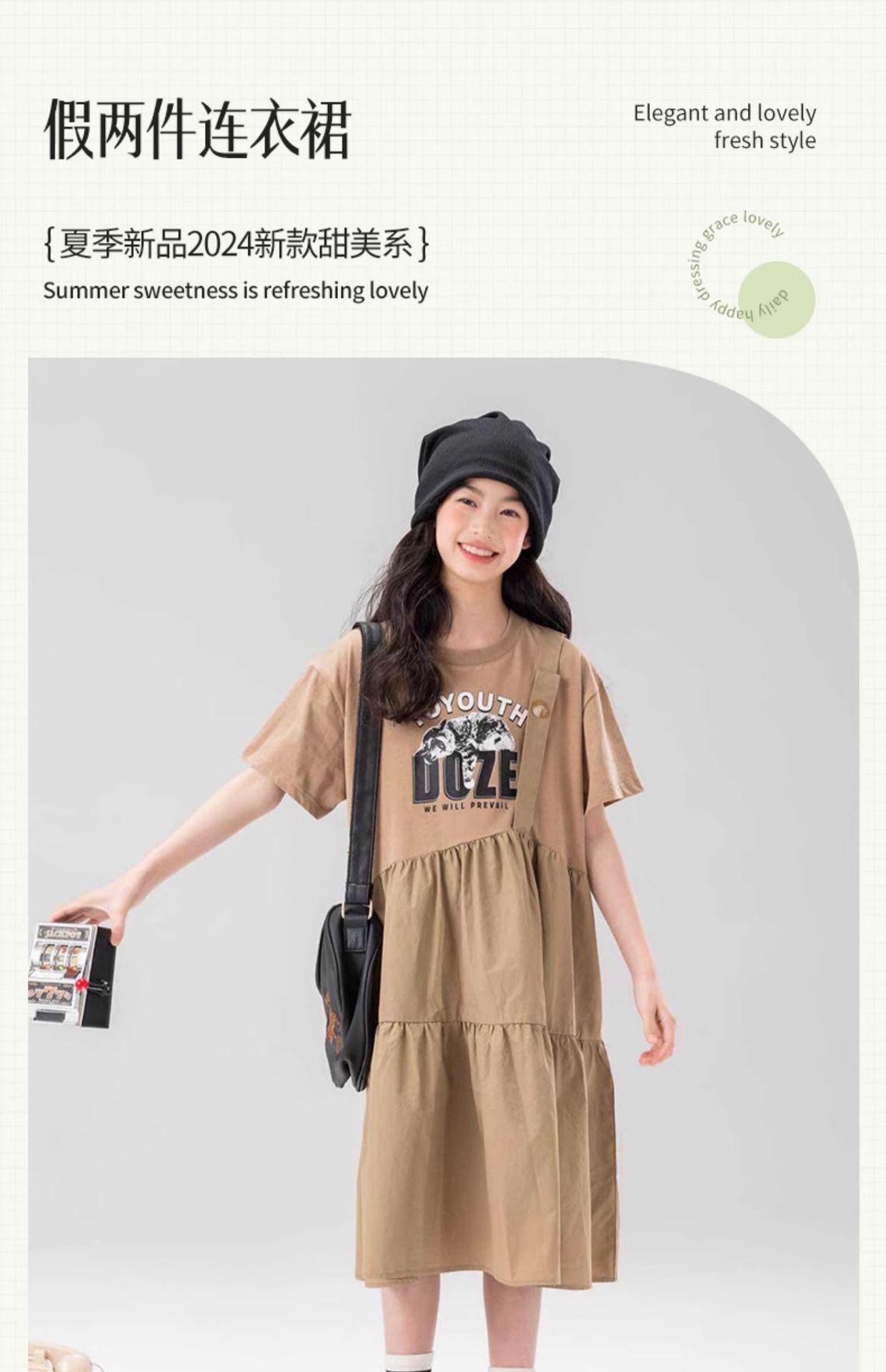 Vestido color café para niña, conjunto de verano, ropa infantil 2025 nuevo verano, vestido de niña grande a la moda, ropa infantil de dos piezas falsas