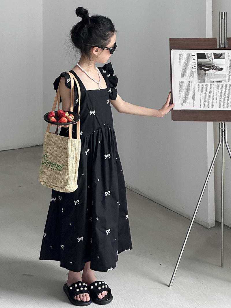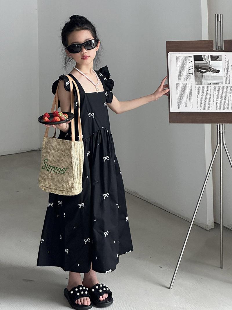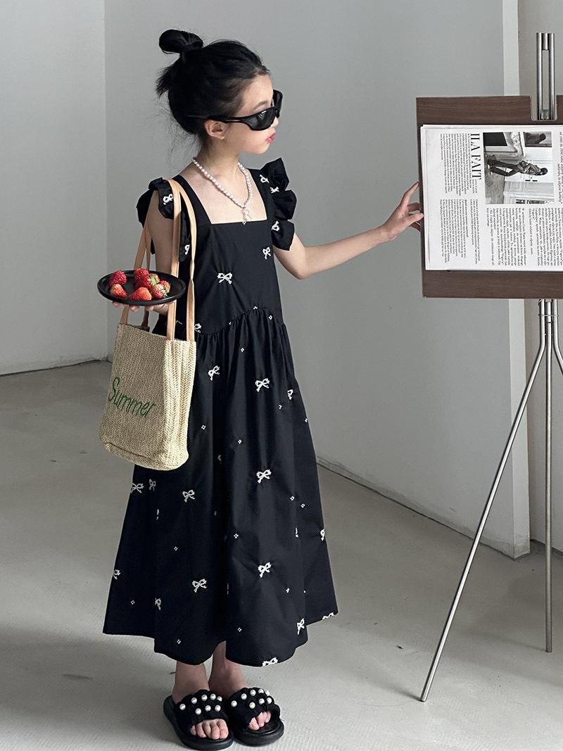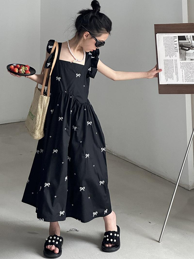 Vestido de Verano para Niñas 2024 Nueva Moda Vestido de Moda Estilo Coreano para Niñas con Lazo y Manga Corta con Vuelo