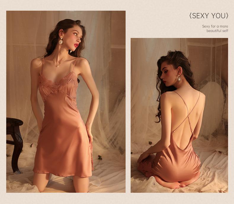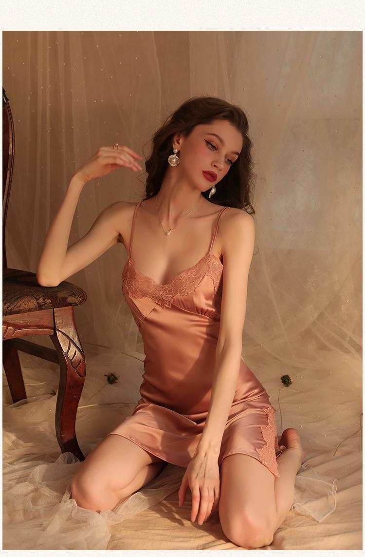 Pijama Sexy de Seda de Hielo para Mujer Nuevo Estilo Encaje Pura Lujuria Tentación Sexy Camisón con Tirantes Verano Camisón Fino con Almohadillas para el Busto