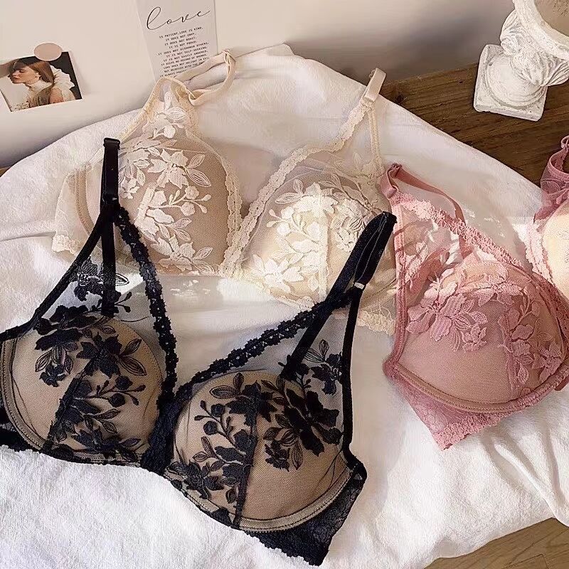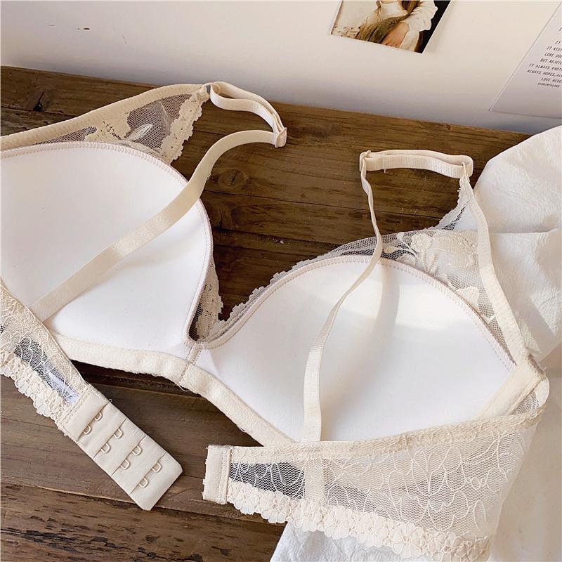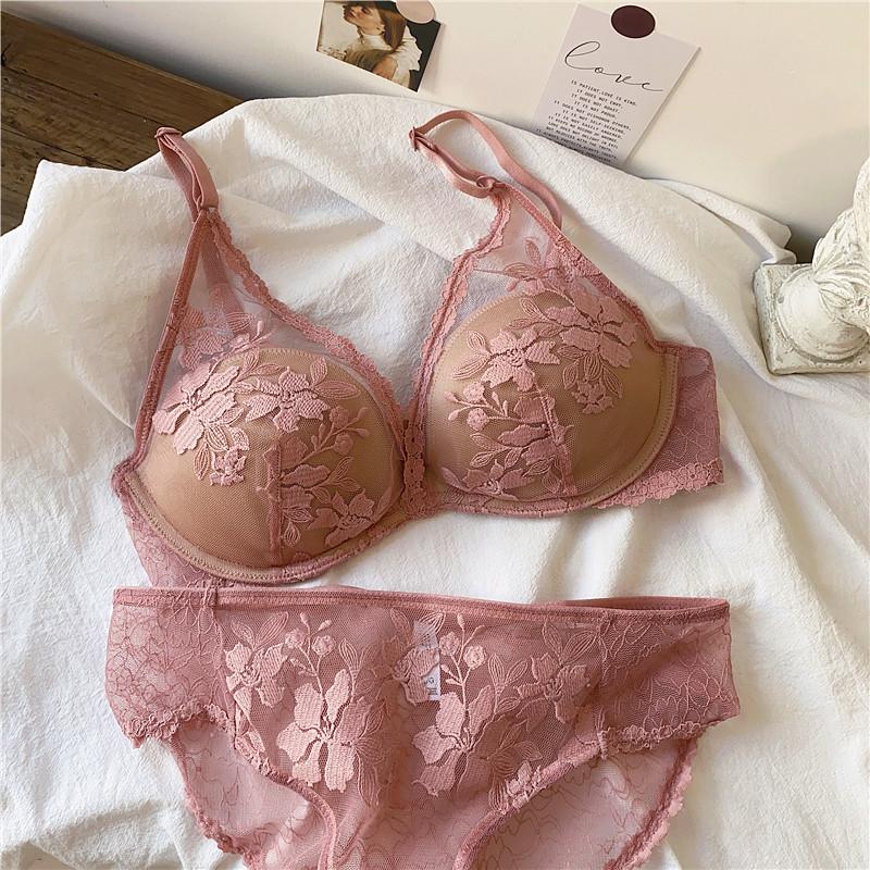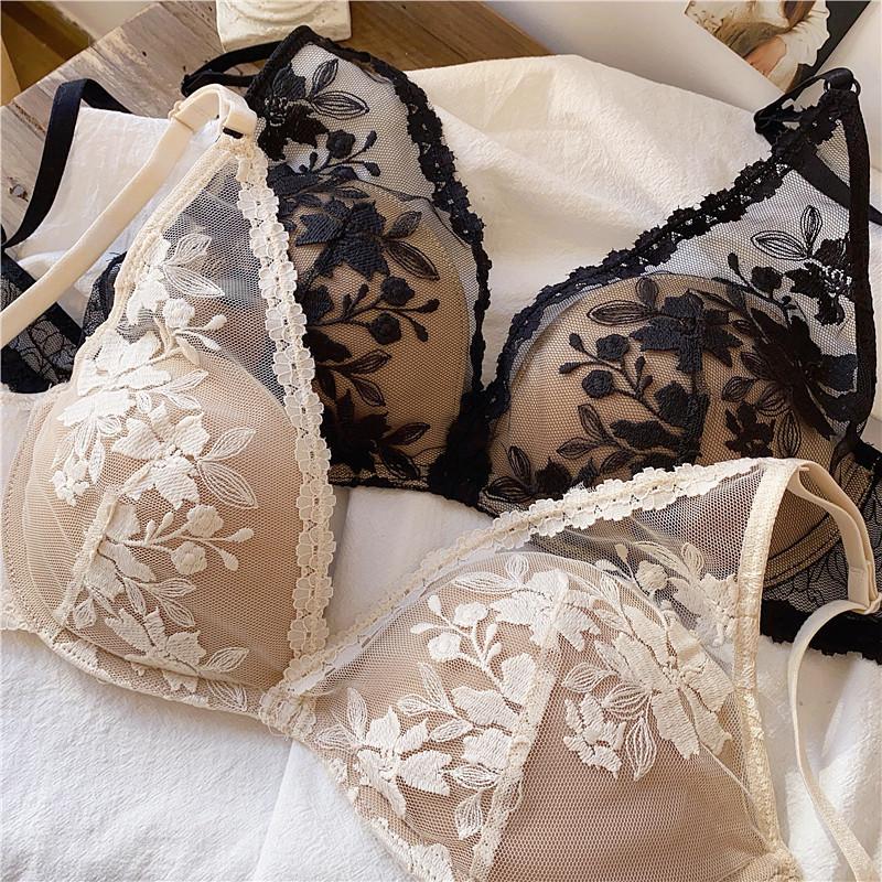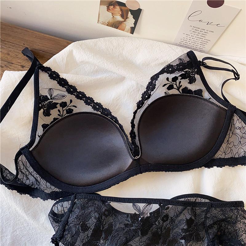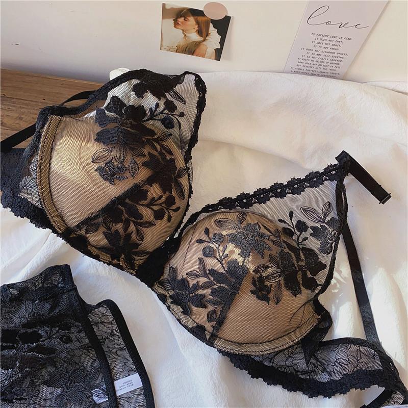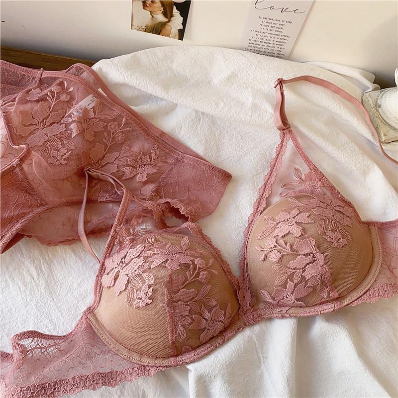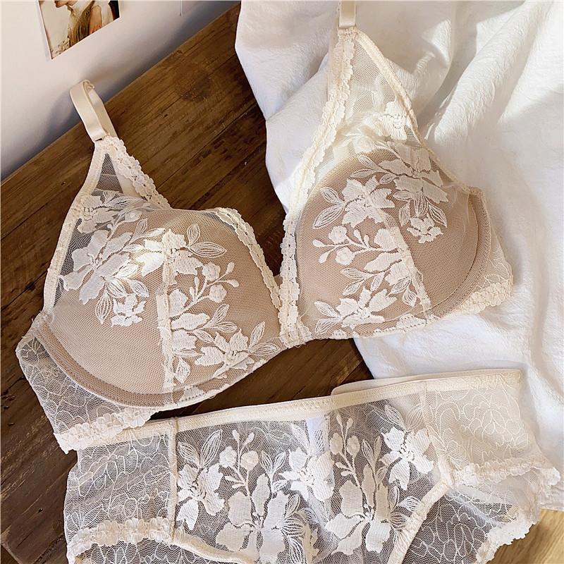 Nueva Lencería de Encaje Francés Bordado Flor Pequeña Clara Cómodo Sujetador para Busto Pequeño Sexy Set de Sujetador de Media Copa