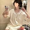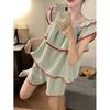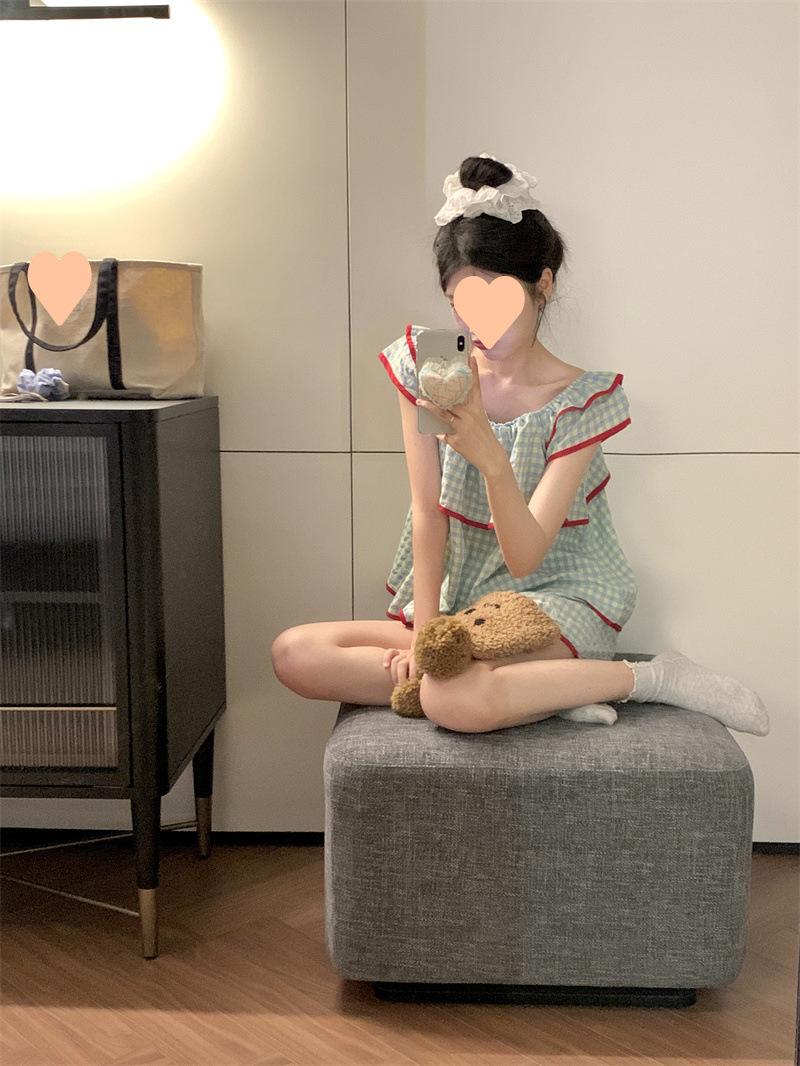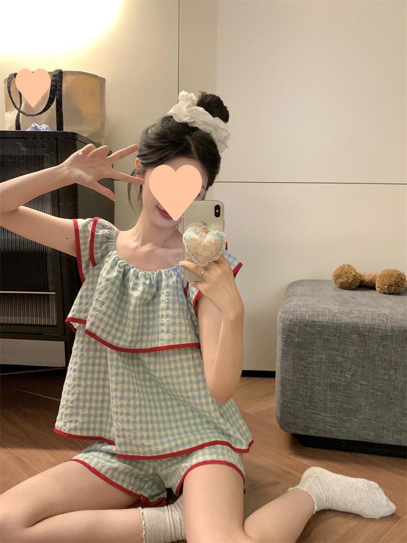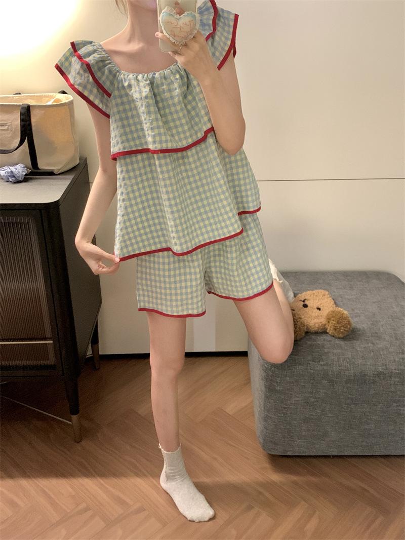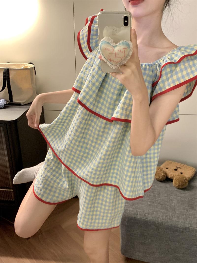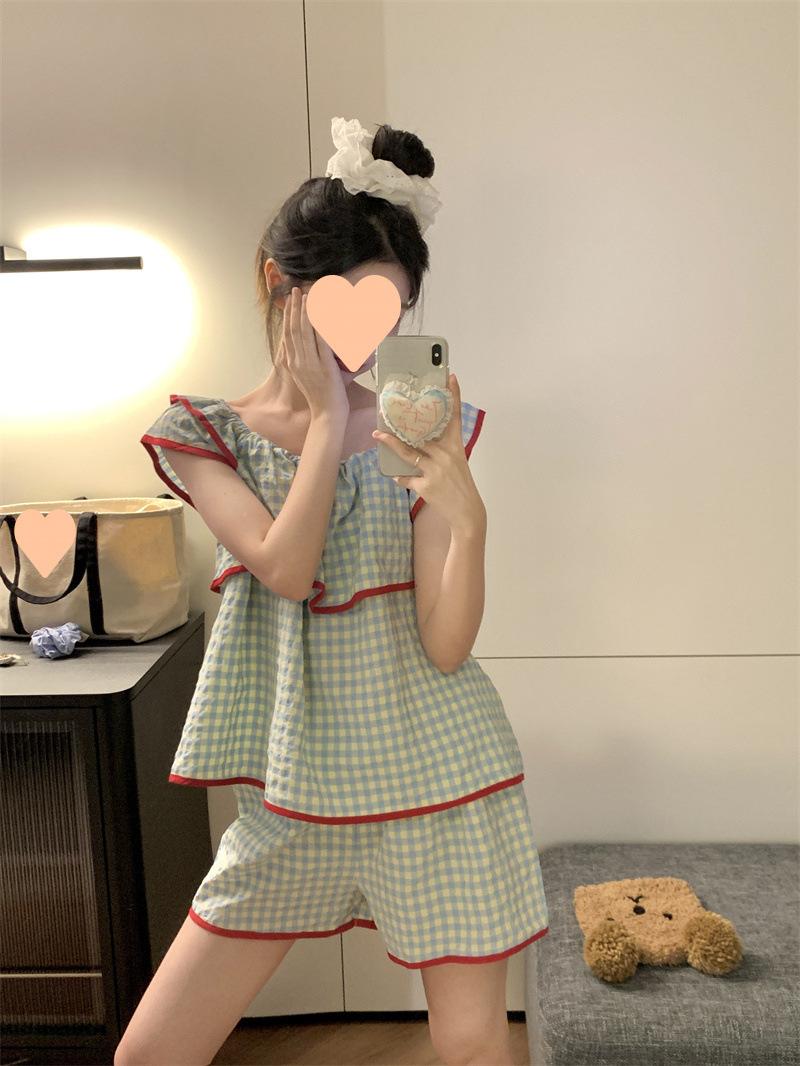 Pijamas Populares Ins para Mujer, Shorts de Manga Corta de Verano, Estilo Coreano Dulce con Volantes a Contraste y Cuadros, Conjunto de Ropa de Casa