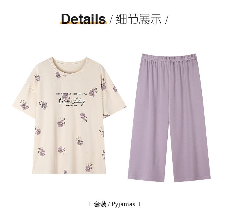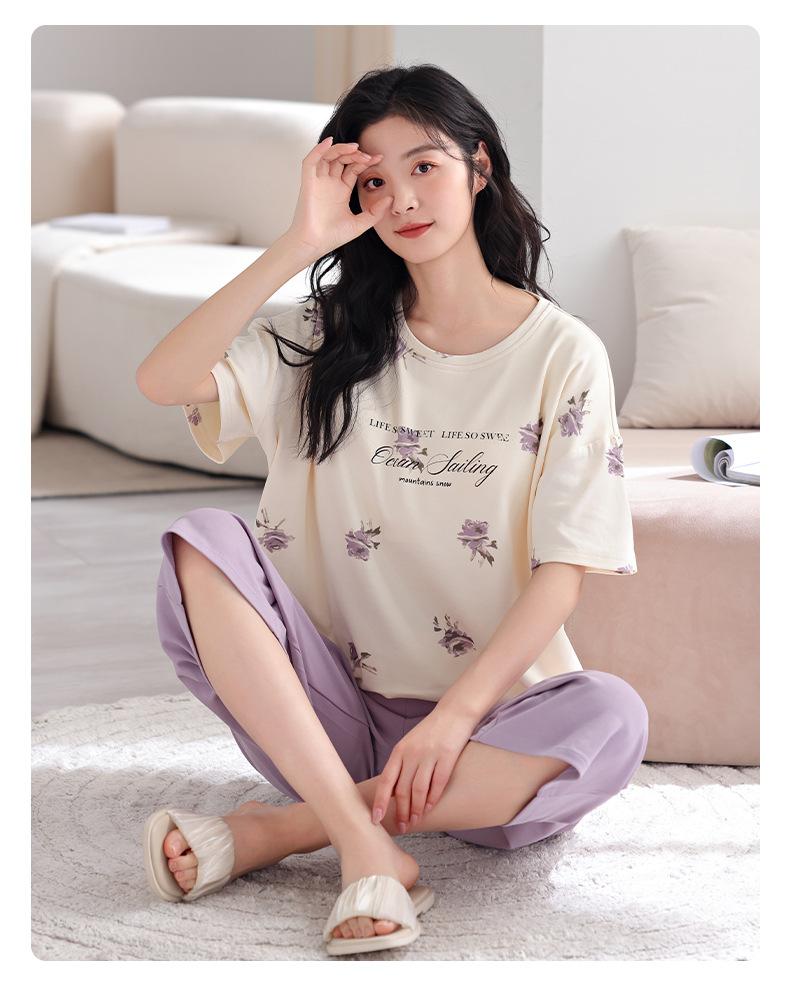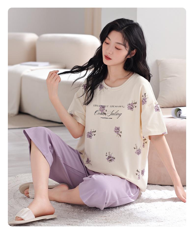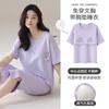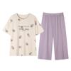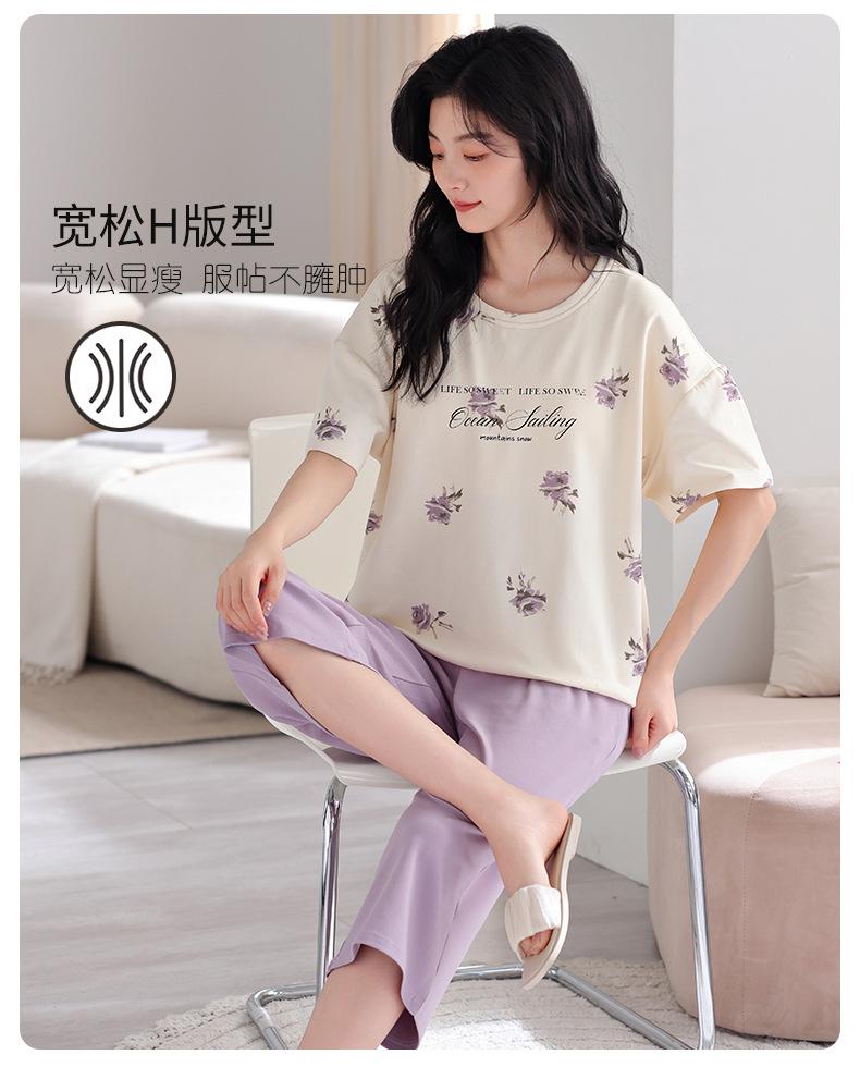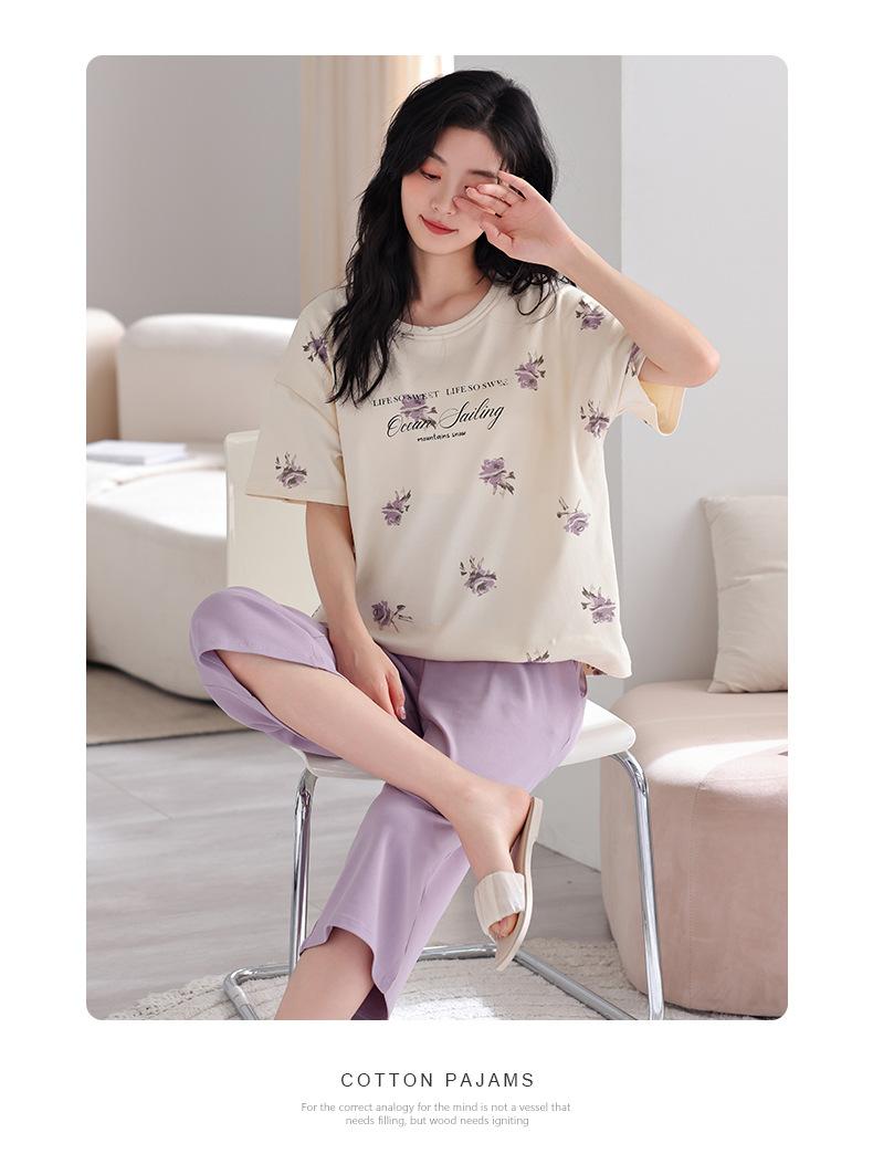Pijama para Mujer con Almohadillas en el Pecho, Pantalón Capri, Verano Algodón Puro Manga Corta Fino Casual Cuello Redondo Conjunto para Estar en Casa Que se Puede Usar Afuera