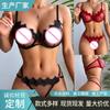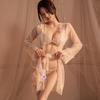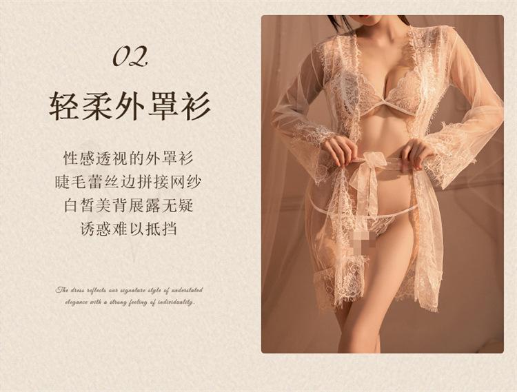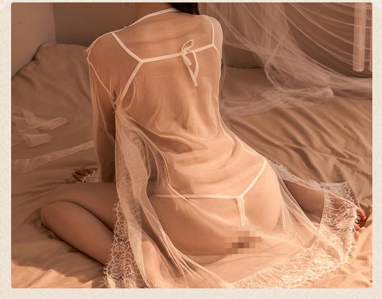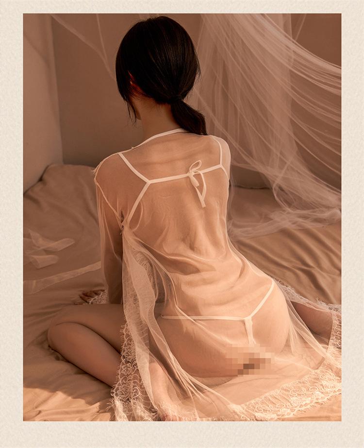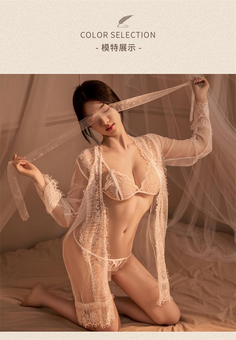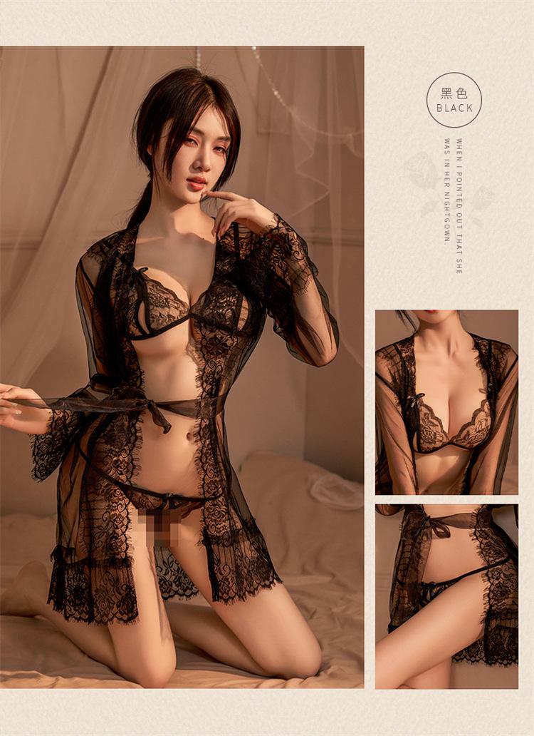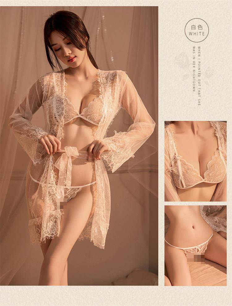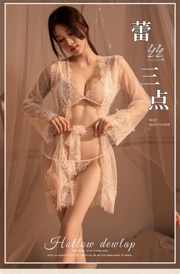 Nuevo Vestido Sexy de Encaje de Malla para Dama Perspectiva Ropa para Dormir Abrigo Abierto Caliente Conjunto de Ropa Interior de Tres Puntos