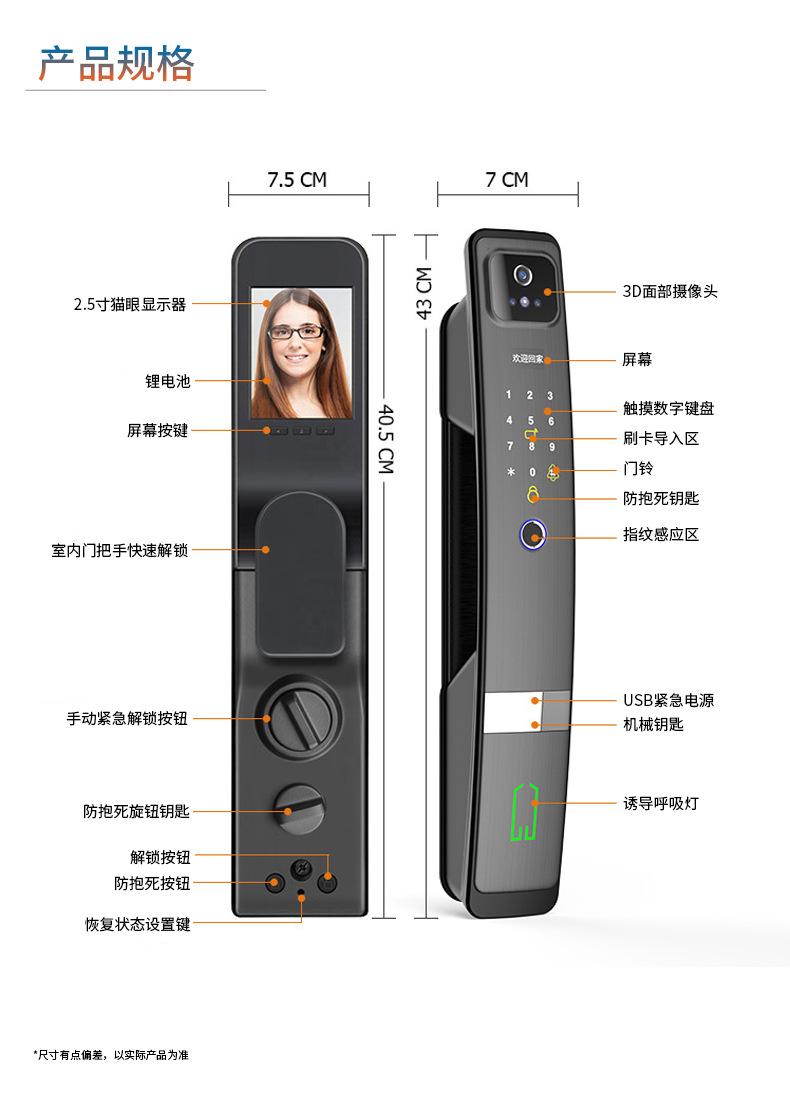 Fingerprint, Password, With key, visible cat's eye, face recognition, Remote Unlock