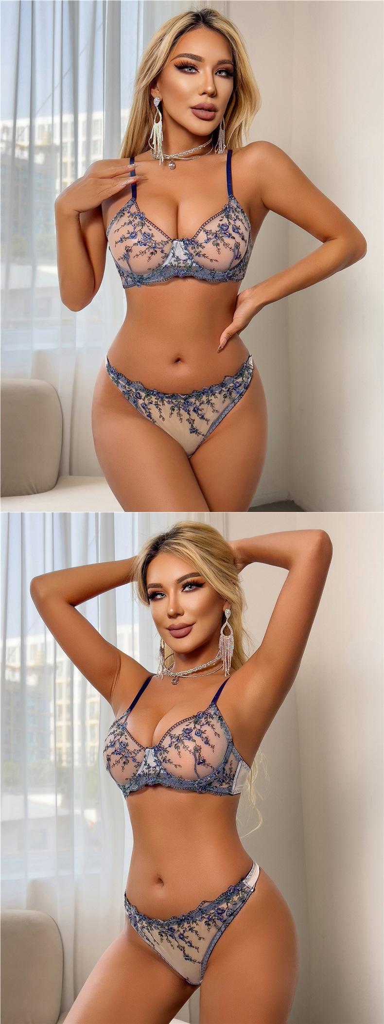 Nuevo Traje Sexy Europeo y Americano Transfronterizo Pequeño Fresco Floral Sexy Transparente Bordado Aro de Acero Push-Up