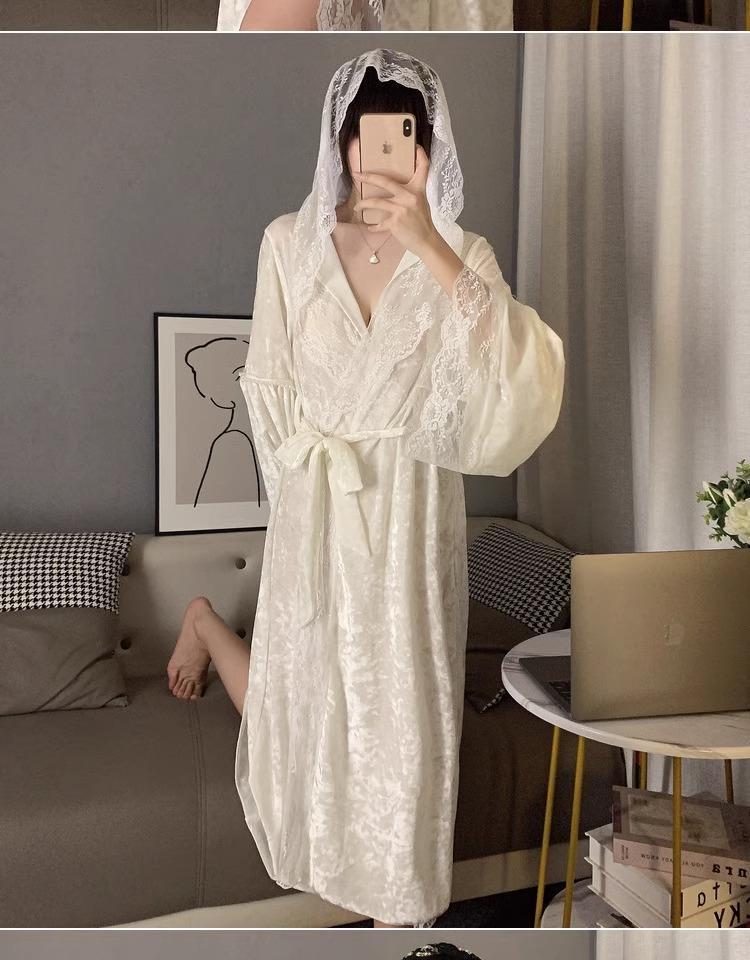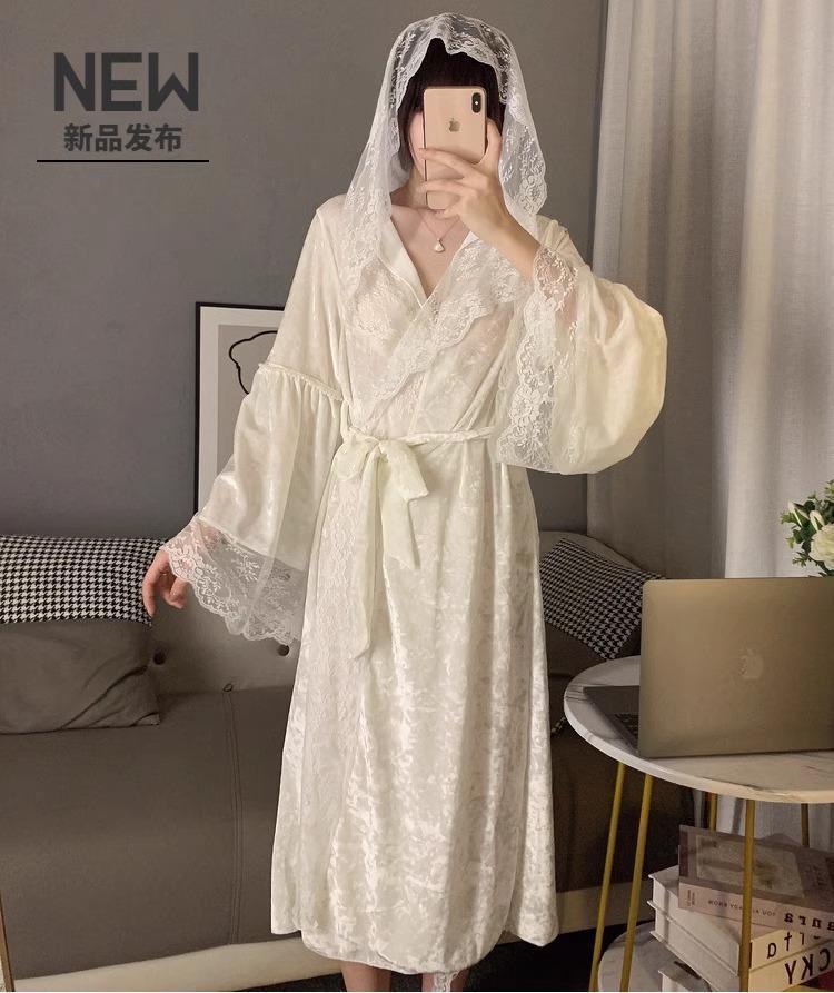 Pijamas para Mujer en Otoño e Invierno Manga Larga Camisón Sexy Largo con Capucha Encaje Estilo Palacio Puro Bata Primavera y Otoño Ropa para el Hogar