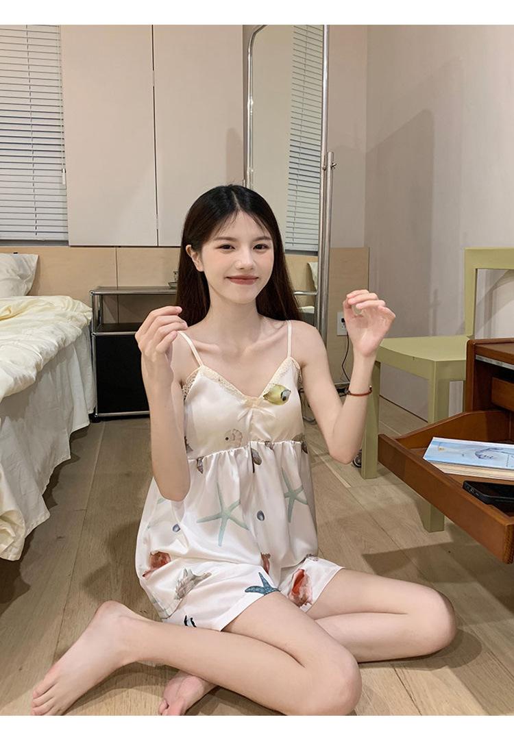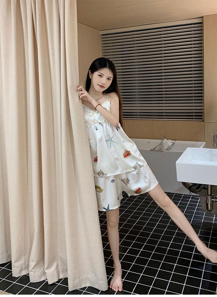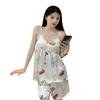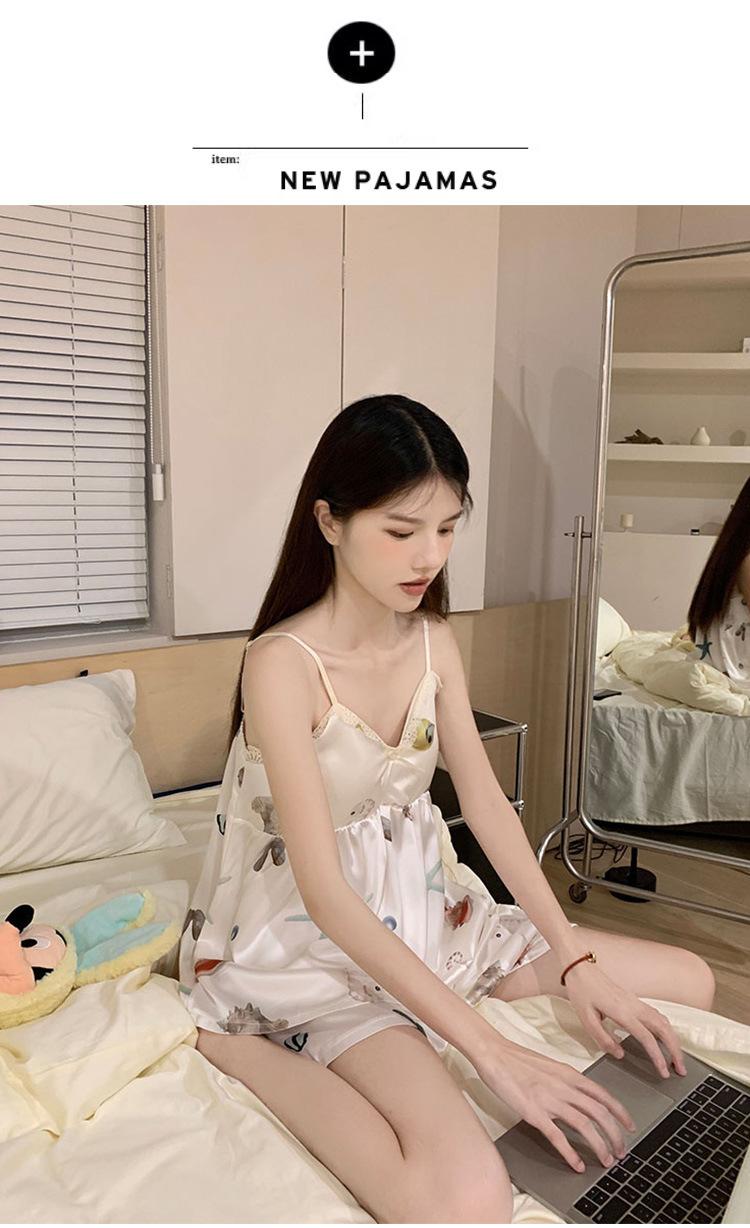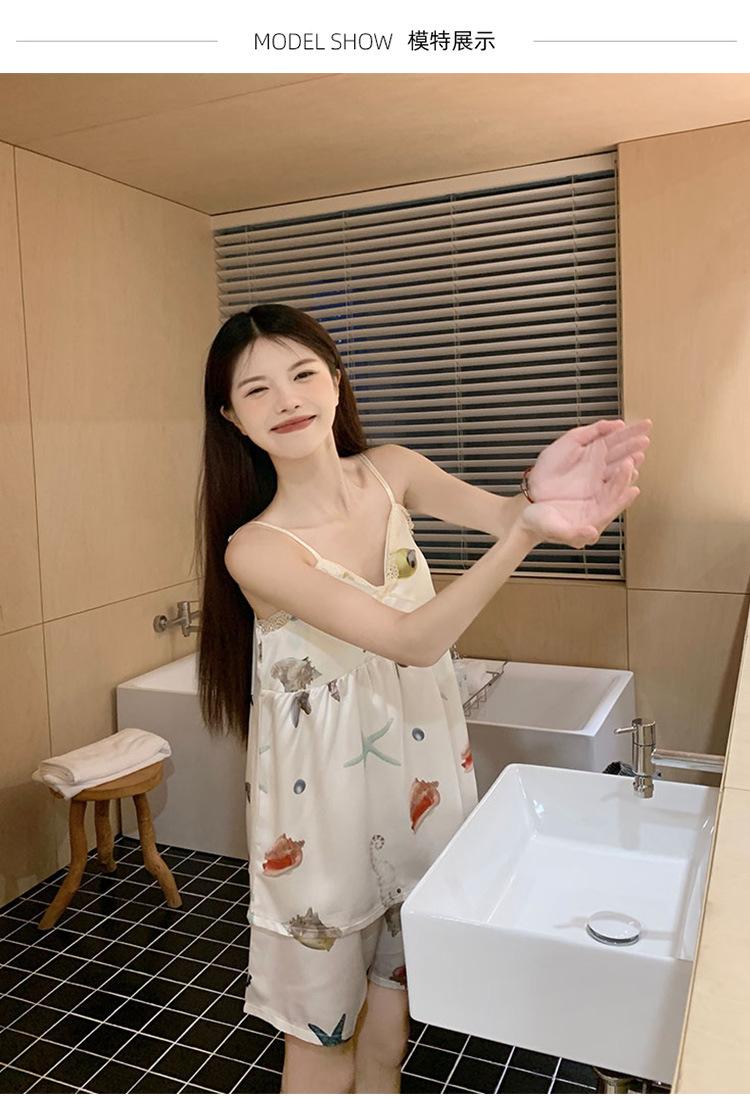 Pijama de Seda de Hielo para Mujer Verano Delgada Sexy Tirantes Shorts Conjunto de Dos Piezas Dulce Femenino Estampado Conjunto para Estar en Casa