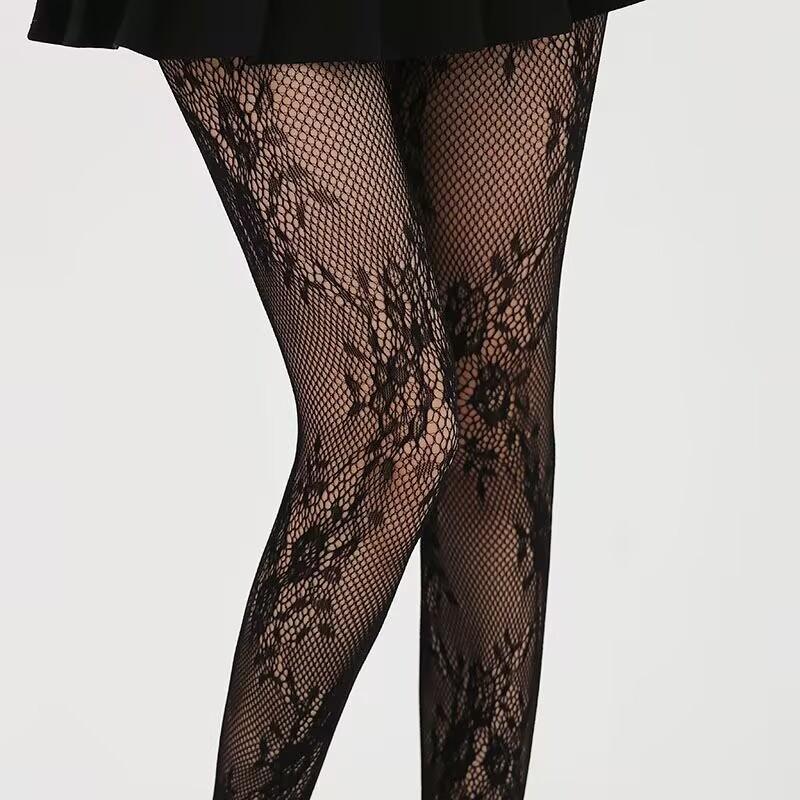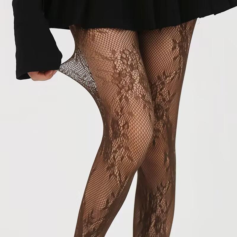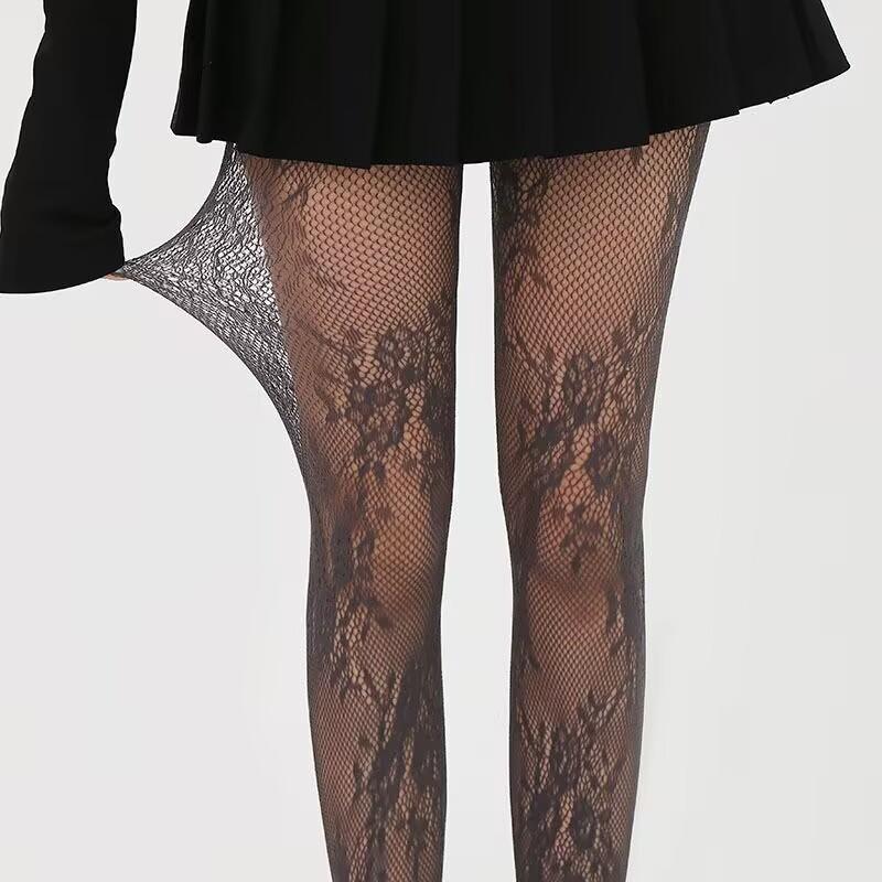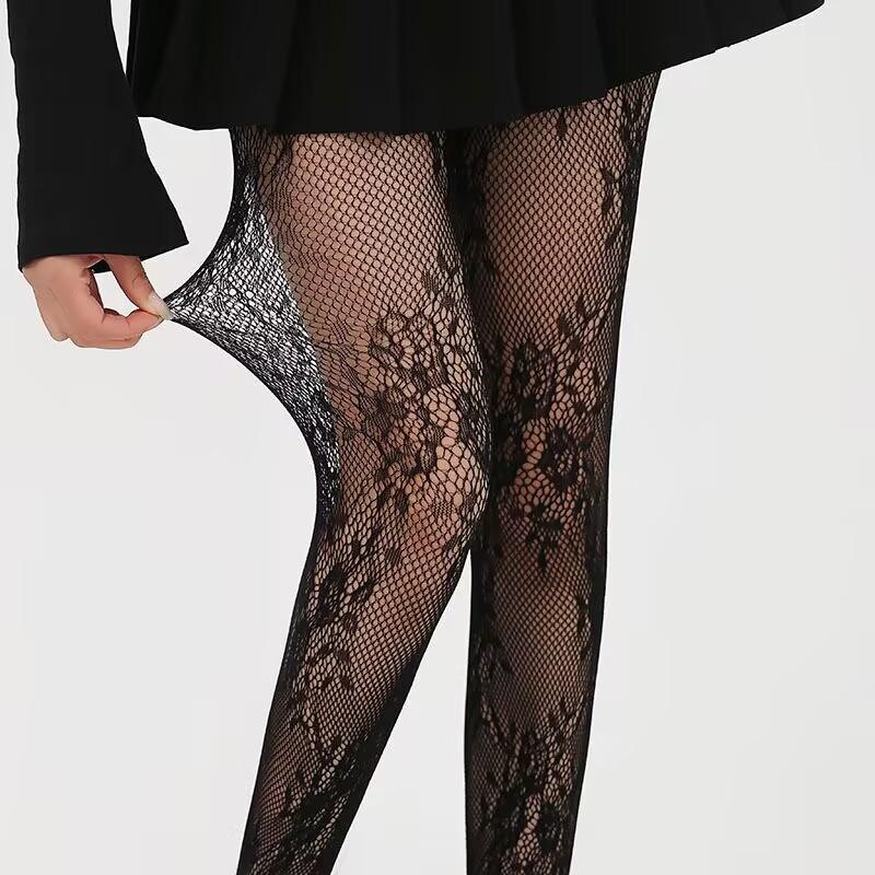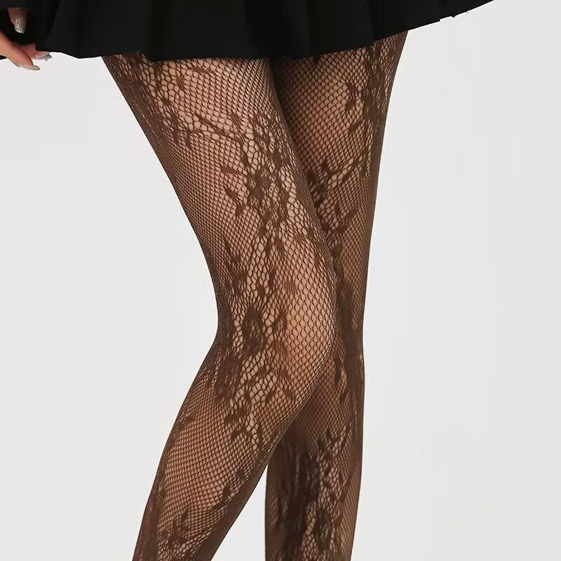 Medias Retro Caladas de Encaje Floral Sexy Jacquard Y2K de Red Negras Sexy Antidesgarros para Mujer