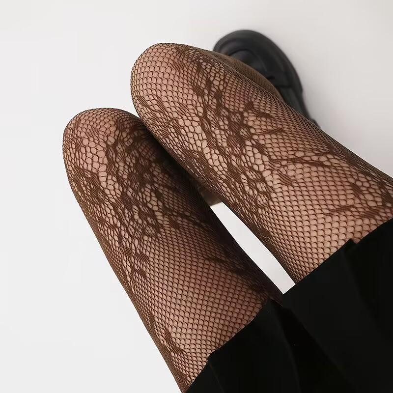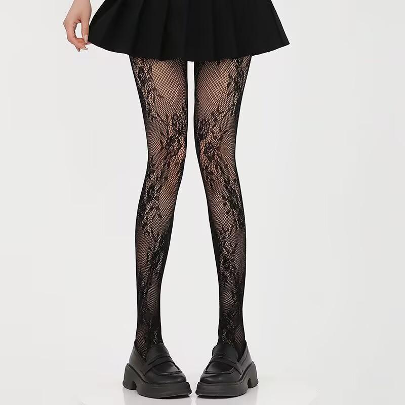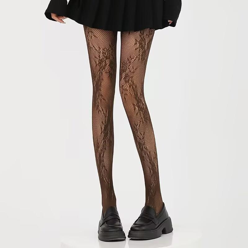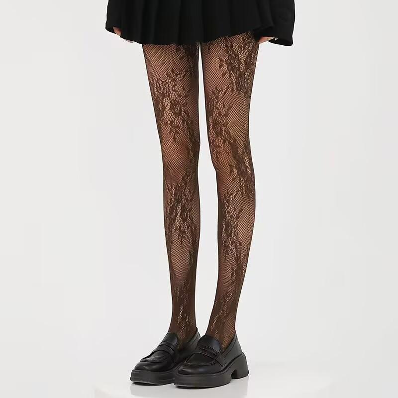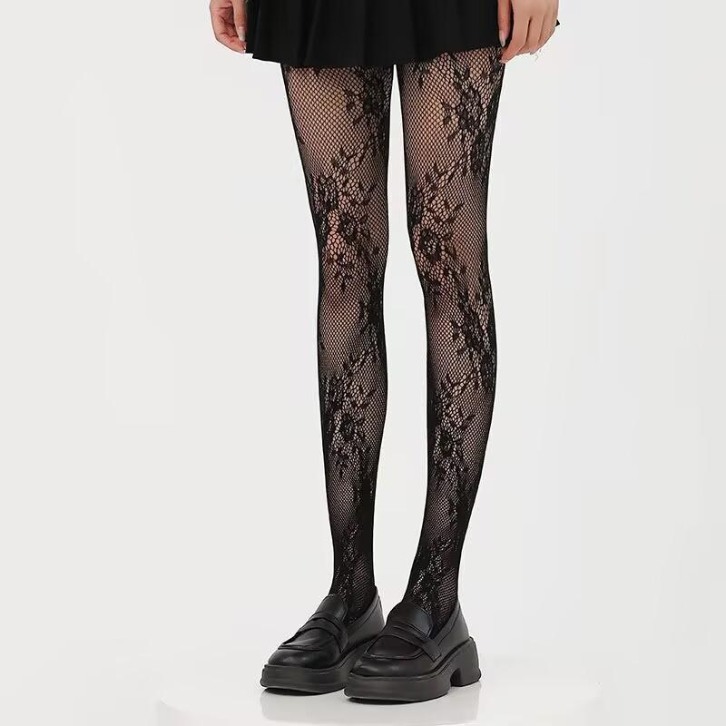 Medias Retro Caladas de Encaje Floral Sexy Jacquard Y2K de Red Negras Sexy Antidesgarros para Mujer