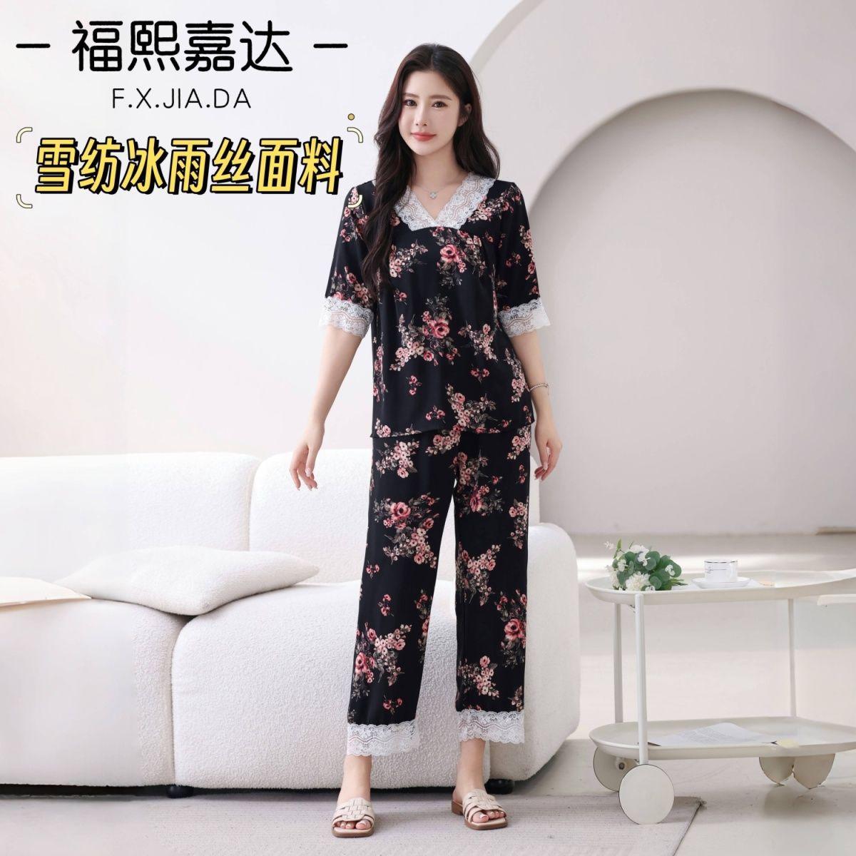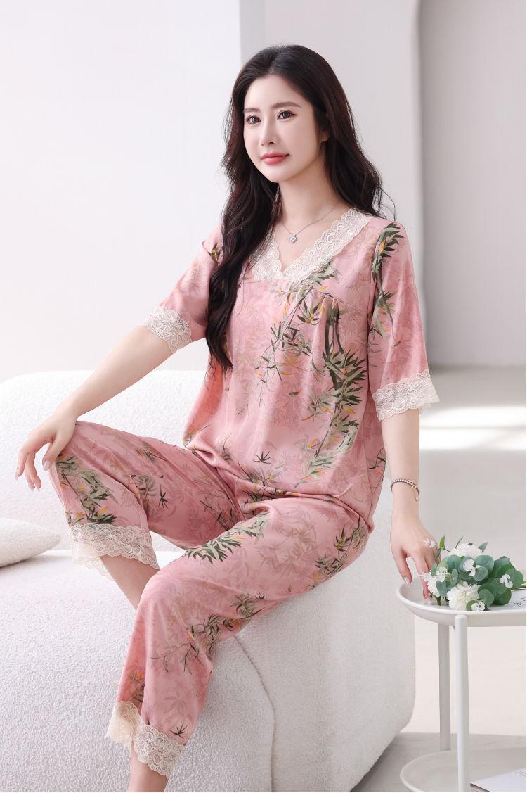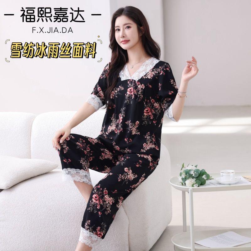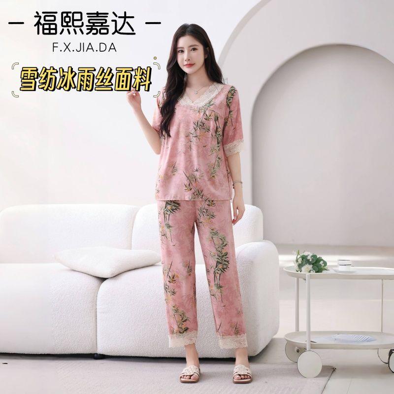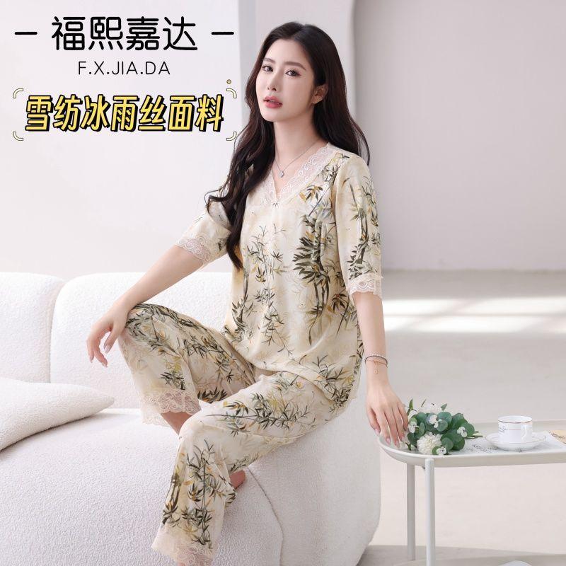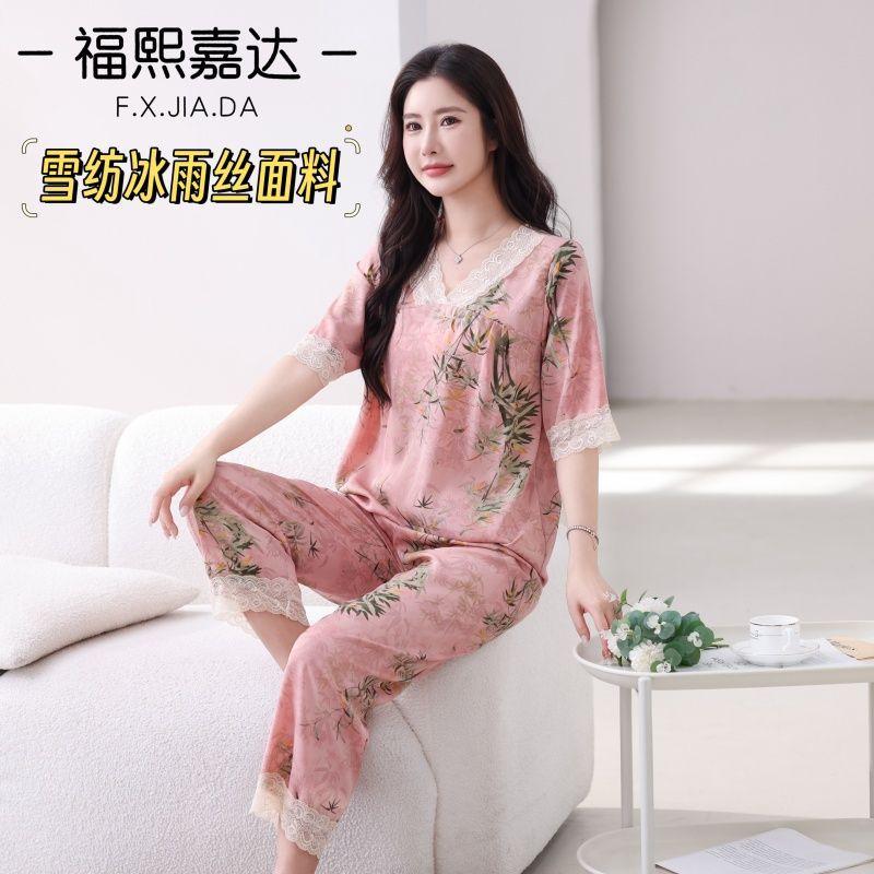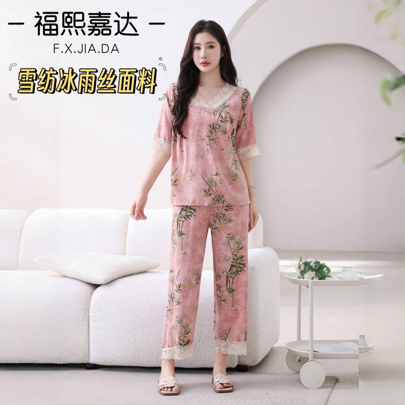 Fuxi Jiada Estilo Coreano Holgado Adelgazante Traje para Casa Verano Suave Tela de Seda Chifón Estampado Encaje Pijama