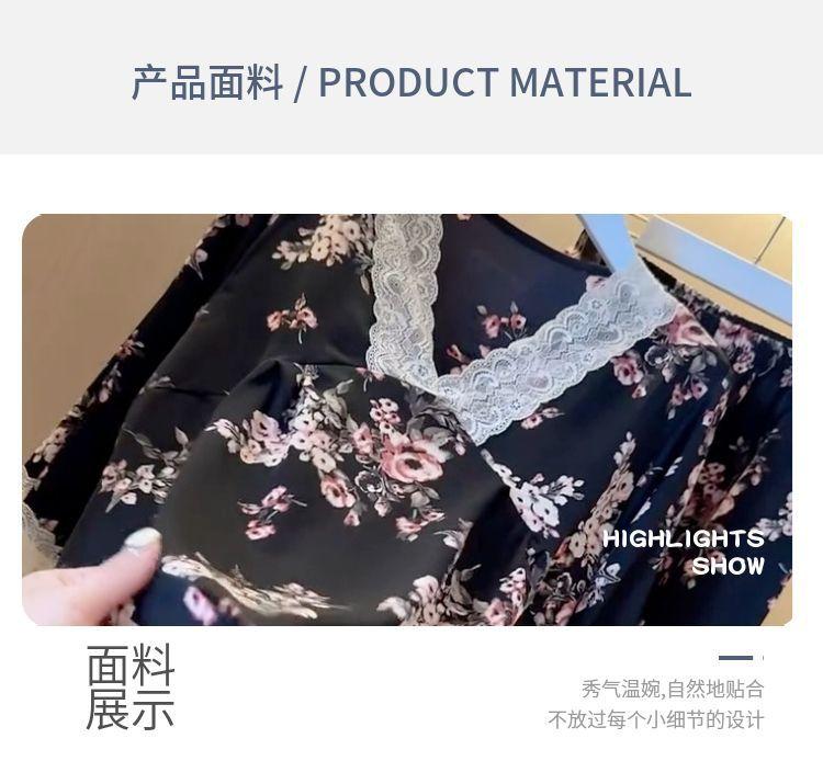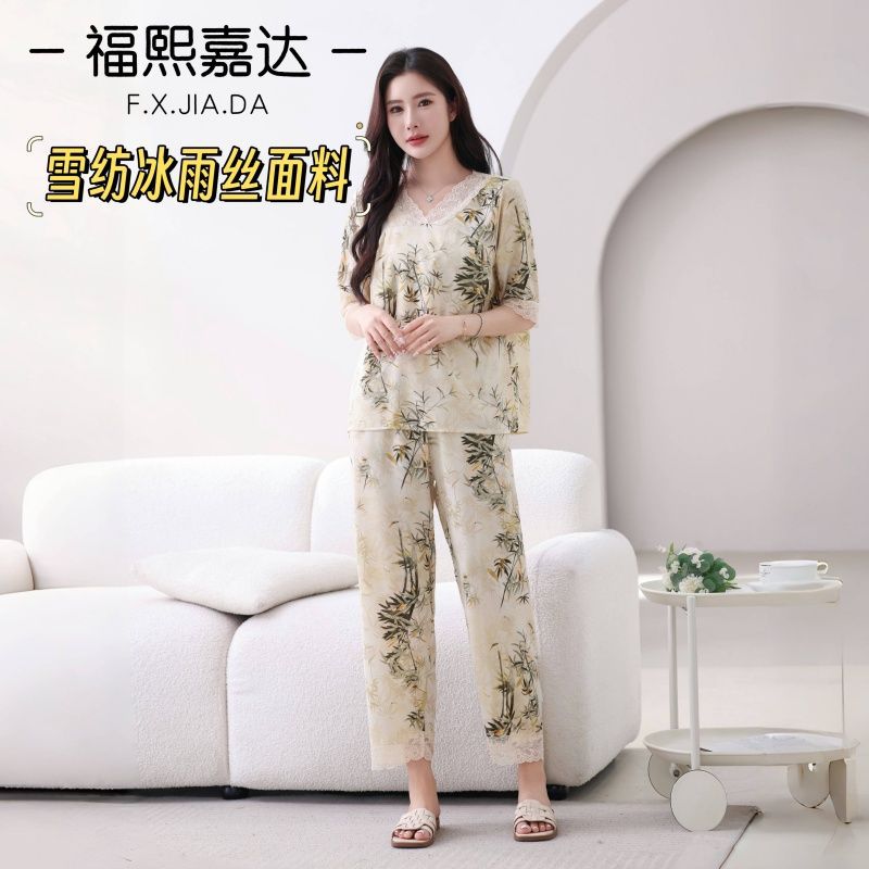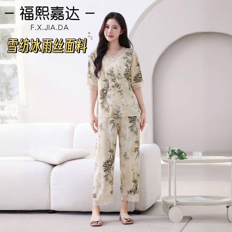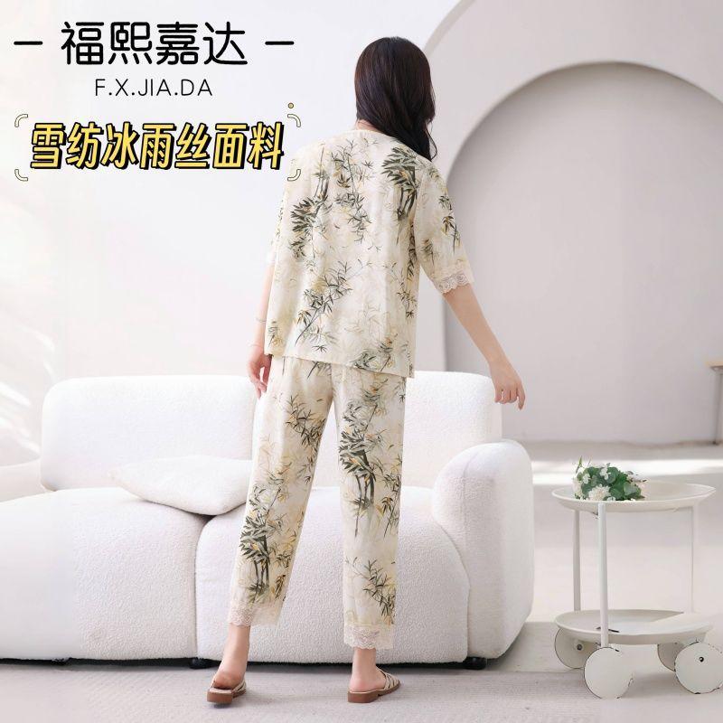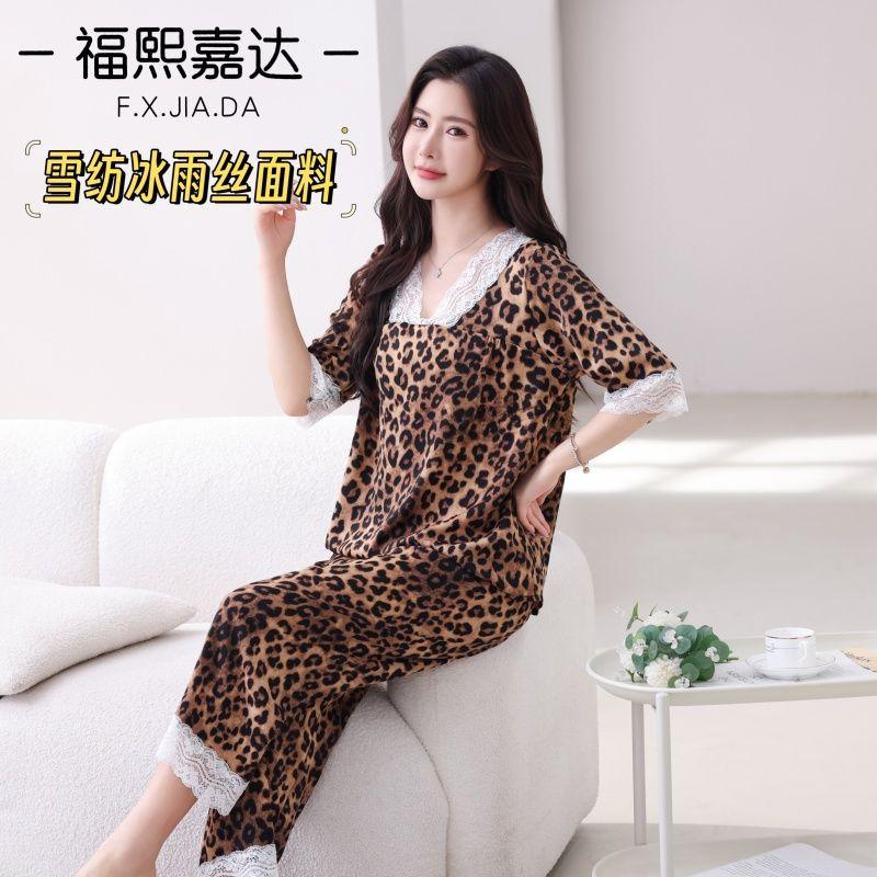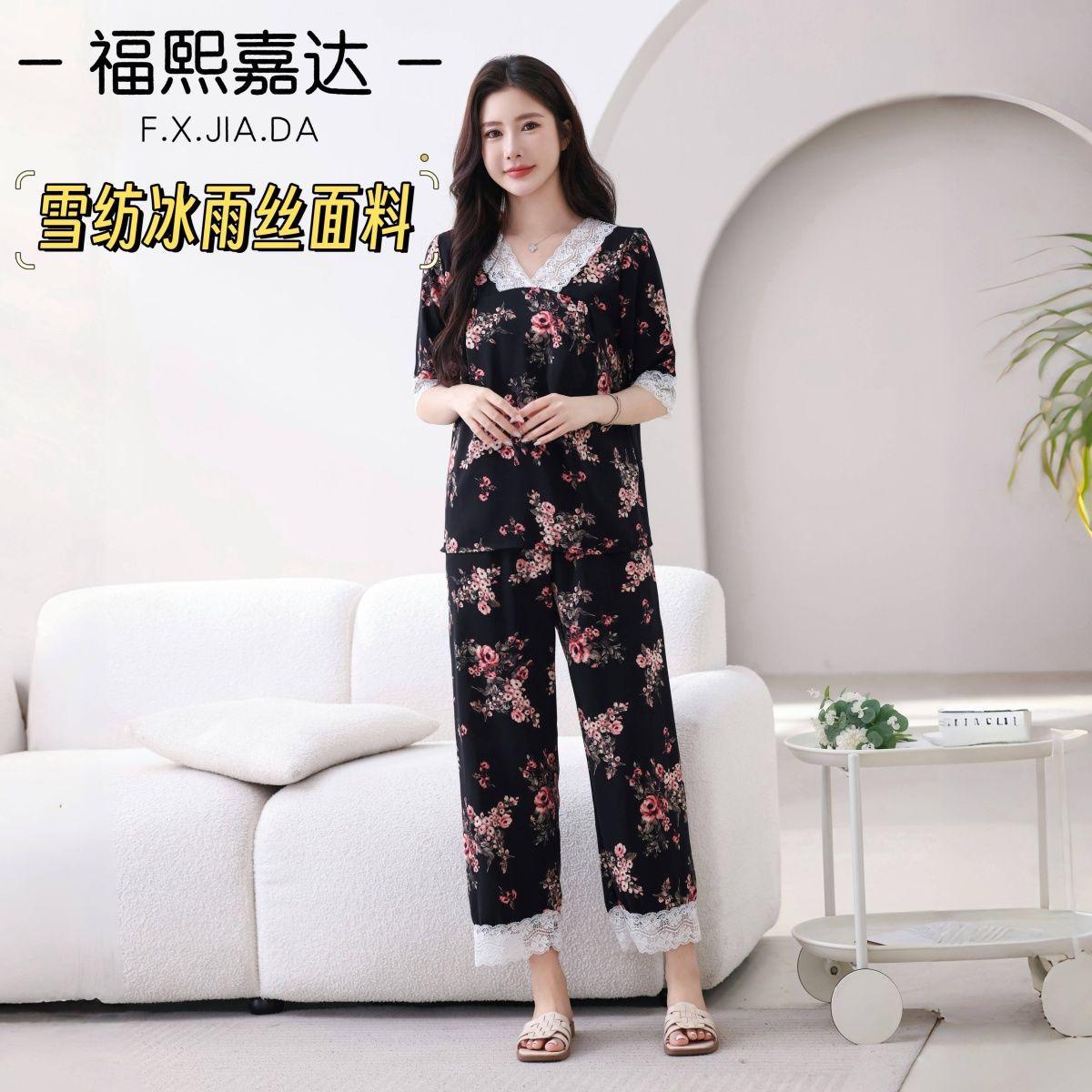 Fuxi Jiada Estilo Coreano Holgado Adelgazante Traje para Casa Verano Suave Tela de Seda Chifón Estampado Encaje Pijama