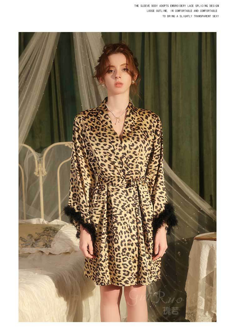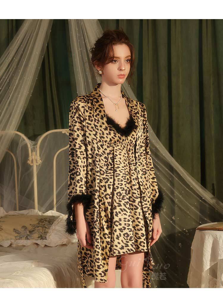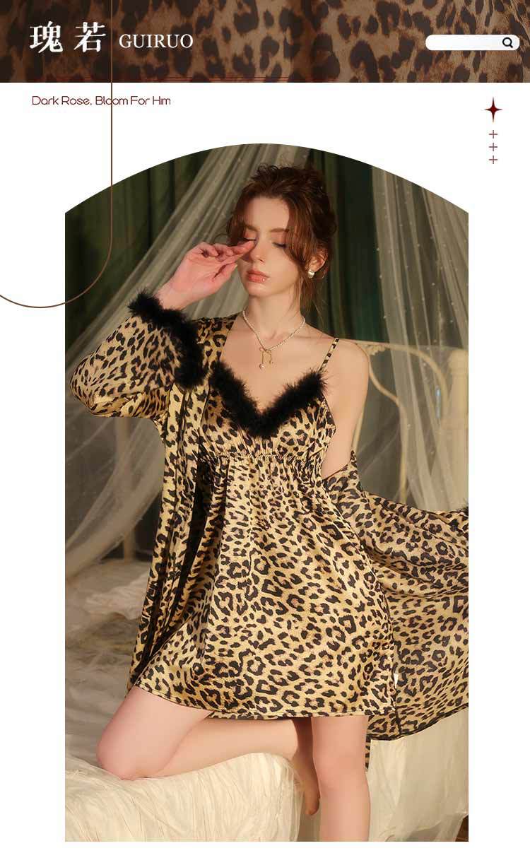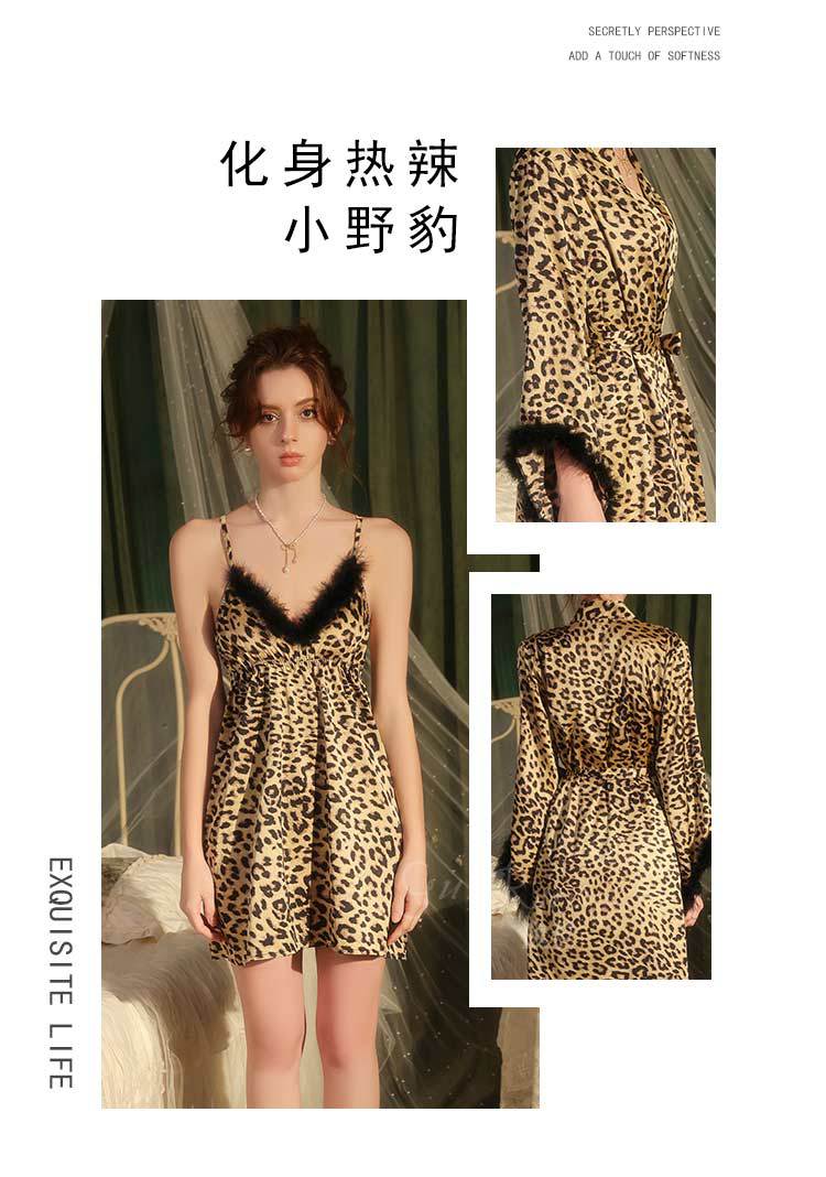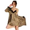 Dz Estilo Satén Estampado Leopardo Sexy Escote Profundo V Adorno de Felpa Reductor de Cintura Camisón Bata Set para Mujer 5497