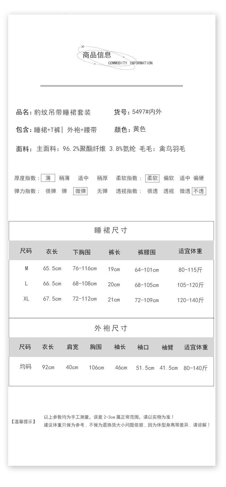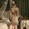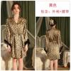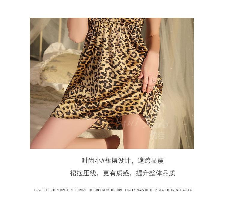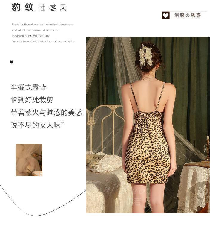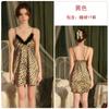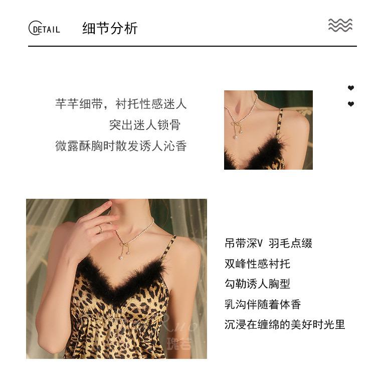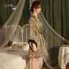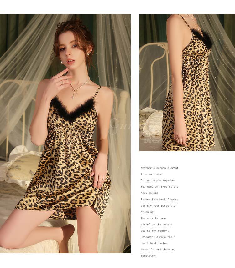 Dz Estilo Satén Estampado Leopardo Sexy Escote Profundo V Adorno de Felpa Reductor de Cintura Camisón Bata Set para Mujer 5497