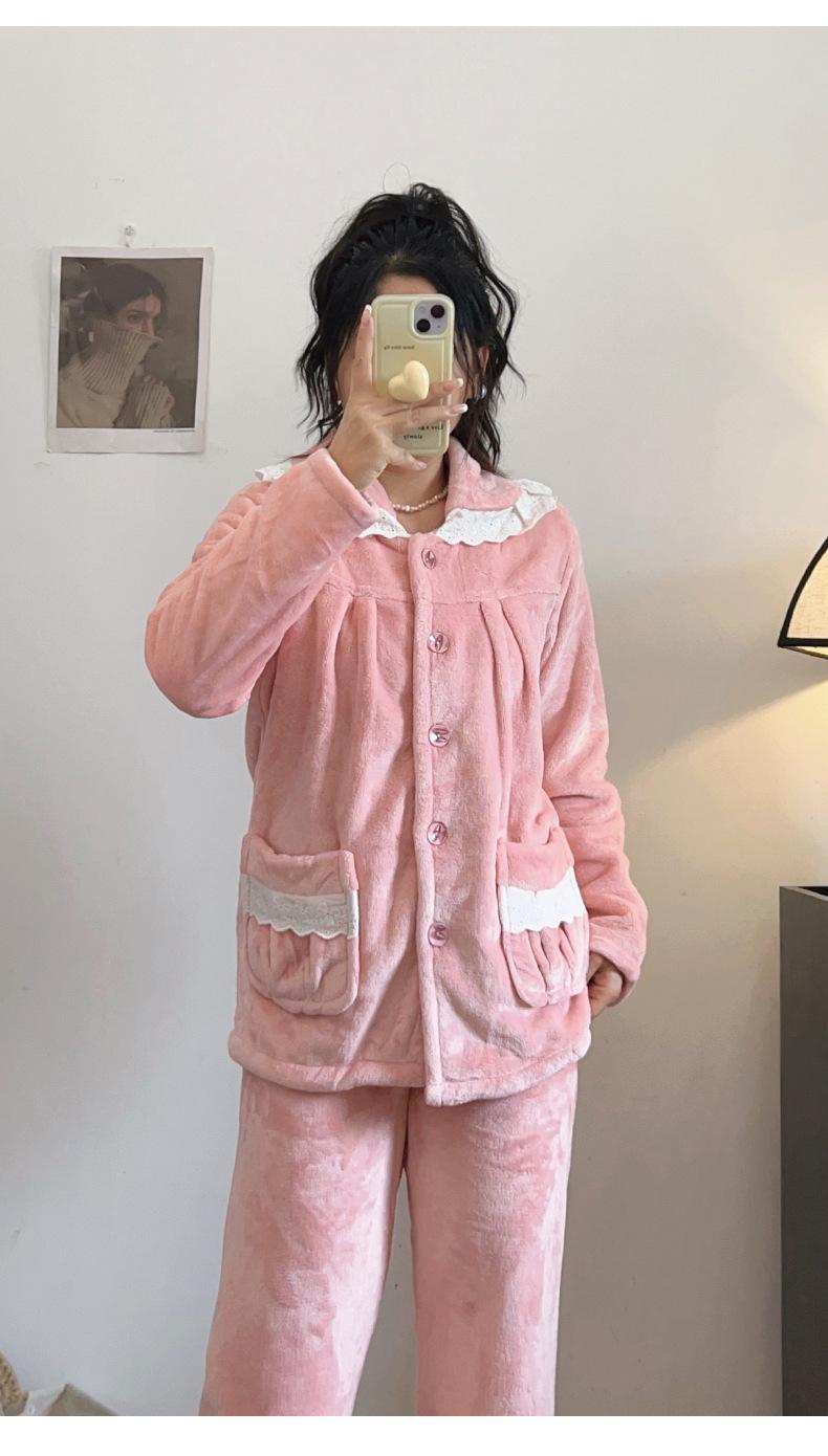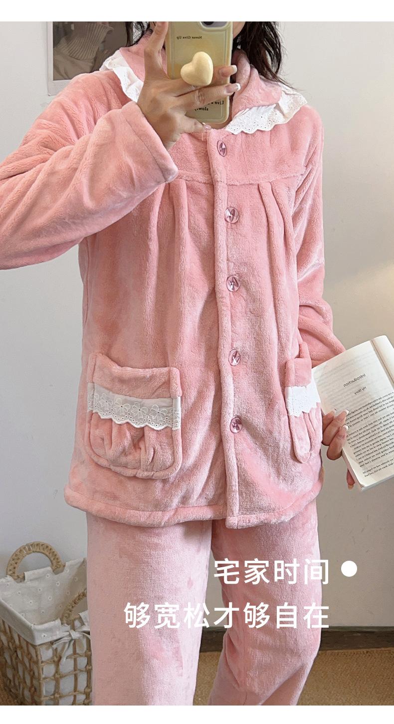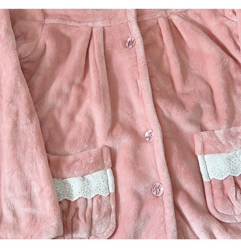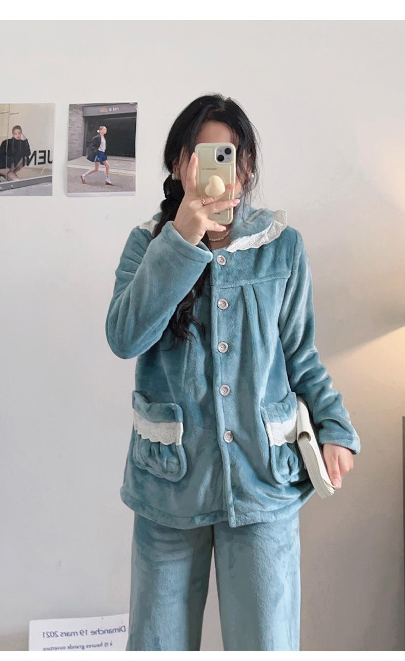 Pijamas de Terciopelo Coral para Mujer Invierno Nuevo Encaje Dulce Solapa Cárdigan Conjunto Franela Espesado Cálido Ropa para el Hogar