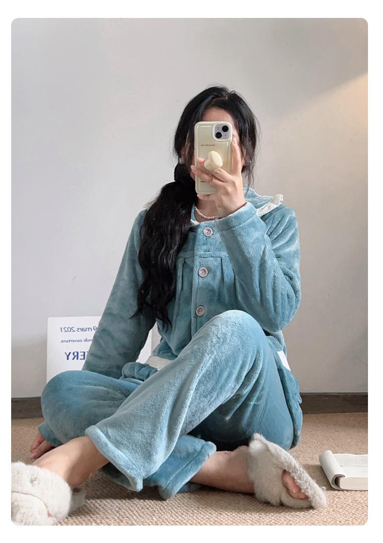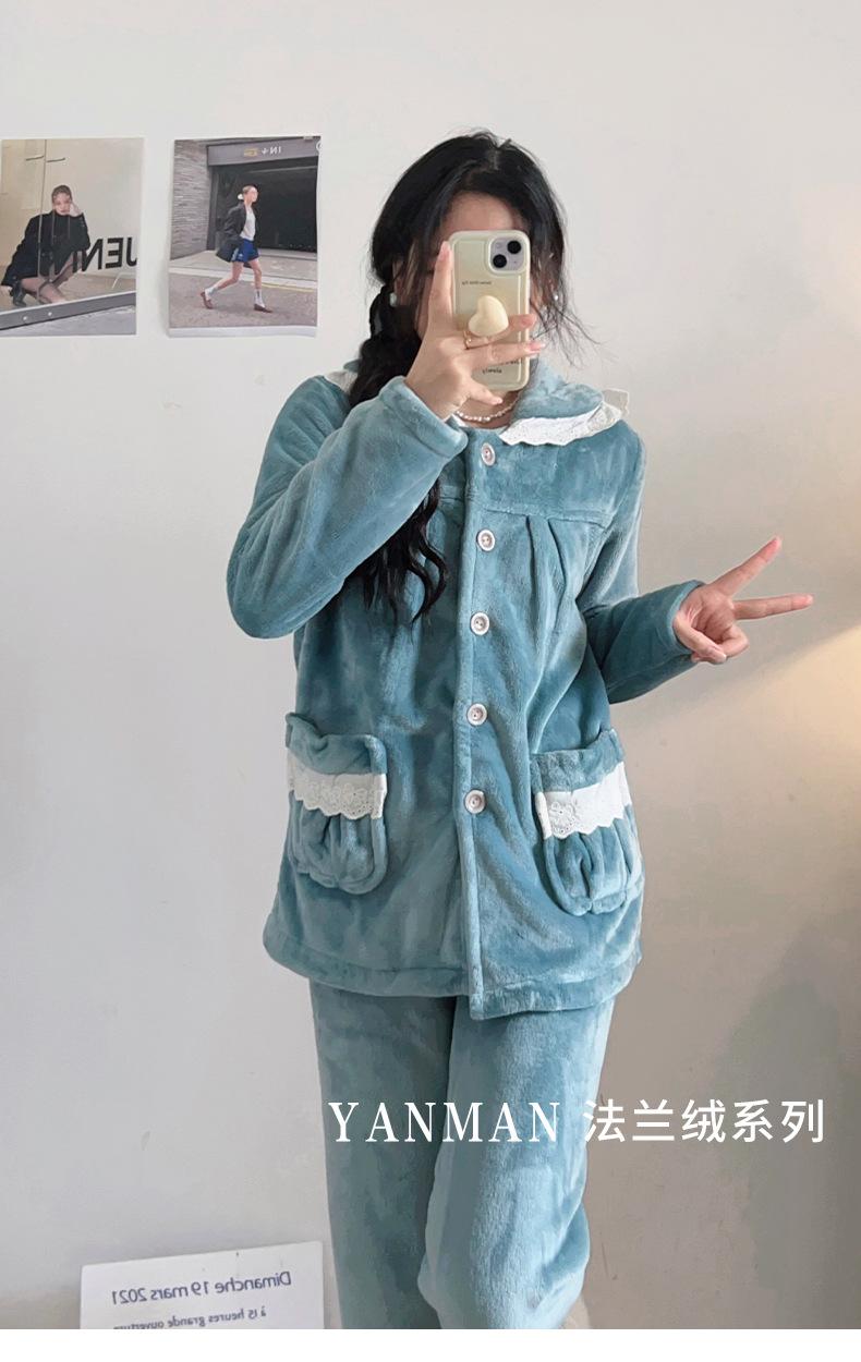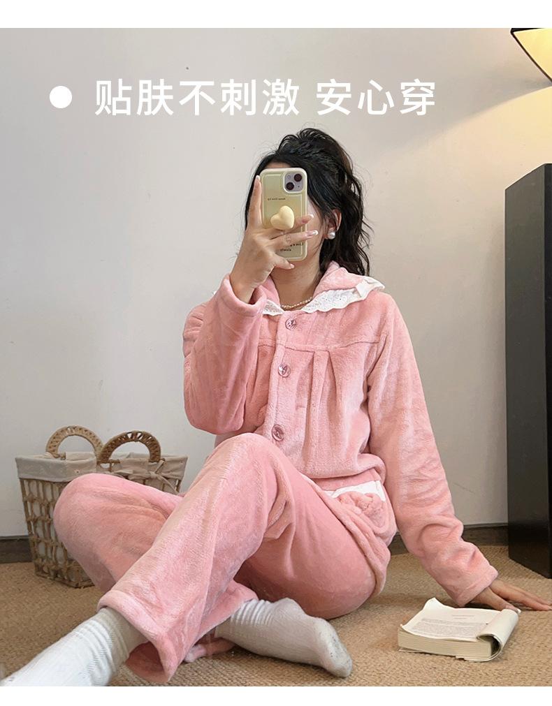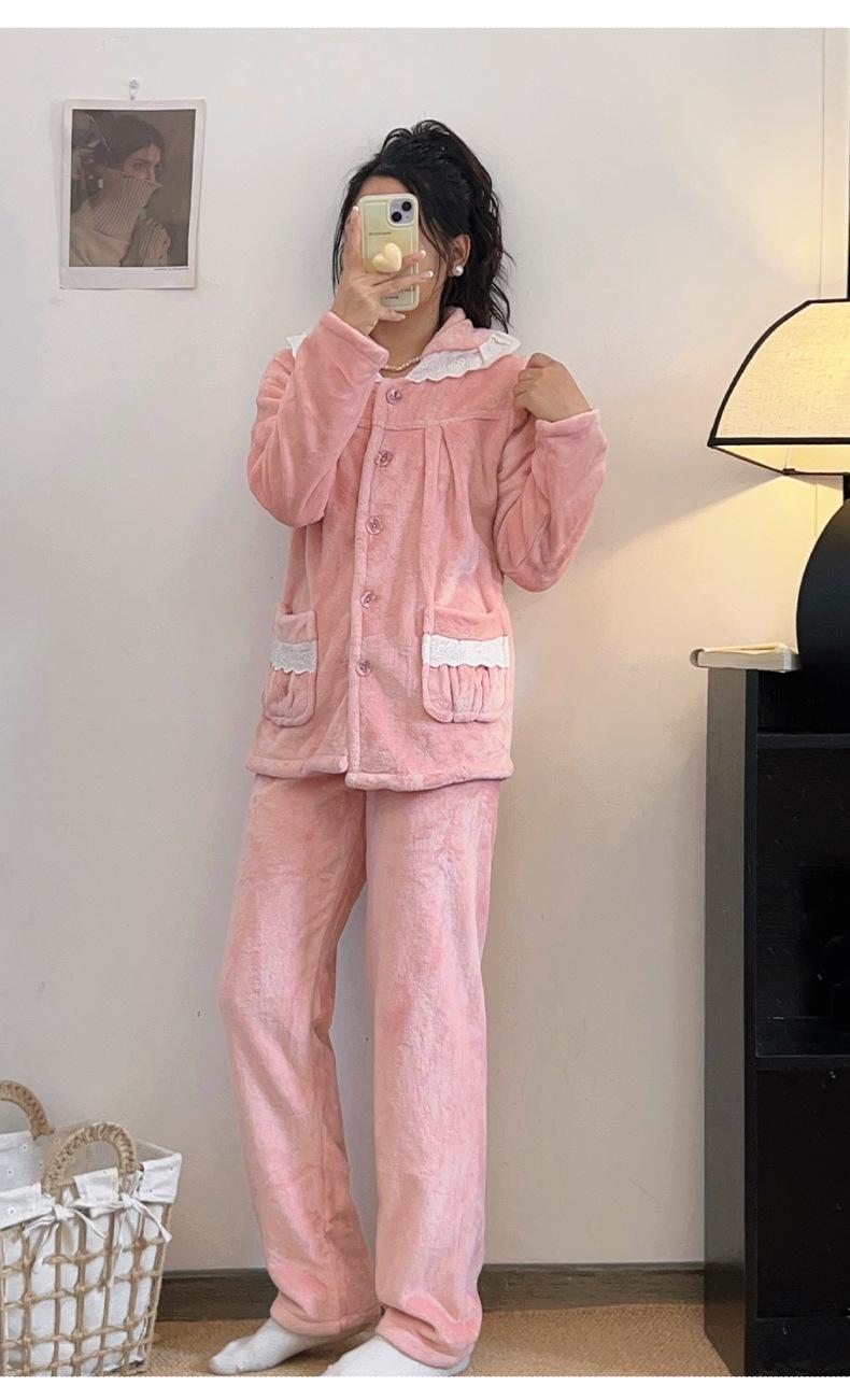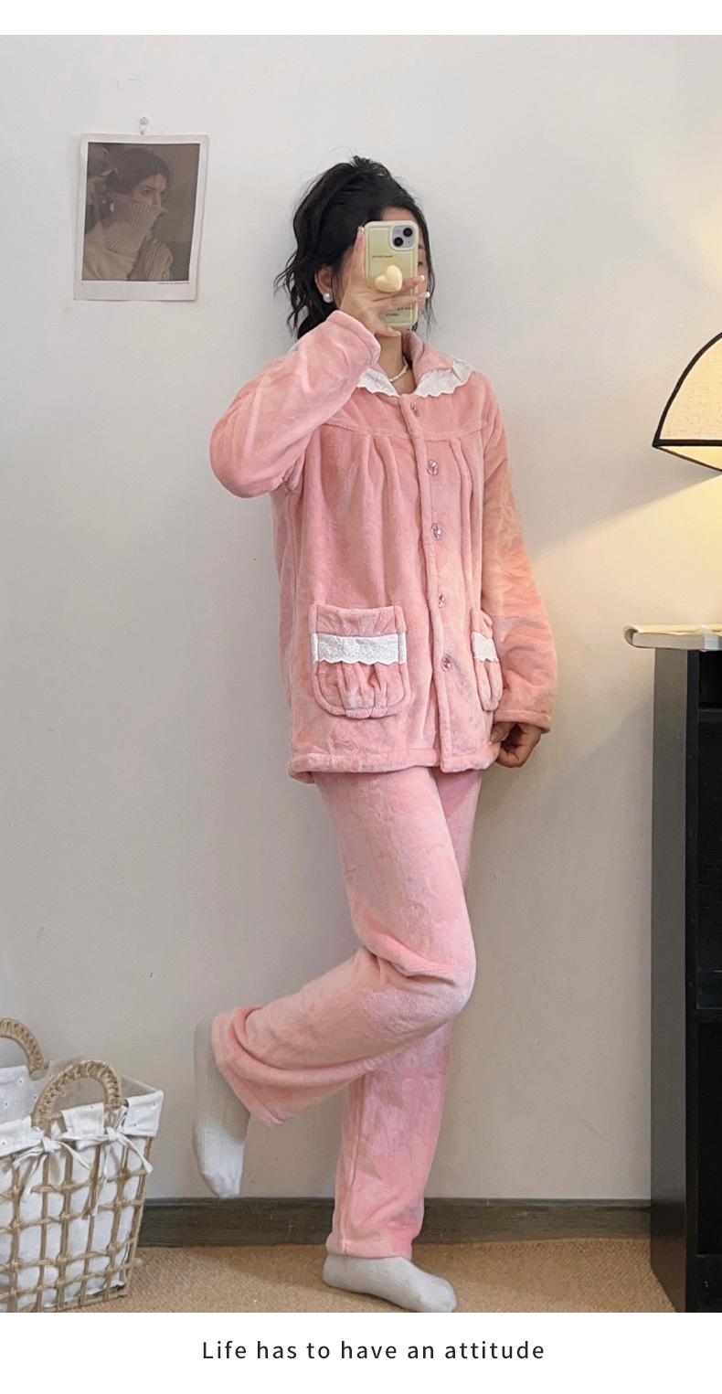 Pijamas de Terciopelo Coral para Mujer Invierno Nuevo Encaje Dulce Solapa Cárdigan Conjunto Franela Espesado Cálido Ropa para el Hogar