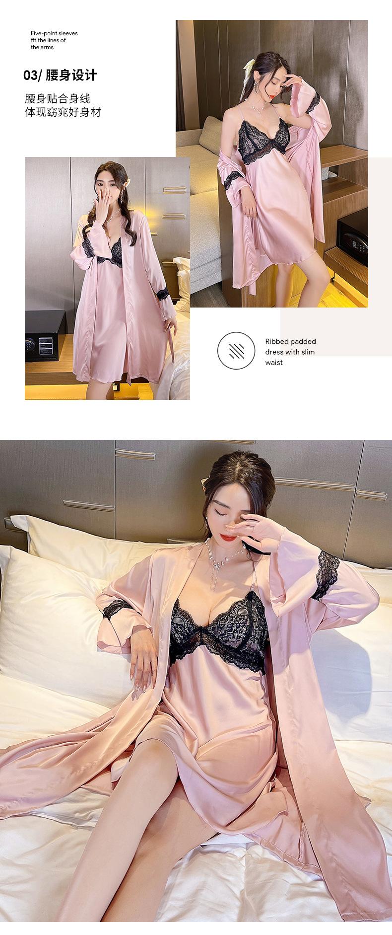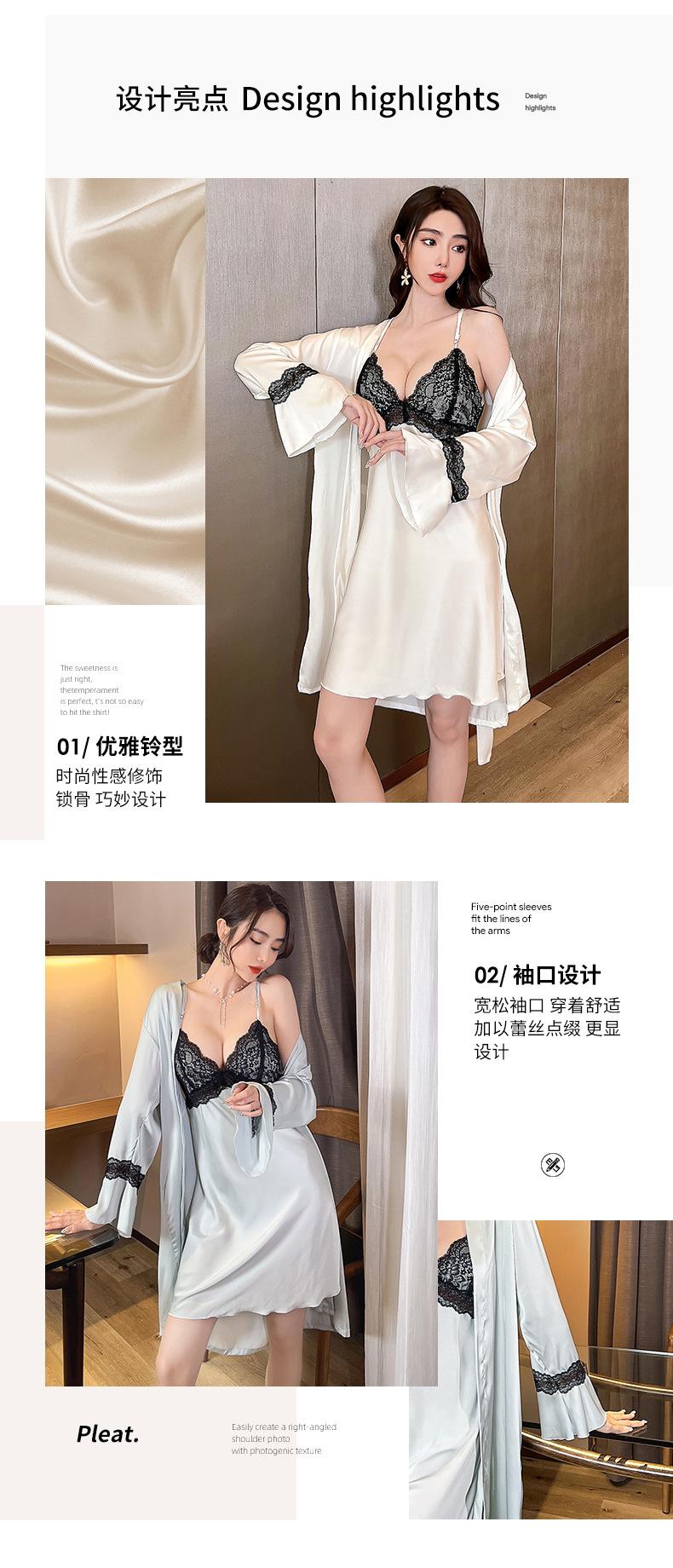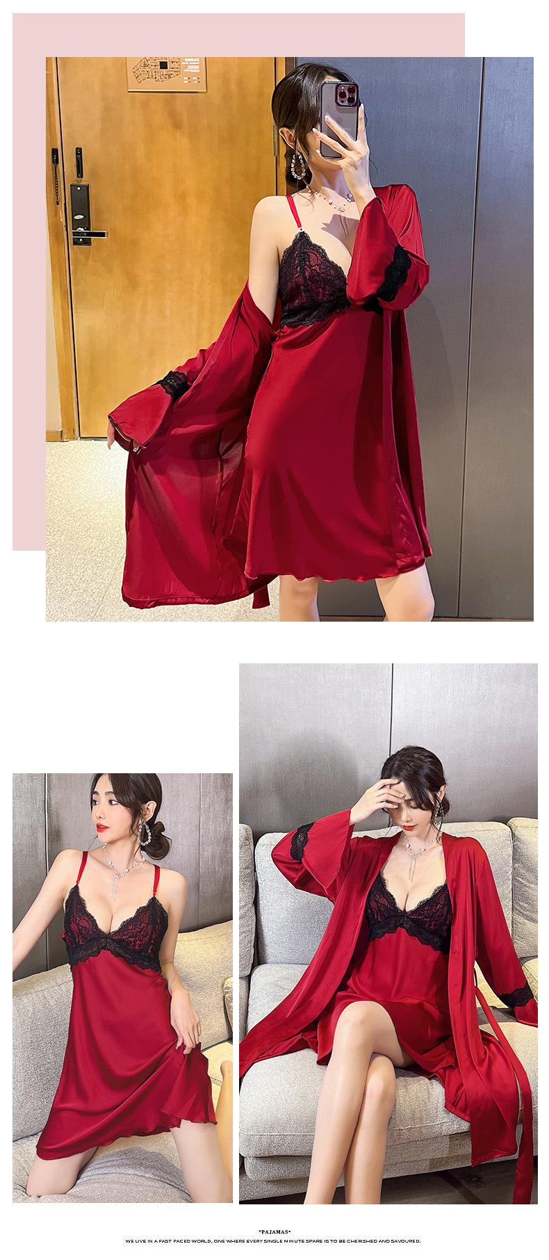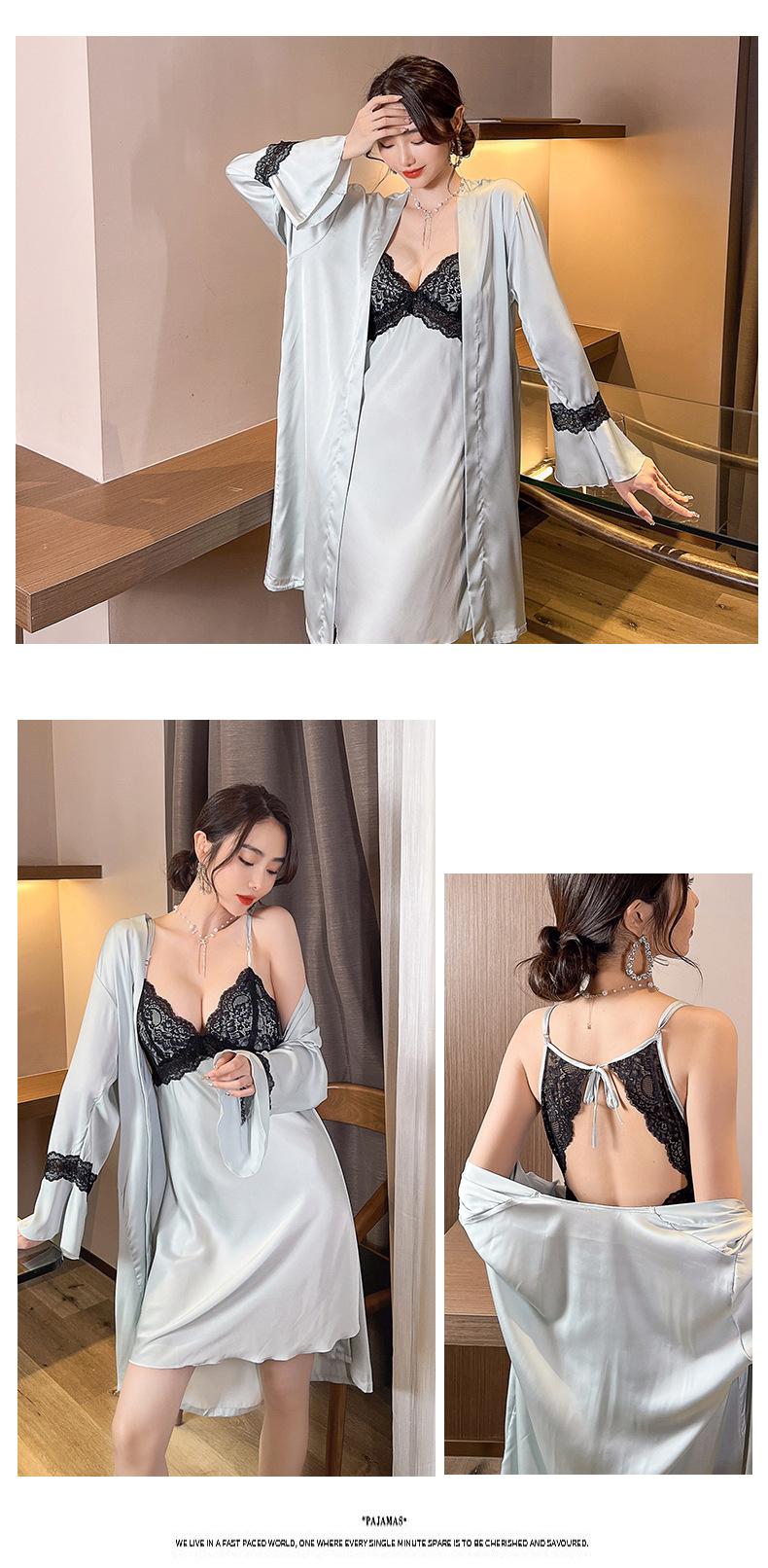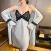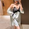 Primavera y Verano Camisón Sexy de Tirantes de Encaje con Bata Conjunto de Dos Piezas Ropa para el Hogar Pijama de Seda de Hielo para Mujer