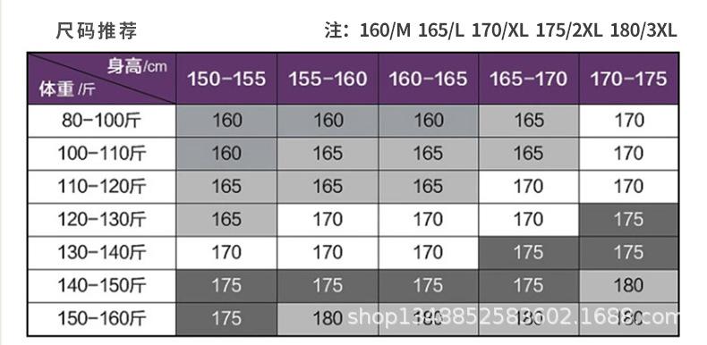 160/M, 165/L, 170/XL, 175/XXL, 180/XXXL