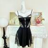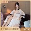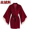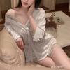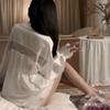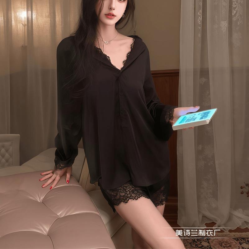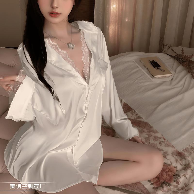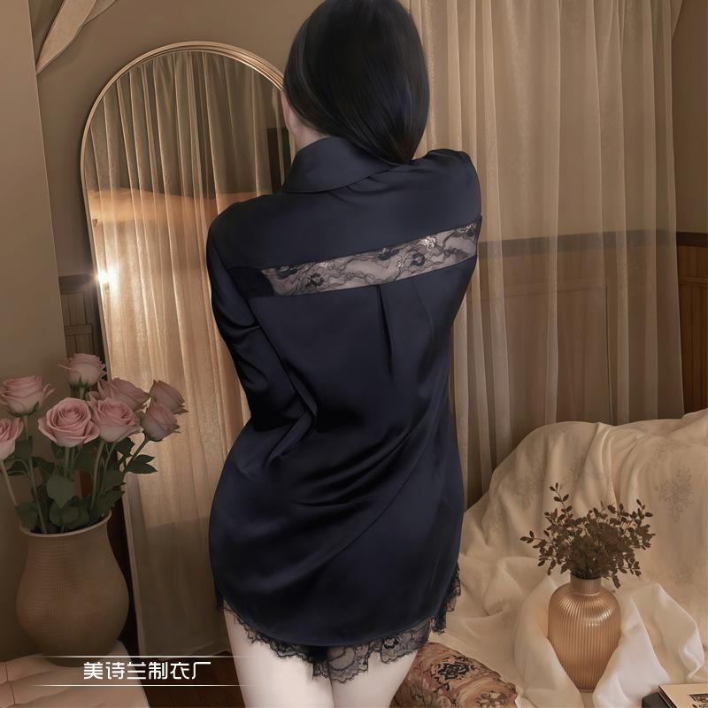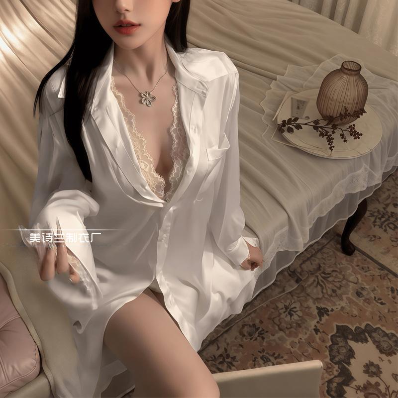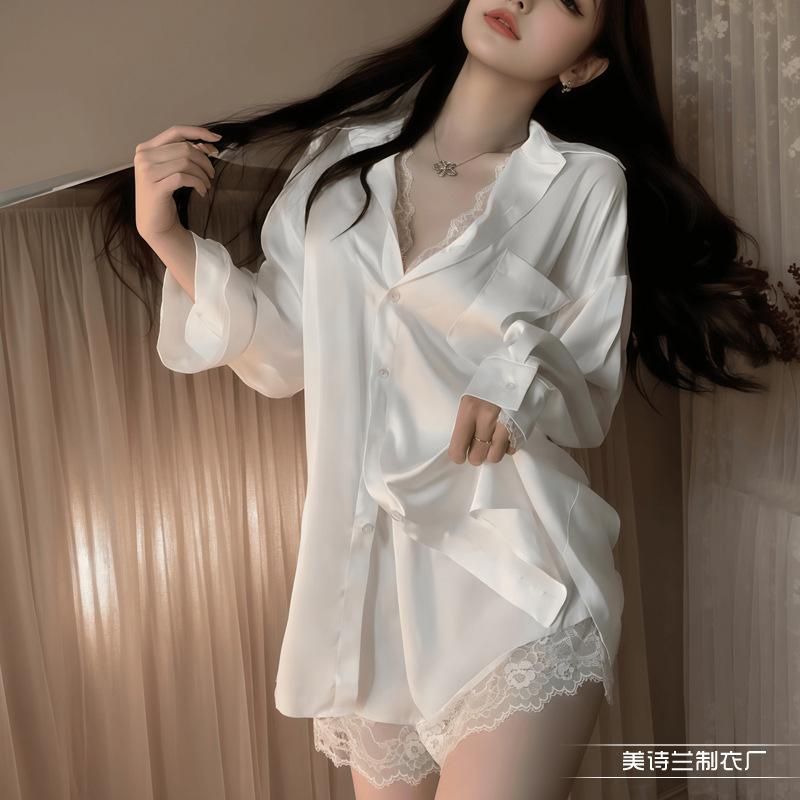 Pijama Sexy Meishilan para Mujer Primavera y Verano Seda de Hielo Camisa Estilo Boyfriend Encaje de Tentación Largo Medio Ropa Exterior para el Hogar 346