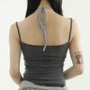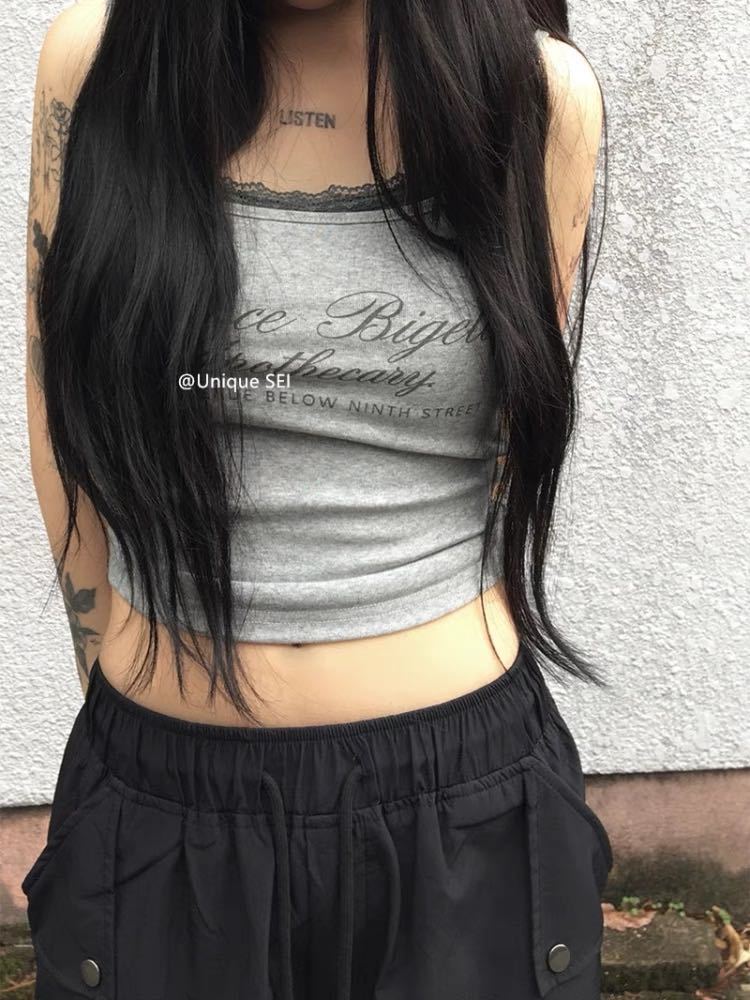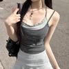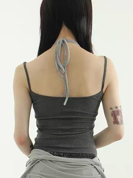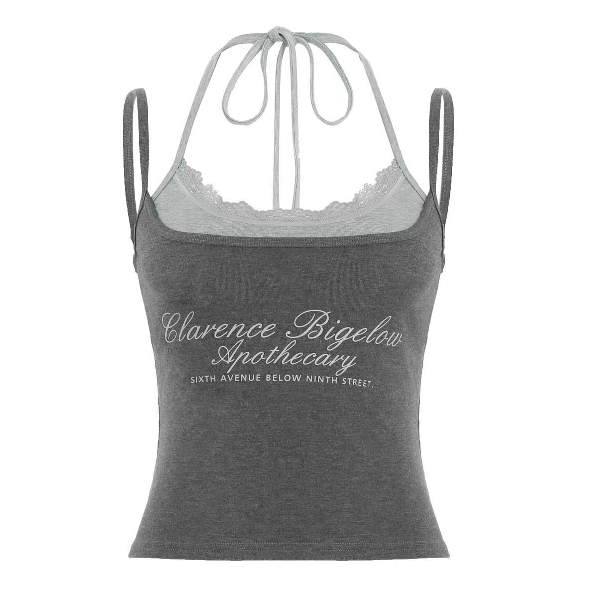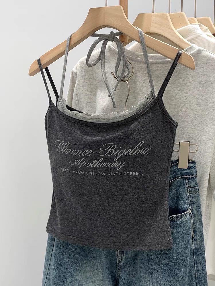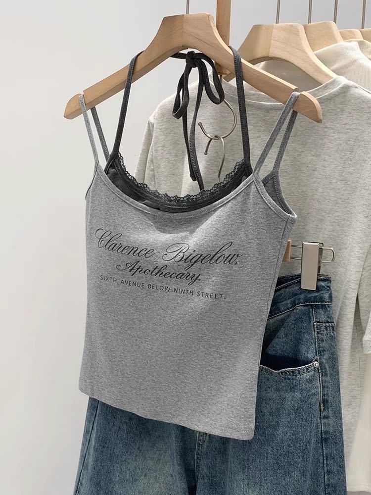 Deseo Puro Chica Caliente Gris Cuello Halter Falso Dos Piezas Verano Nuevo Estampado de Letras Color de Contraste Diseño de Encaje Hermosa Espalda Ropa Exterior