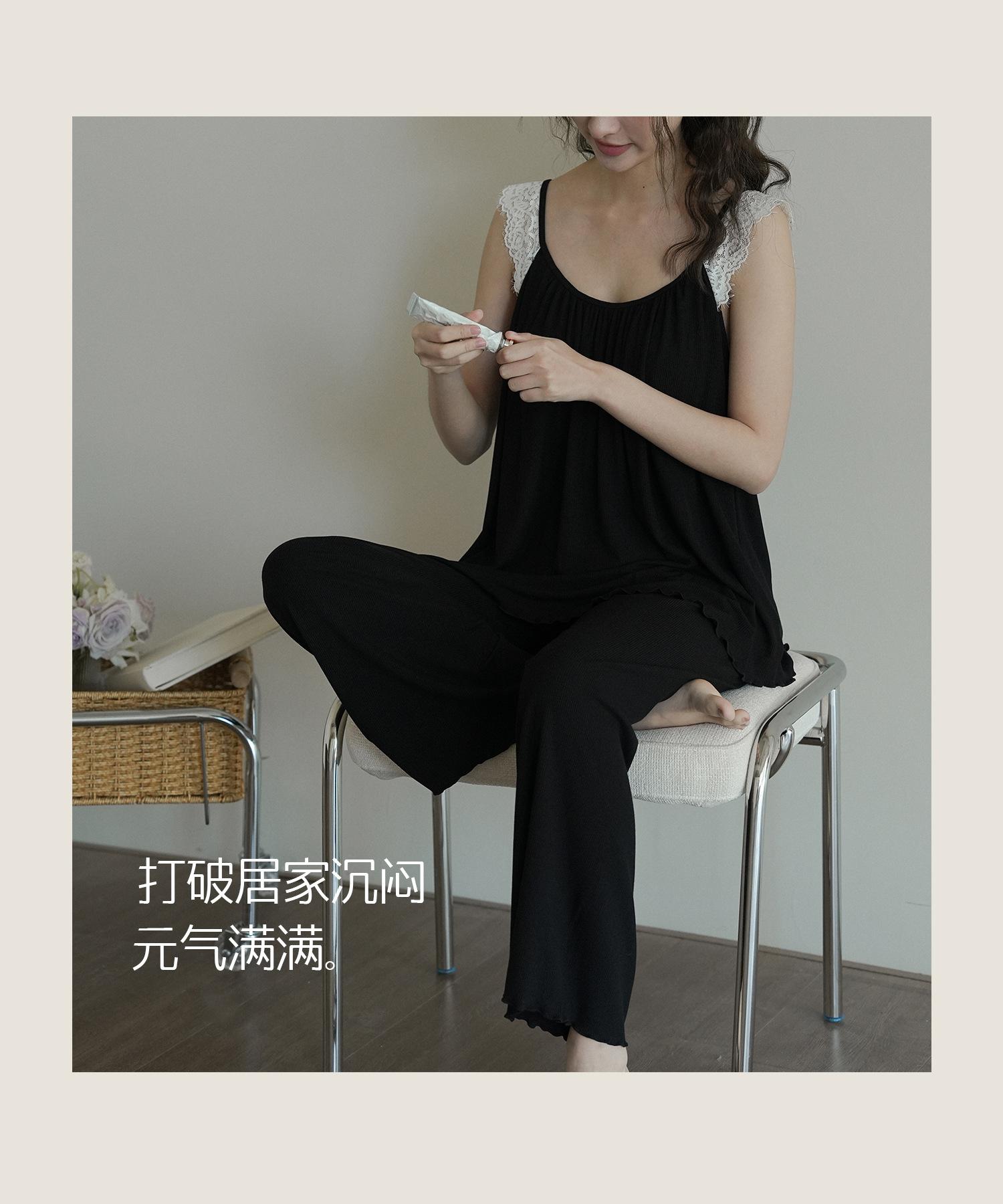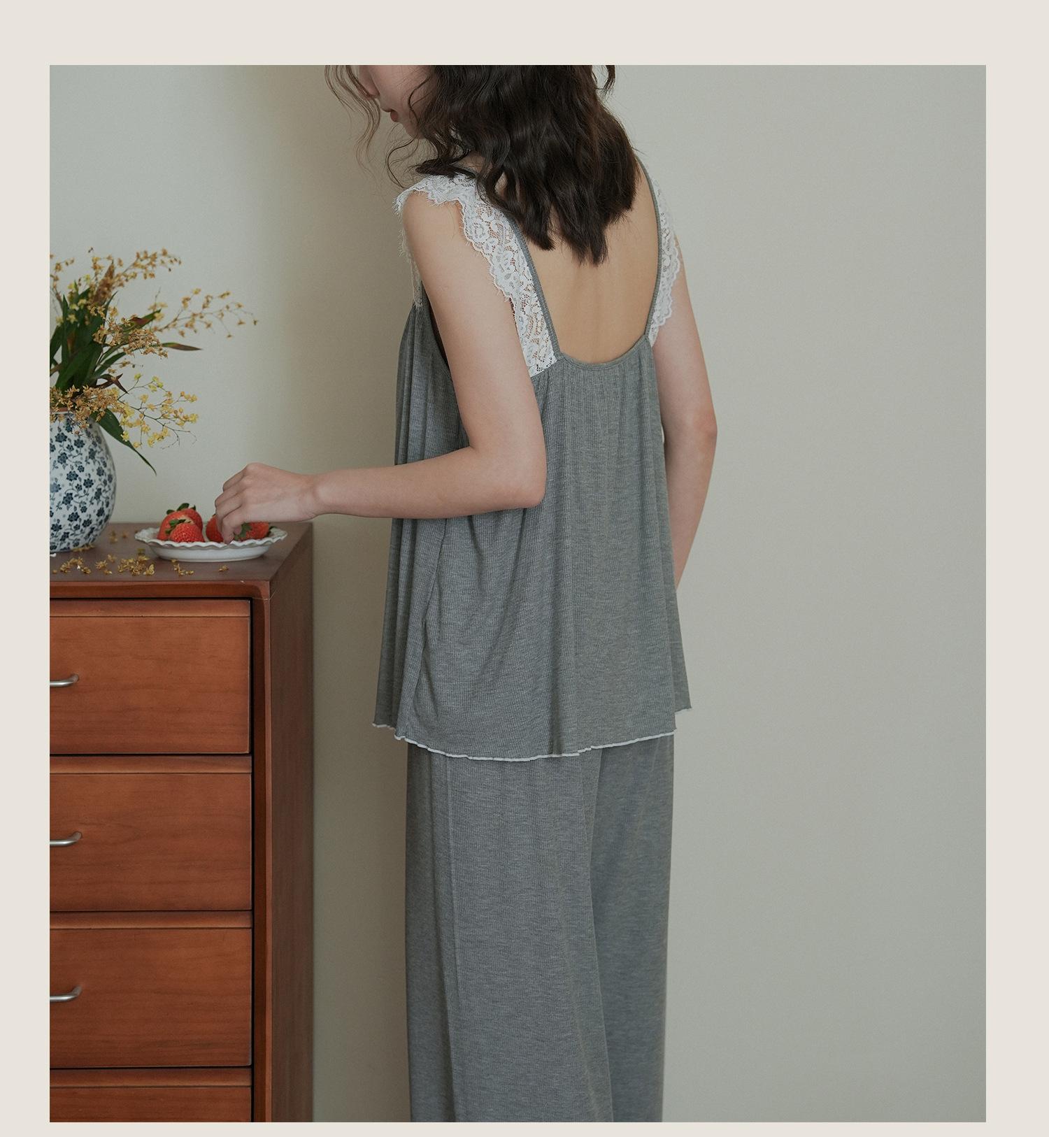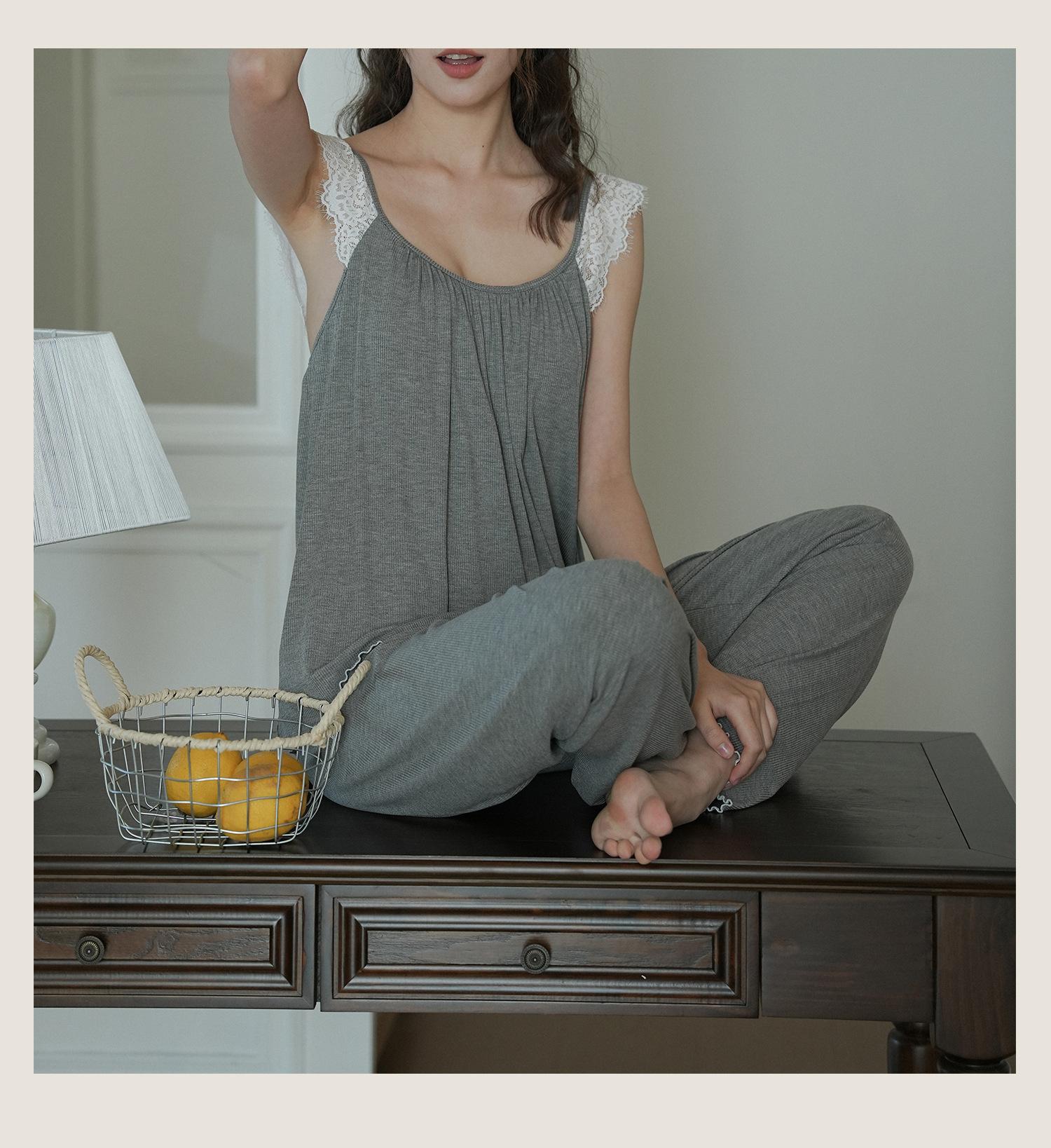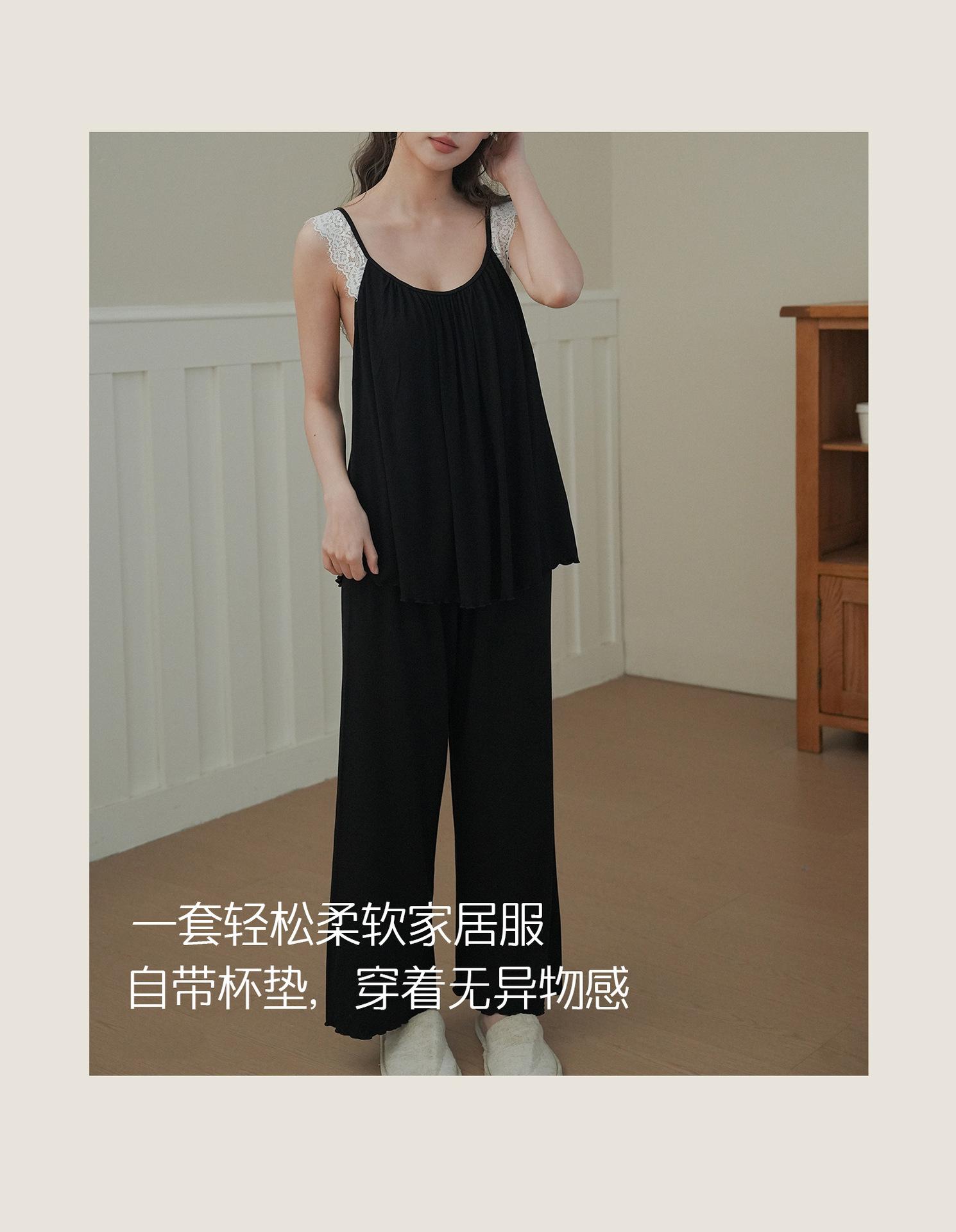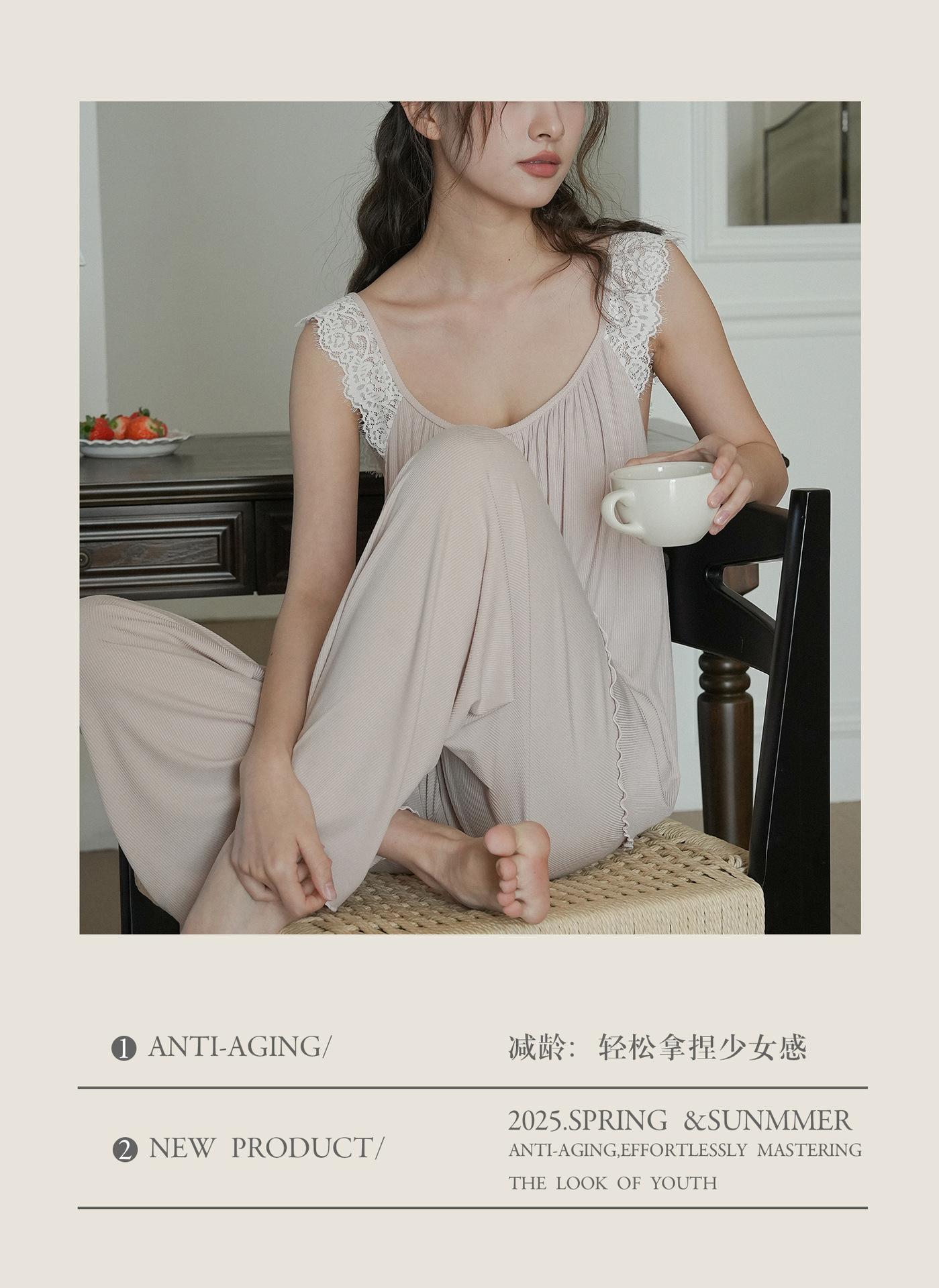 Pijama de Verano para Mujer con Encaje, Almohadilla en el Pecho, Delgada, Color Sólido, Camisola, Pantalones, Conjunto de Dos Piezas, Ropa para el Hogar