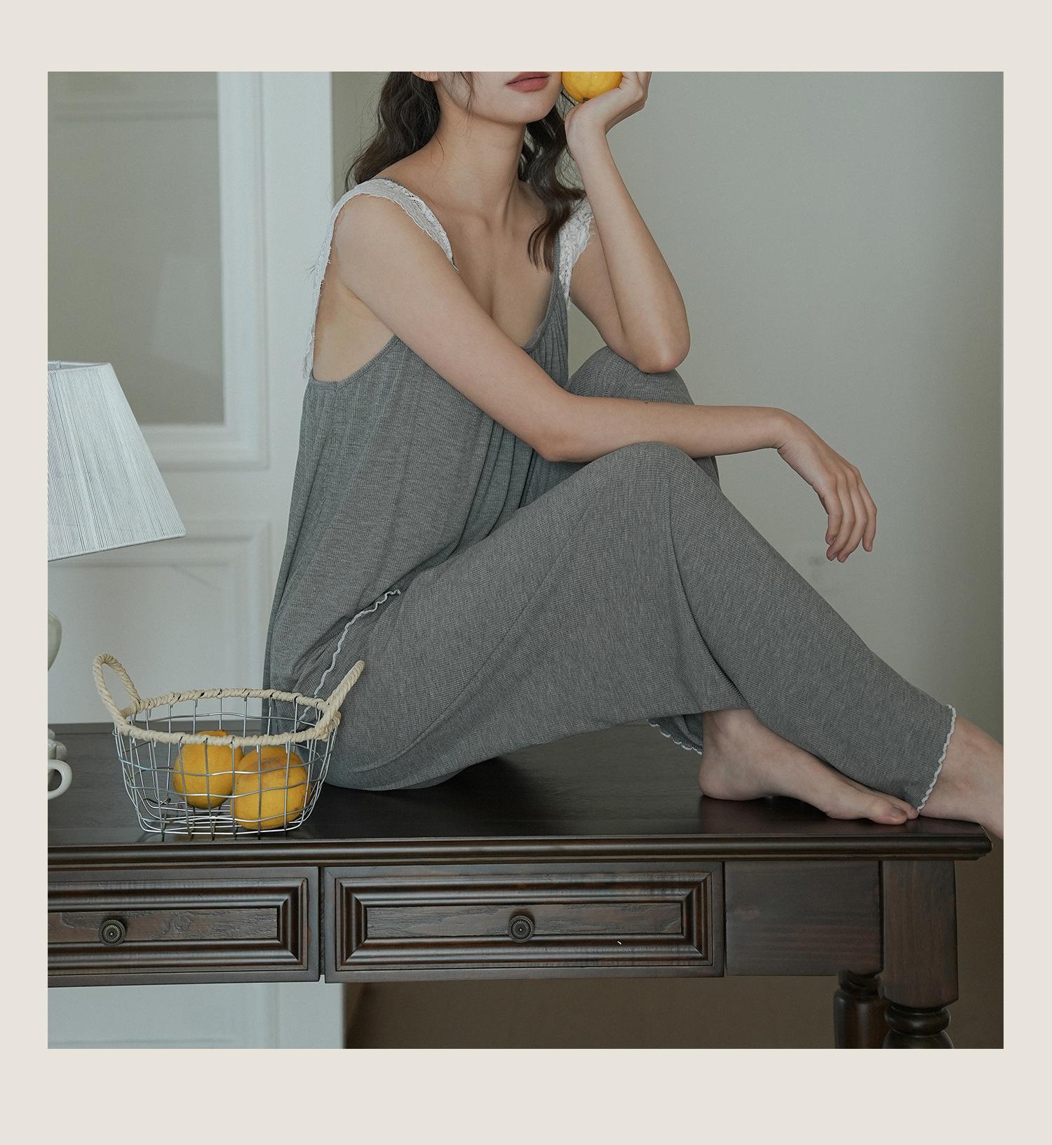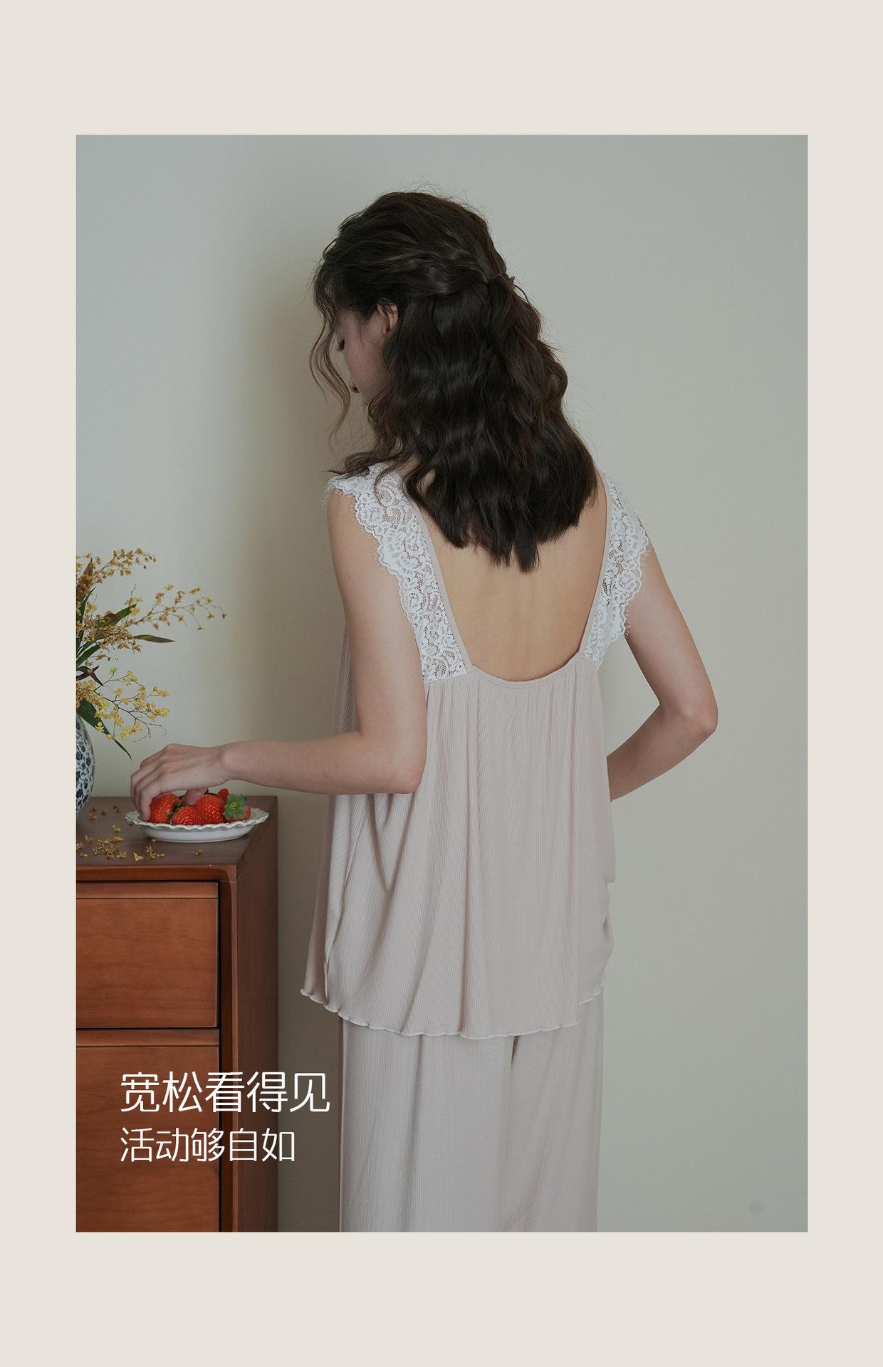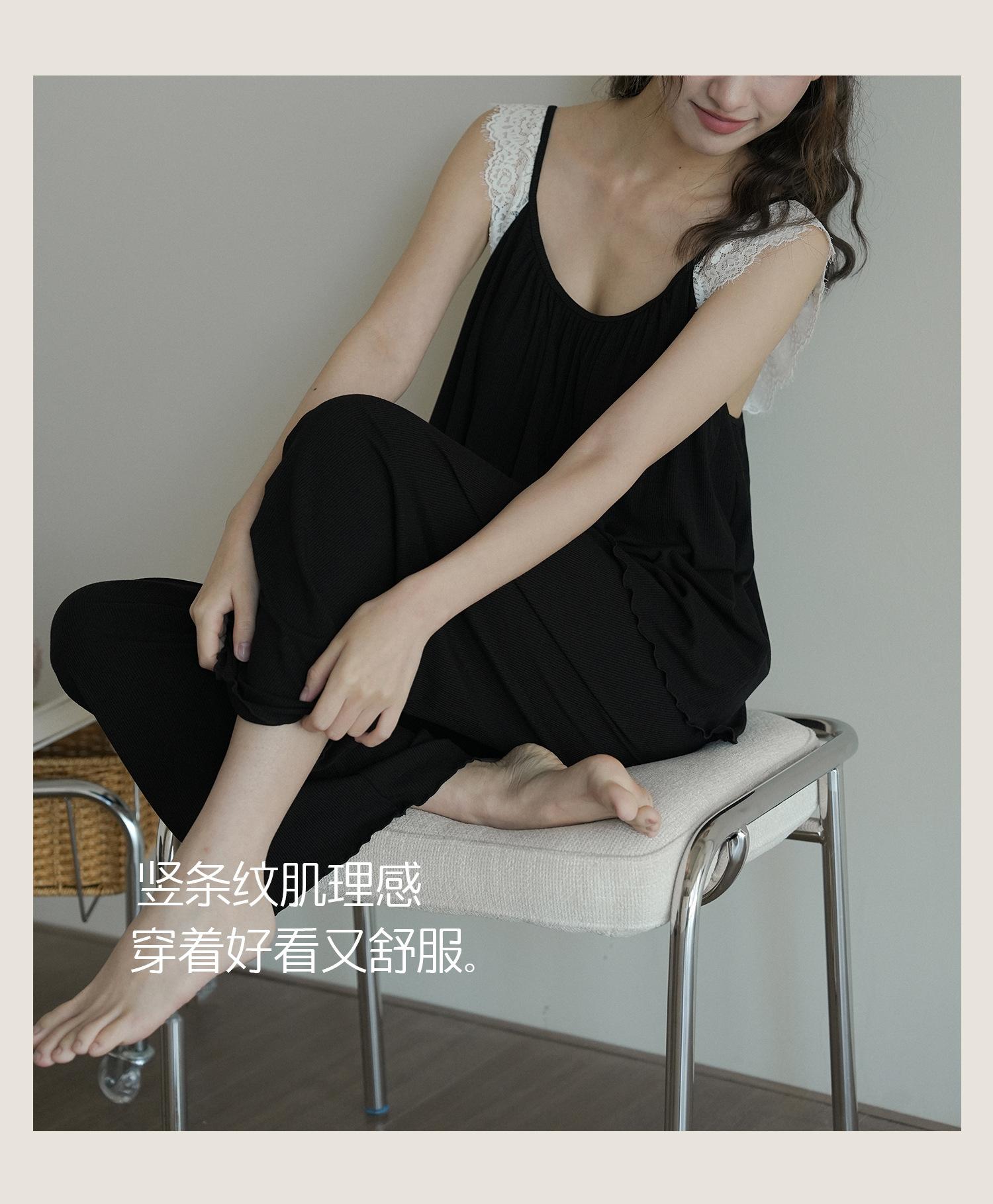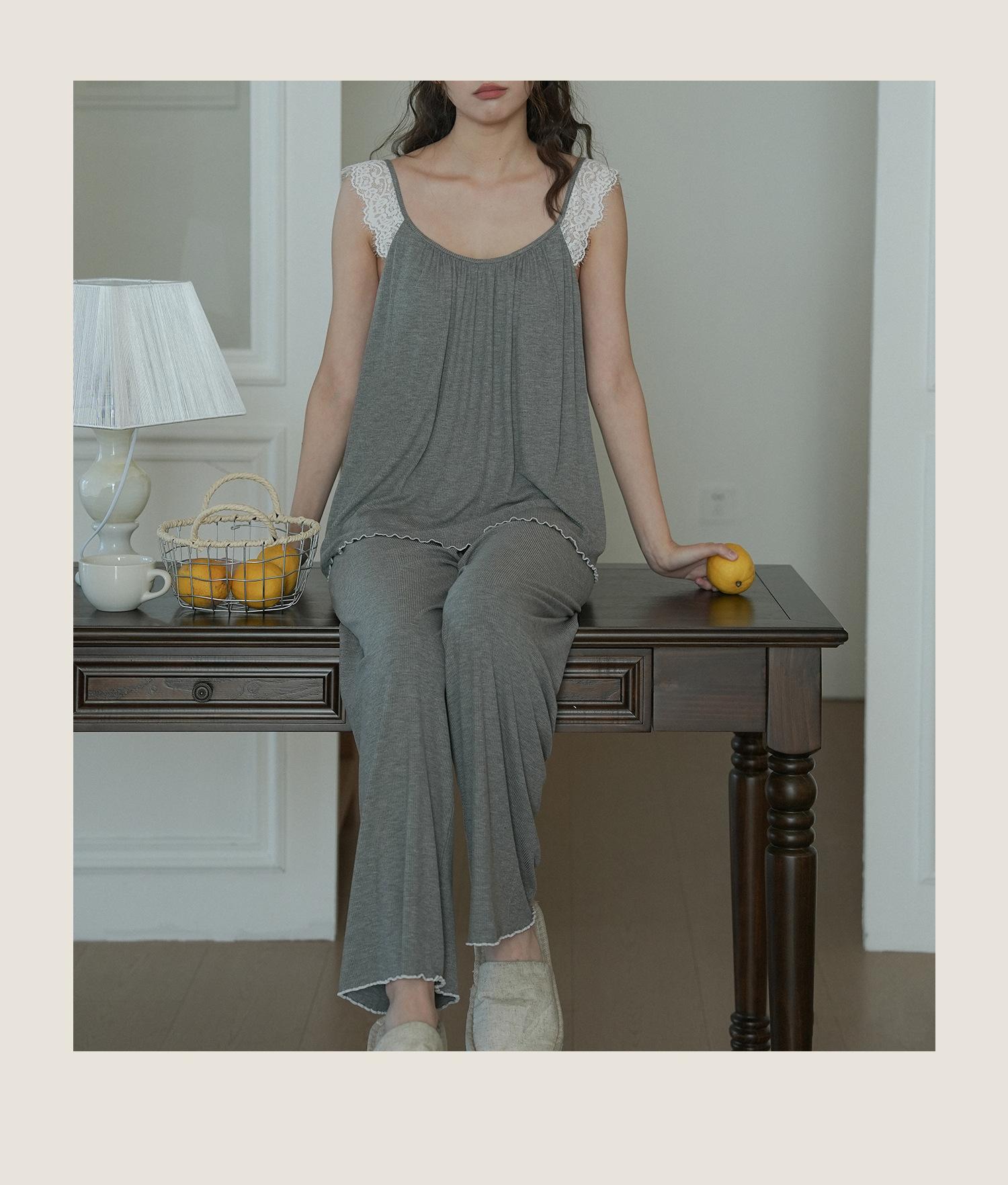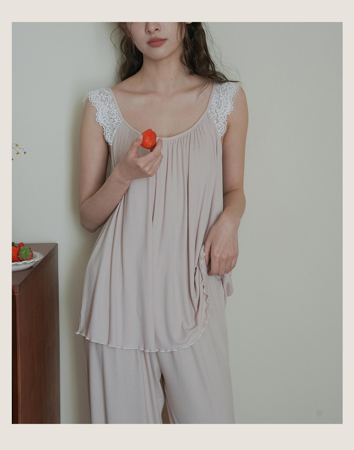 Pijama de Verano para Mujer con Encaje, Almohadilla en el Pecho, Delgada, Color Sólido, Camisola, Pantalones, Conjunto de Dos Piezas, Ropa para el Hogar