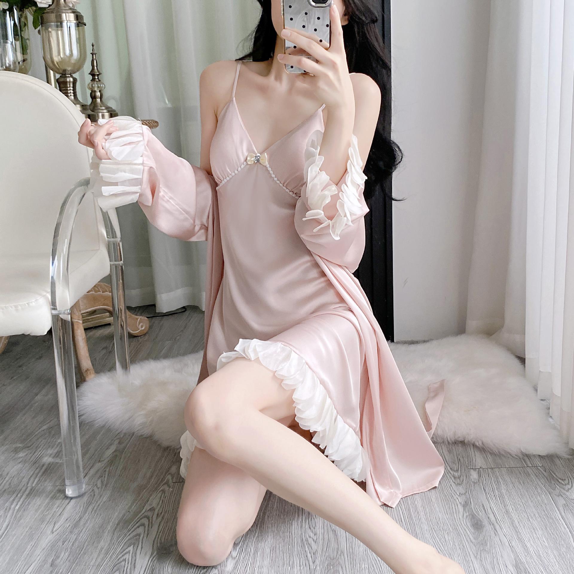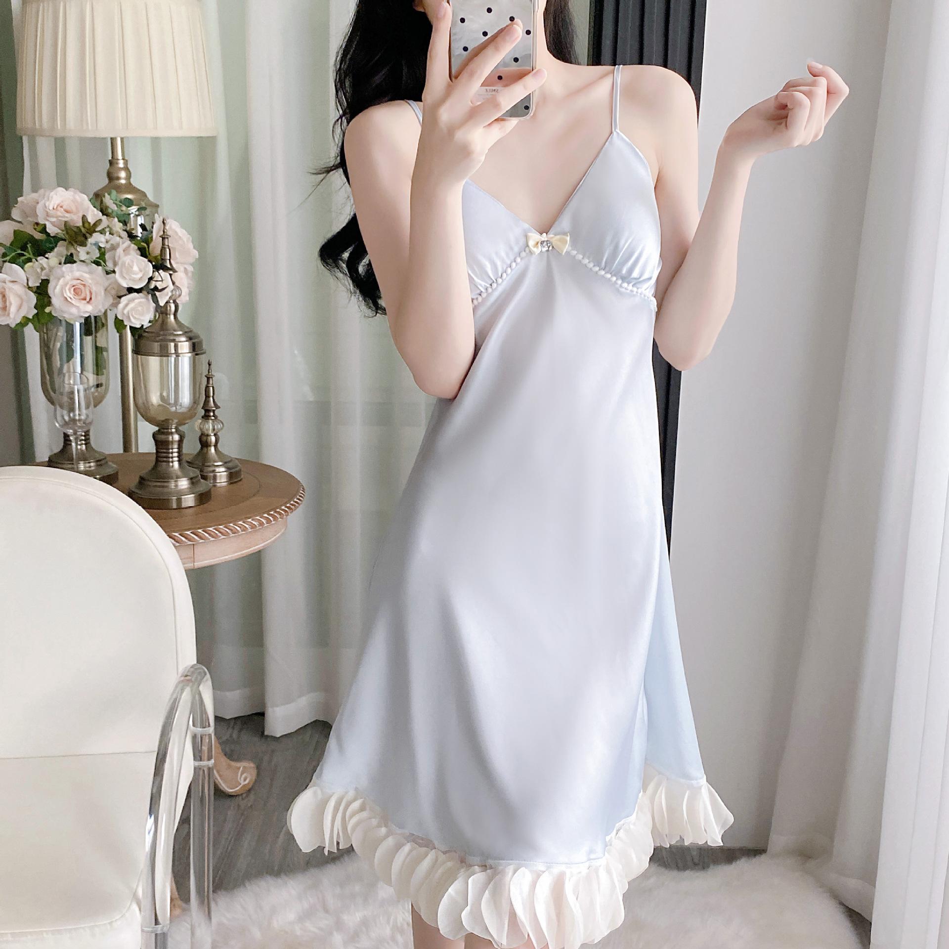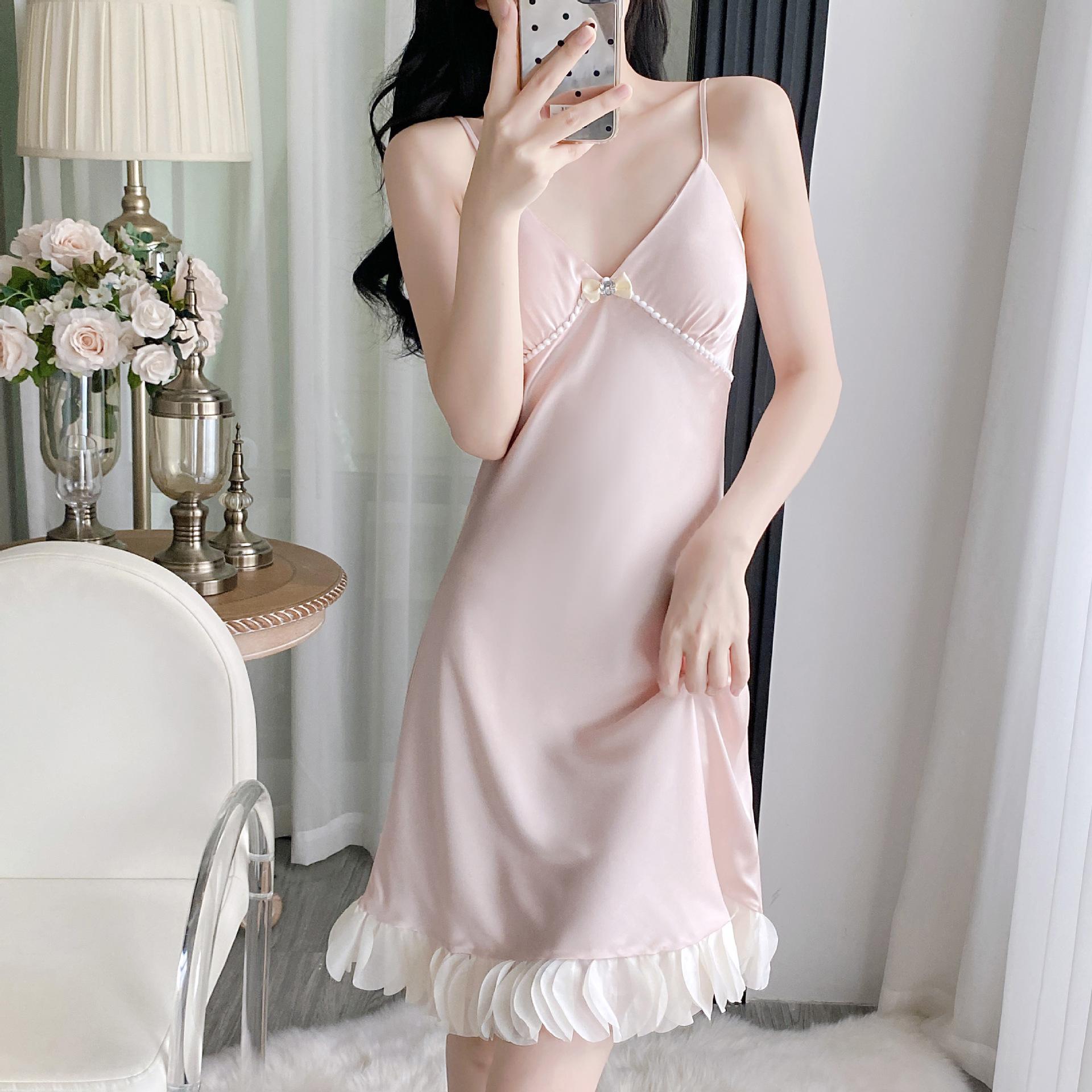 Celebridad de Internet Transmisión en Vivo Nuevo Conjunto de Camisón de Verano para Mujer de Dos Piezas Camisón de Seda de Hielo Pijama Sexy de Imitación de Seda Estilo Fino con Almohadillas para el Busto