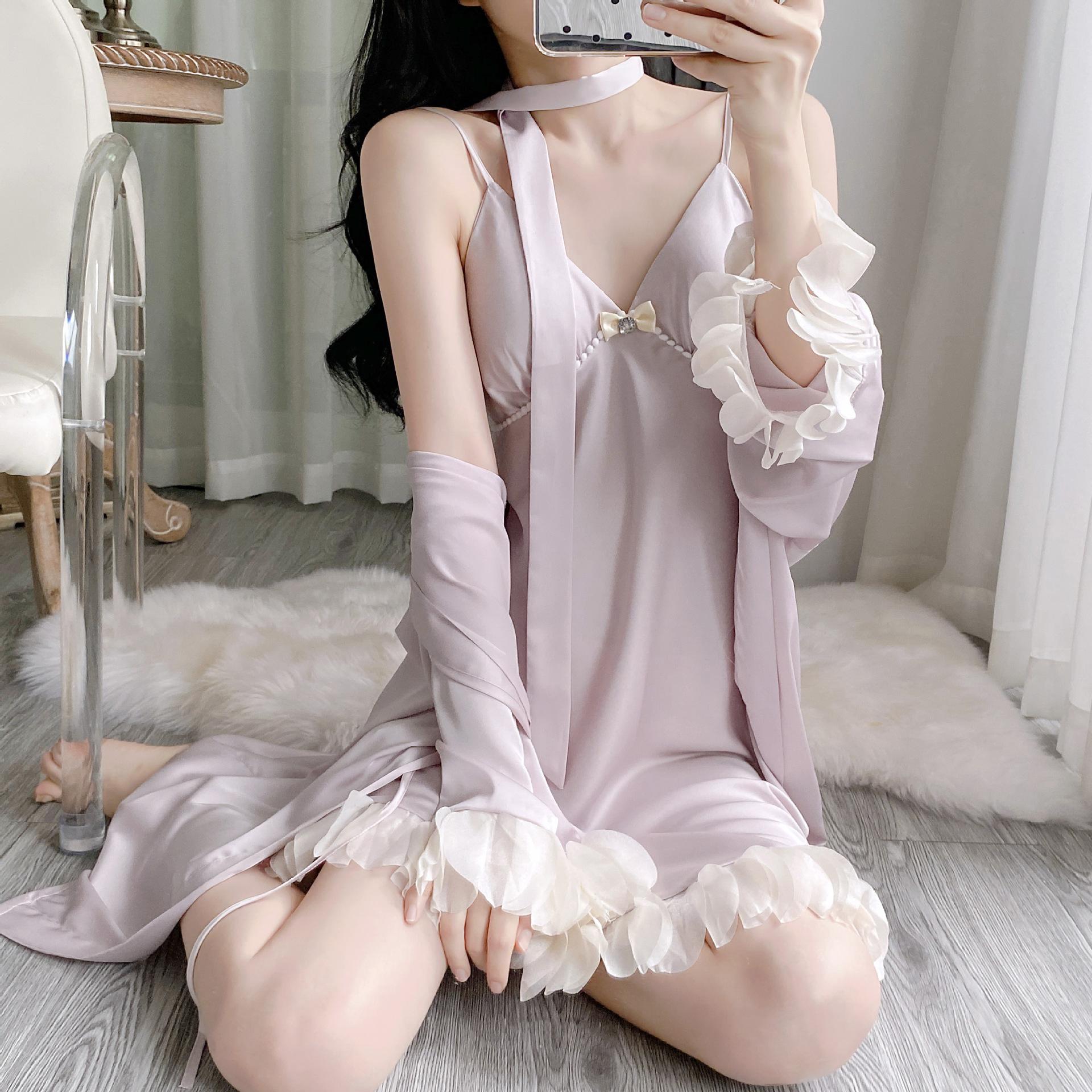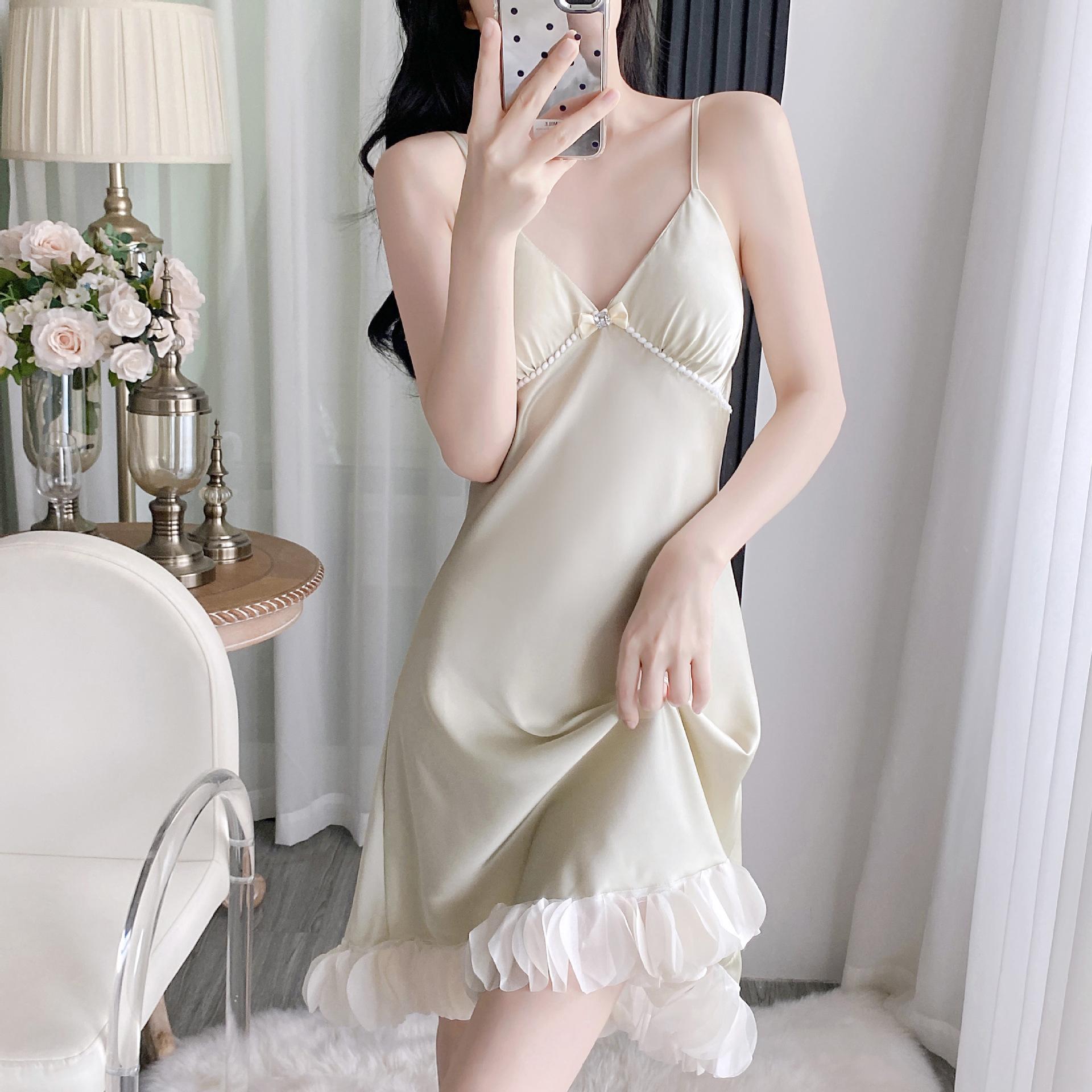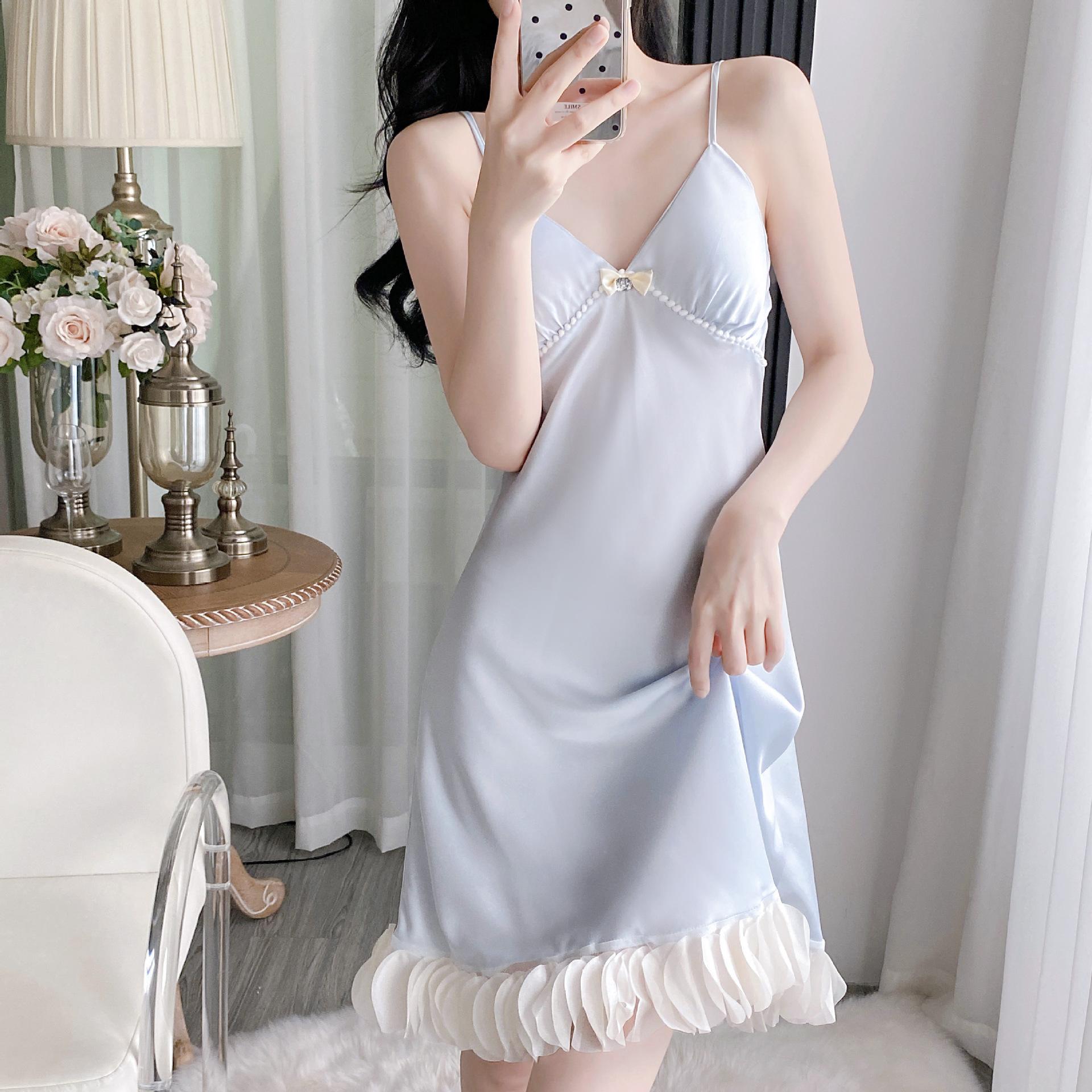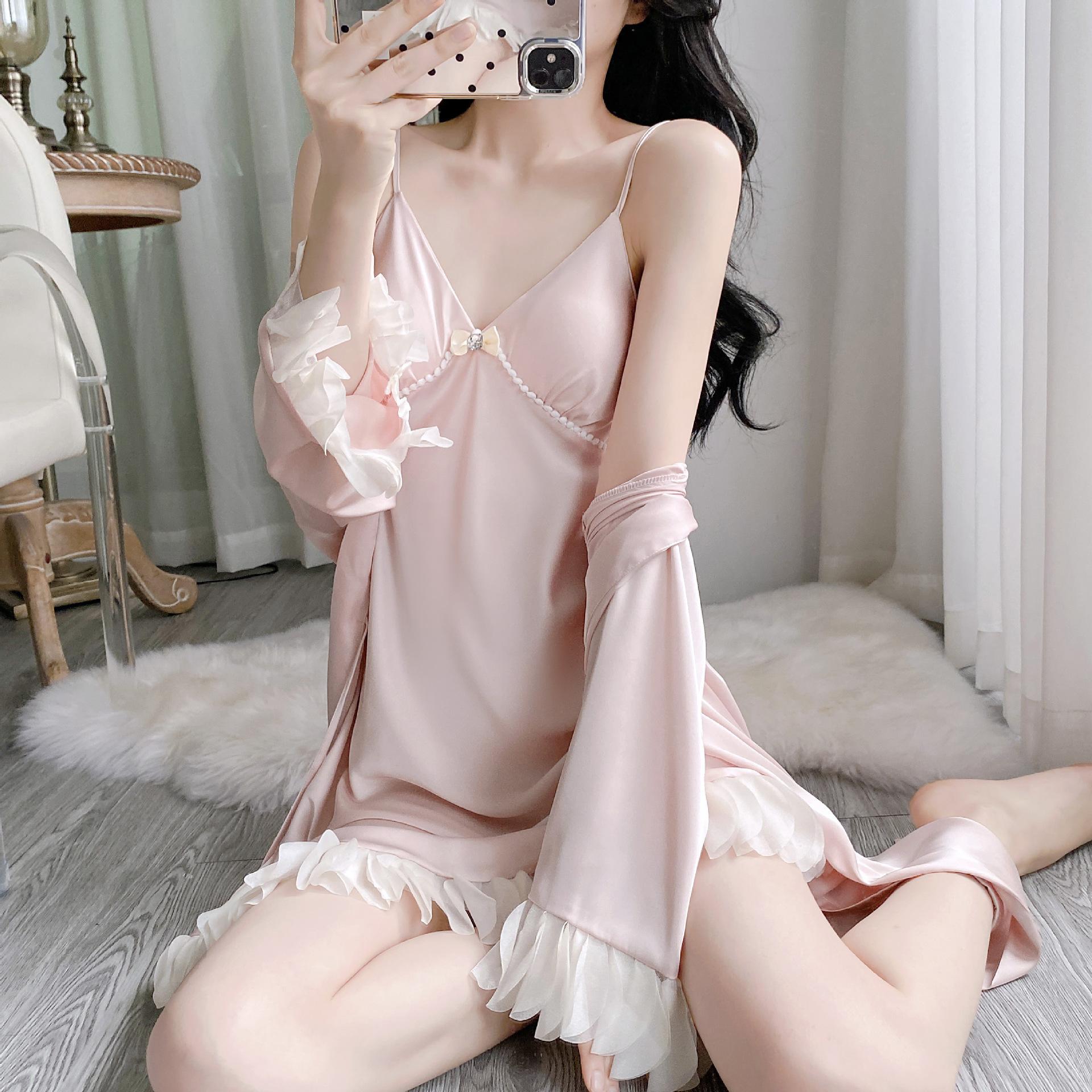 Celebridad de Internet Transmisión en Vivo Nuevo Conjunto de Camisón de Verano para Mujer de Dos Piezas Camisón de Seda de Hielo Pijama Sexy de Imitación de Seda Estilo Fino con Almohadillas para el Busto
