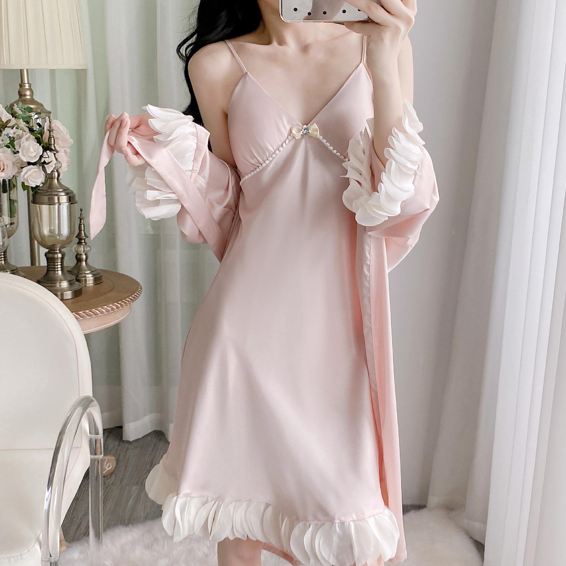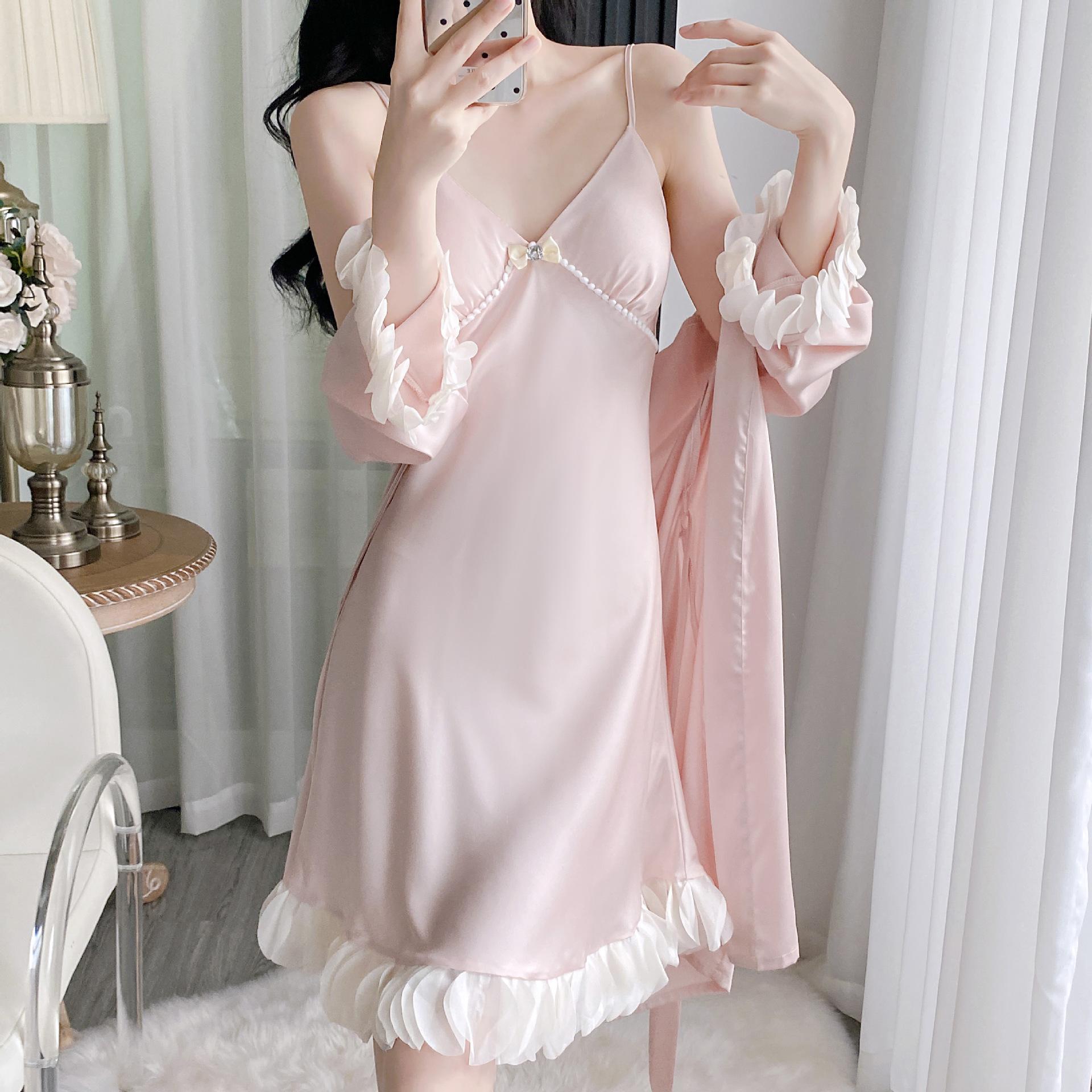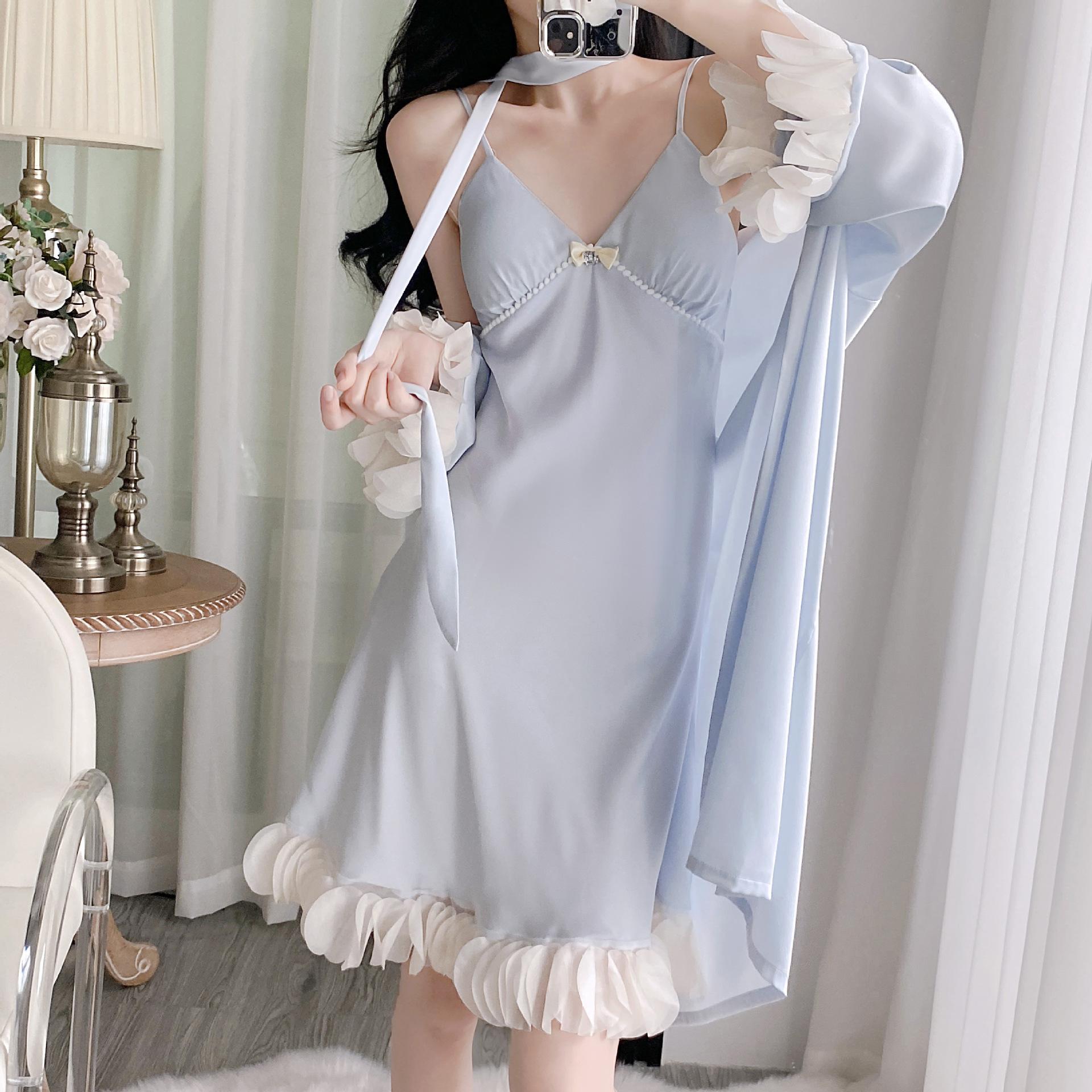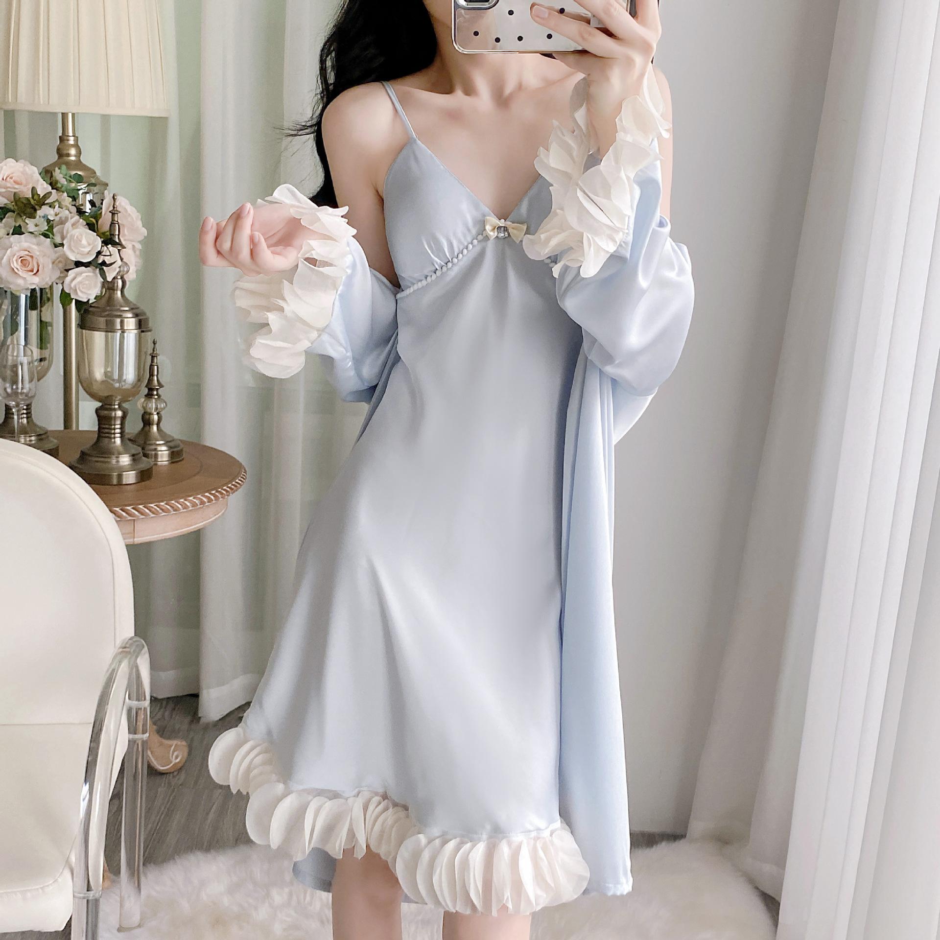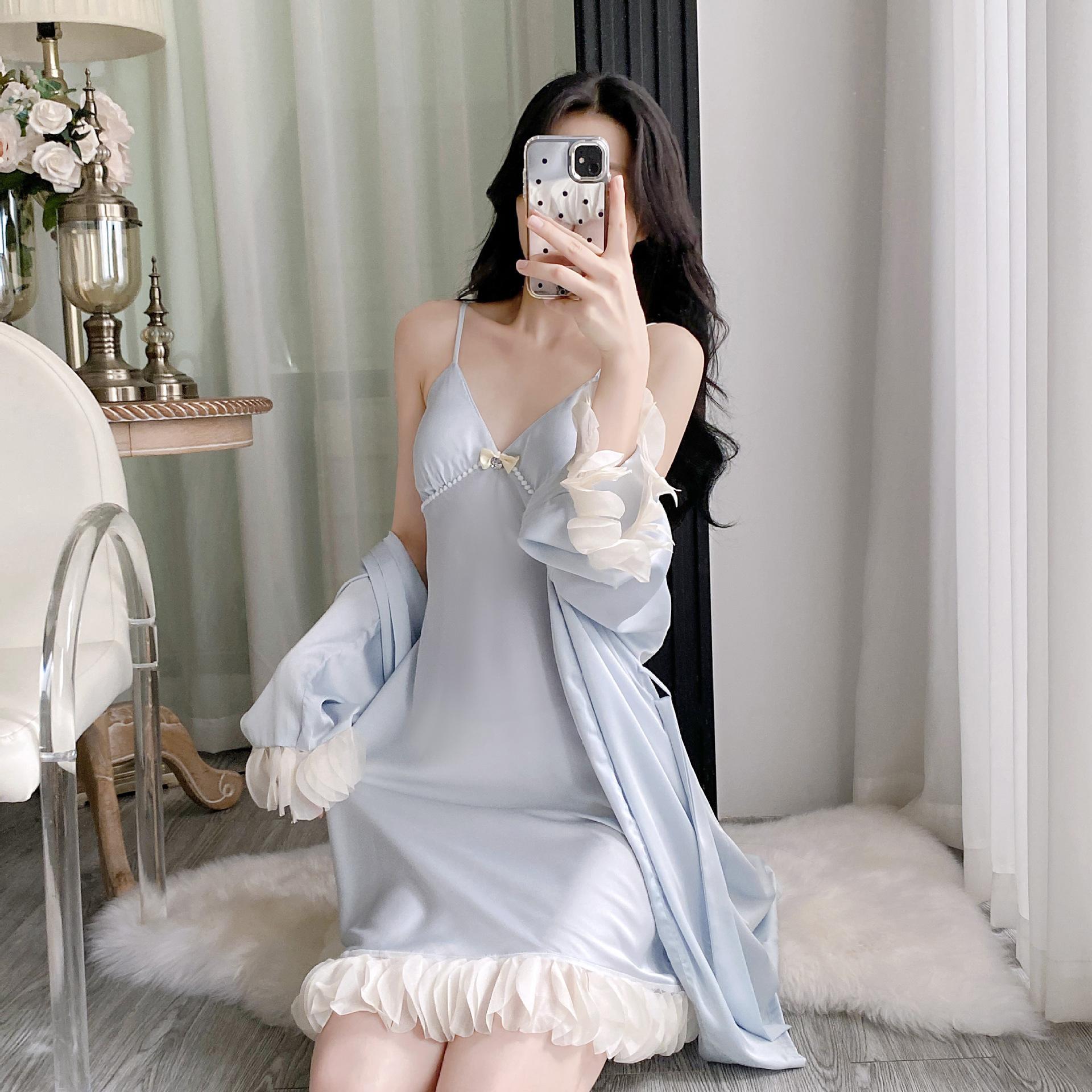 Fruit green-two-piece set (nightgown + robe), Pink-two-piece set (nightgown + robe), Sky blue-two-piece set (n...
