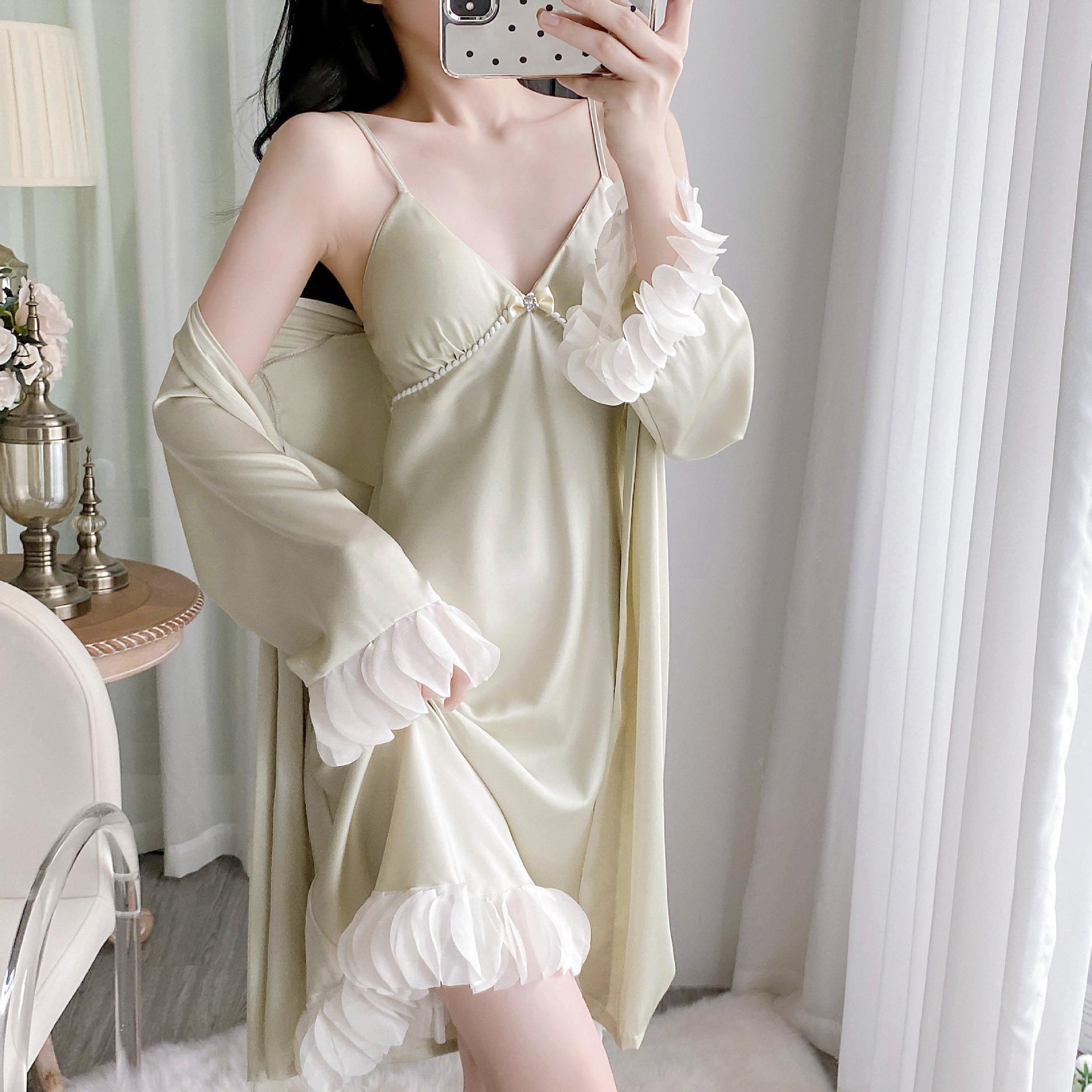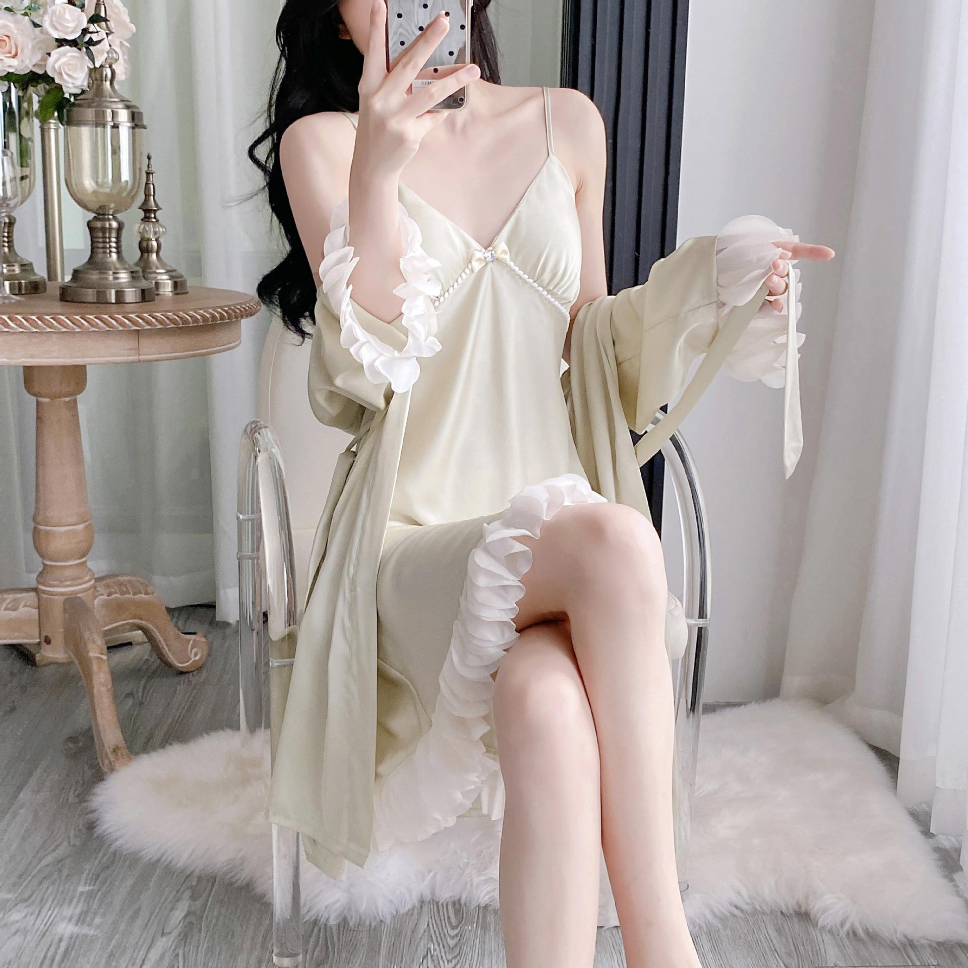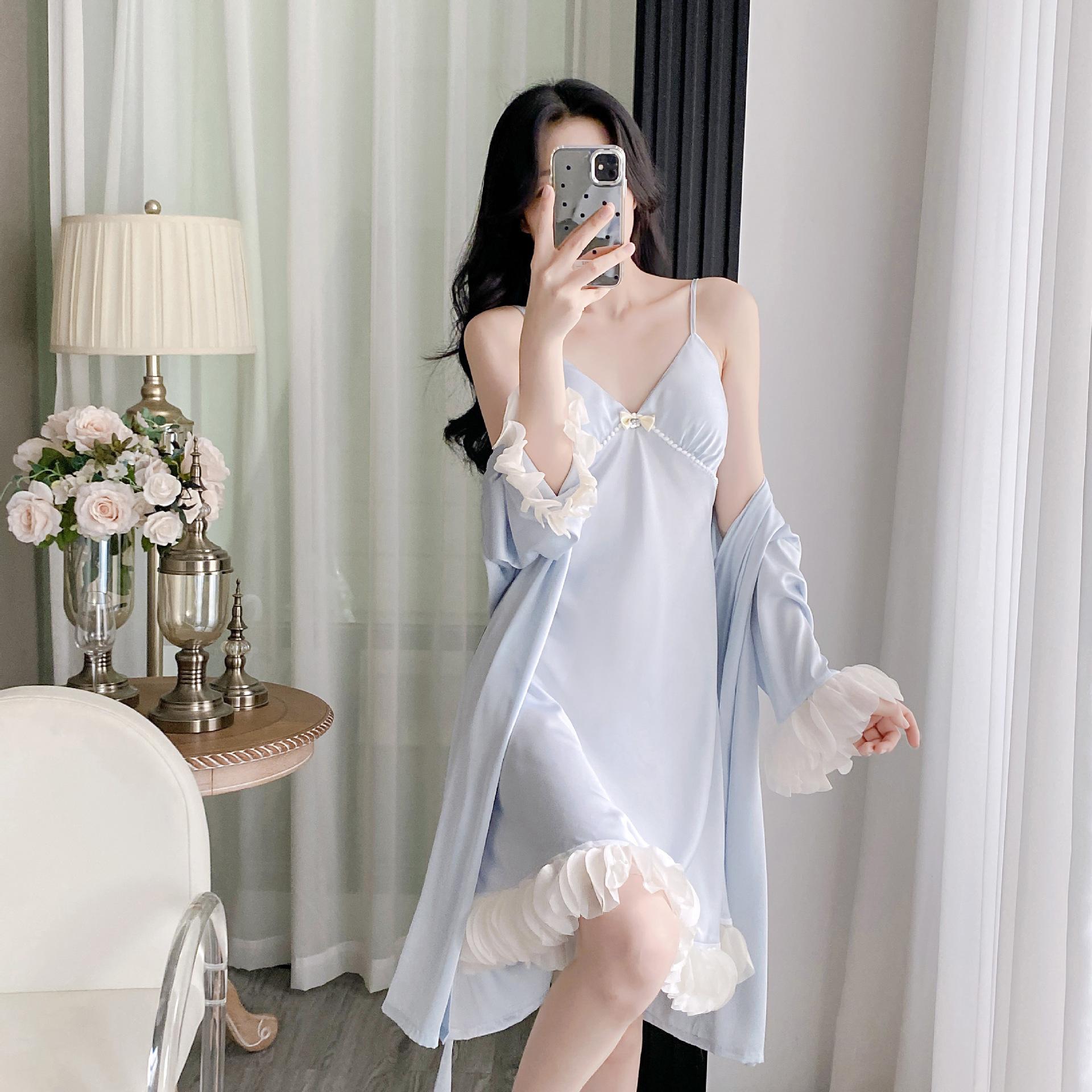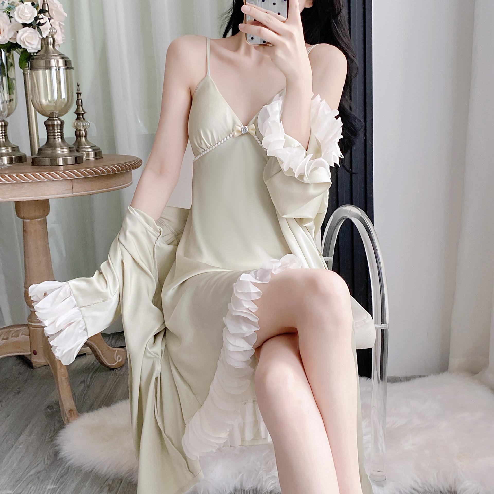 Fruit green-two-piece set (nightgown + robe), Pink-two-piece set (nightgown + robe), Sky blue-two-piece set (n...