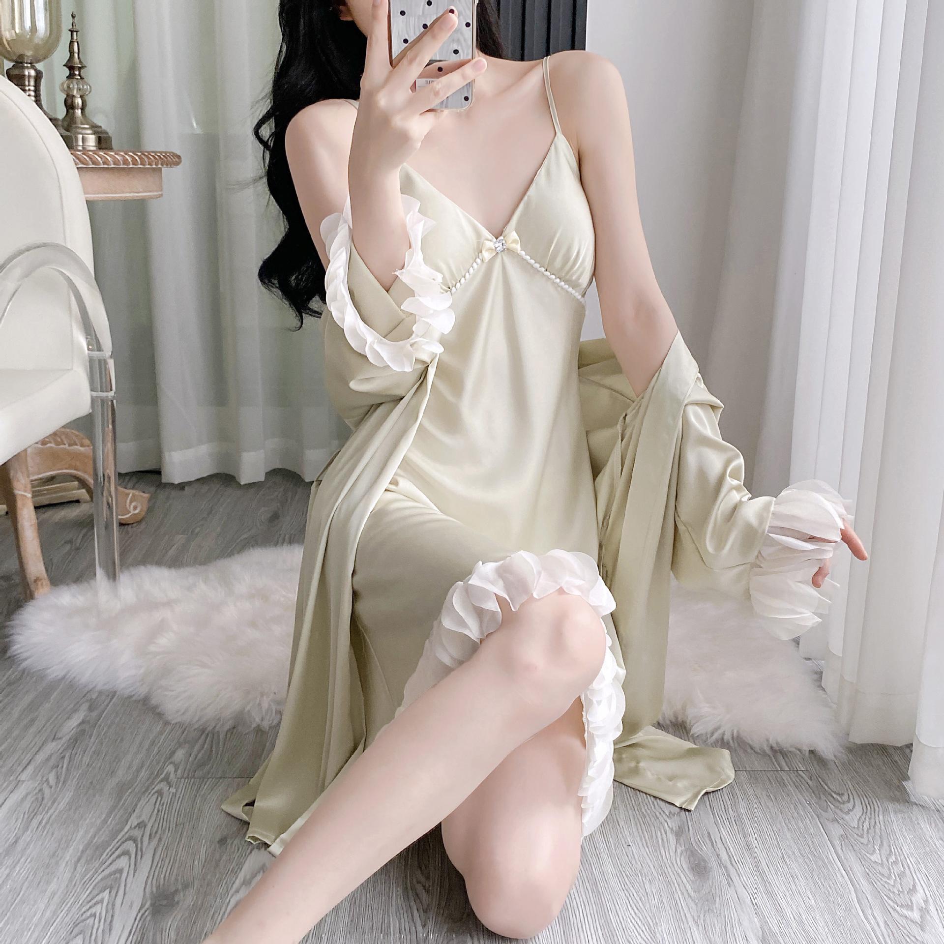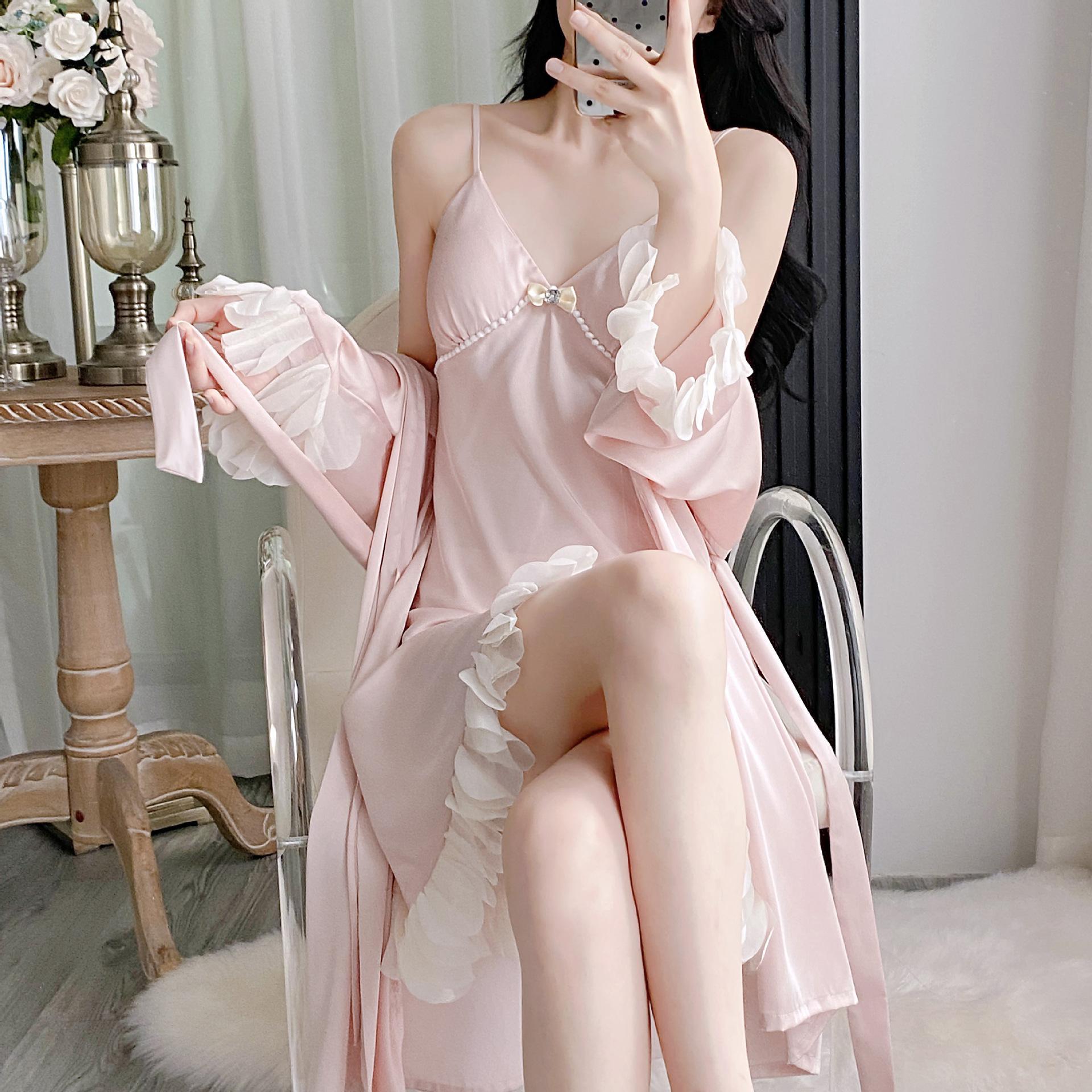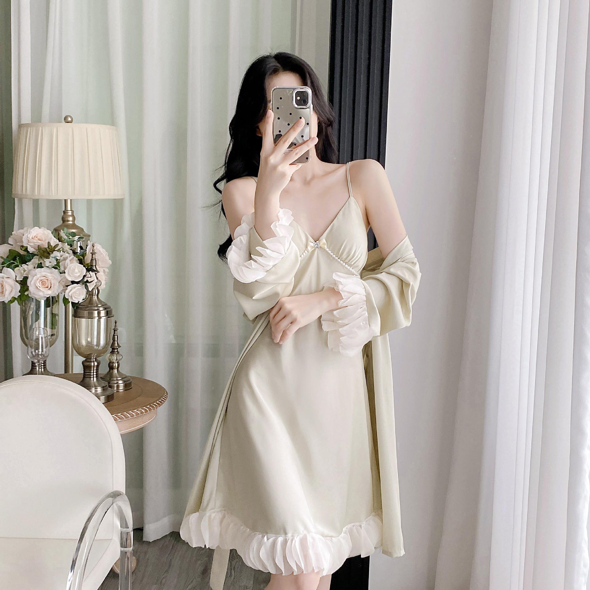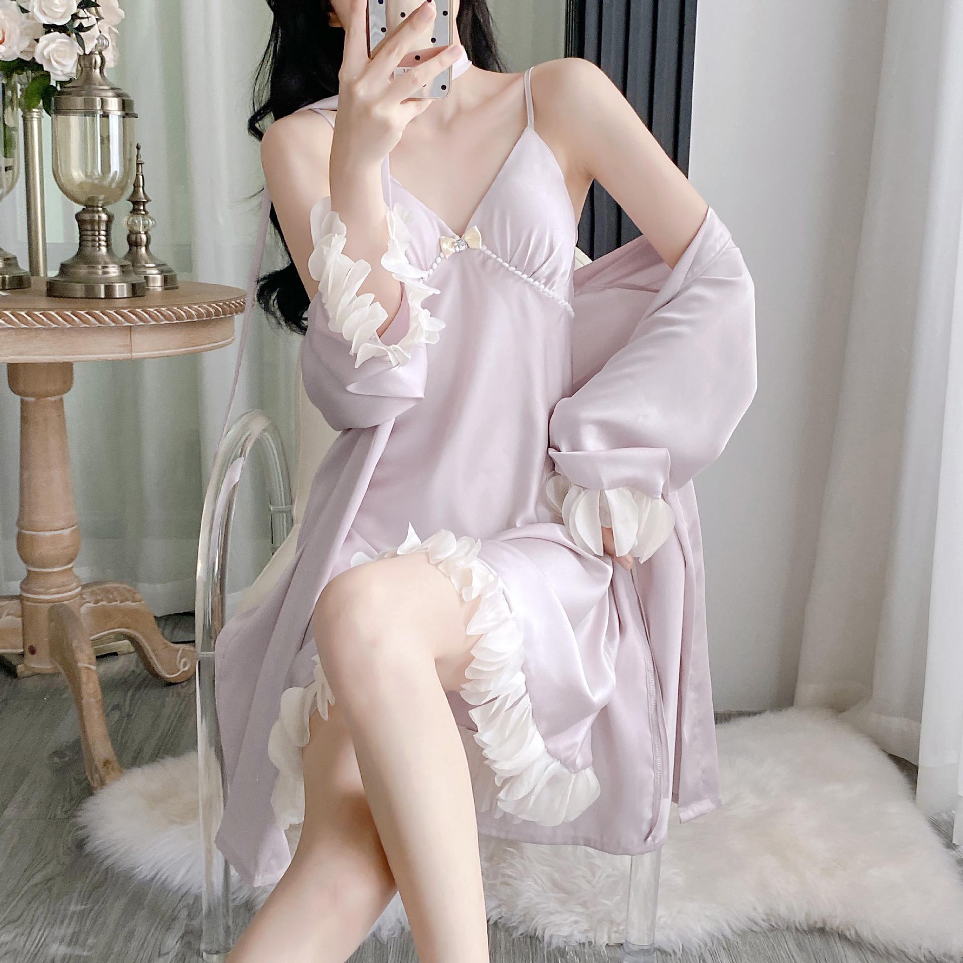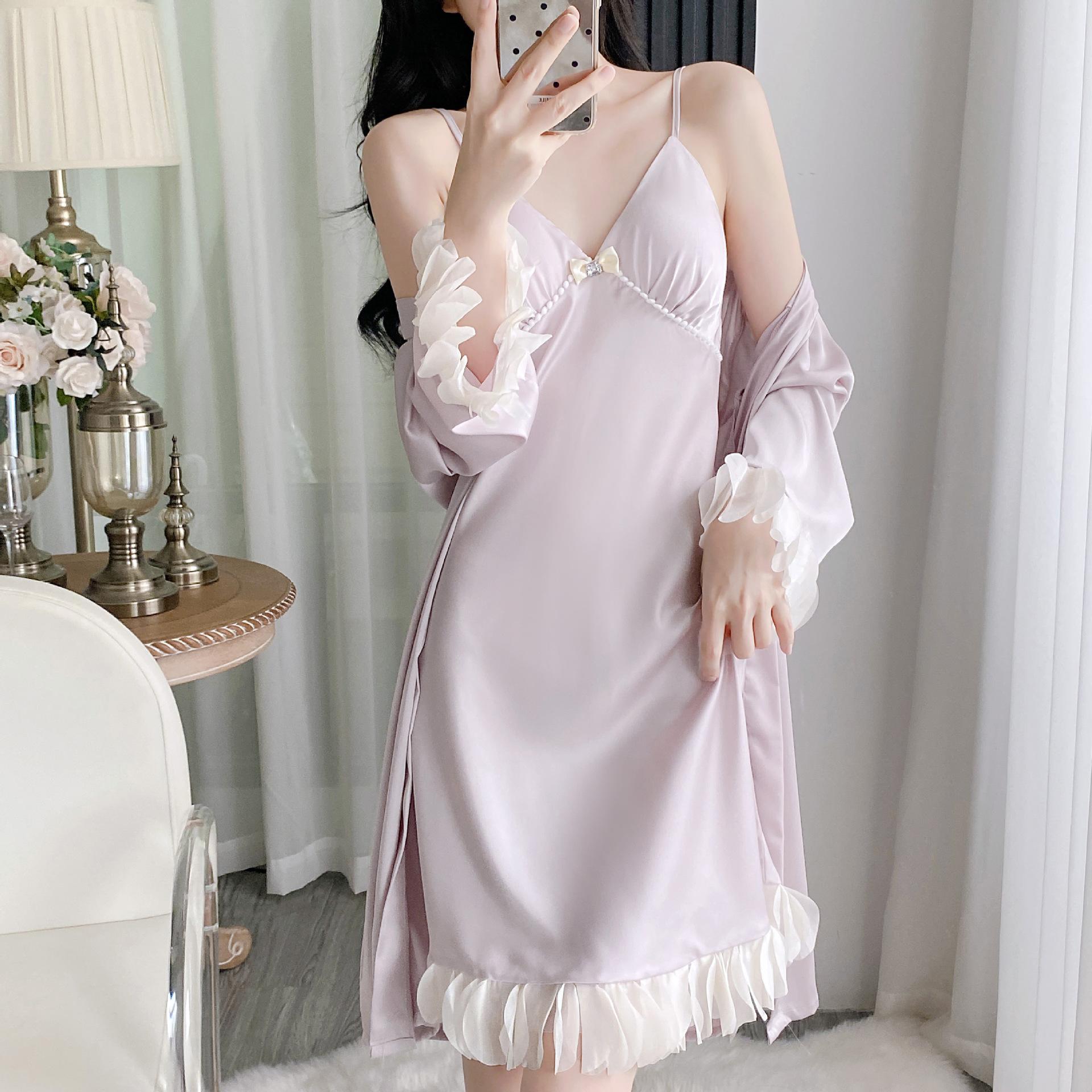 Fruit green-two-piece set (nightgown + robe), Pink-two-piece set (nightgown + robe), Sky blue-two-piece set (n...