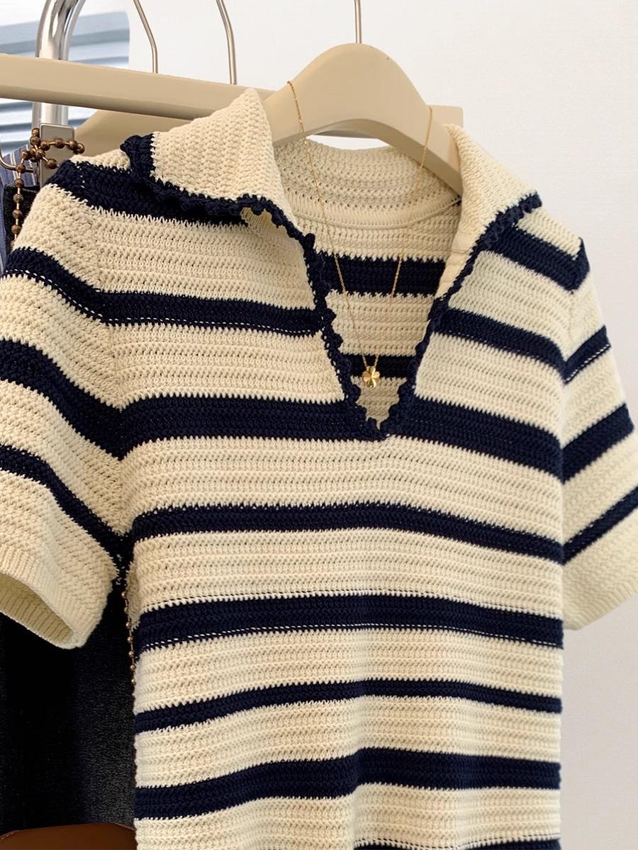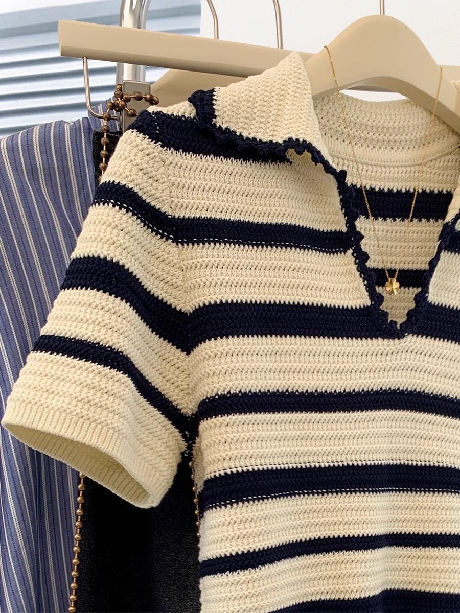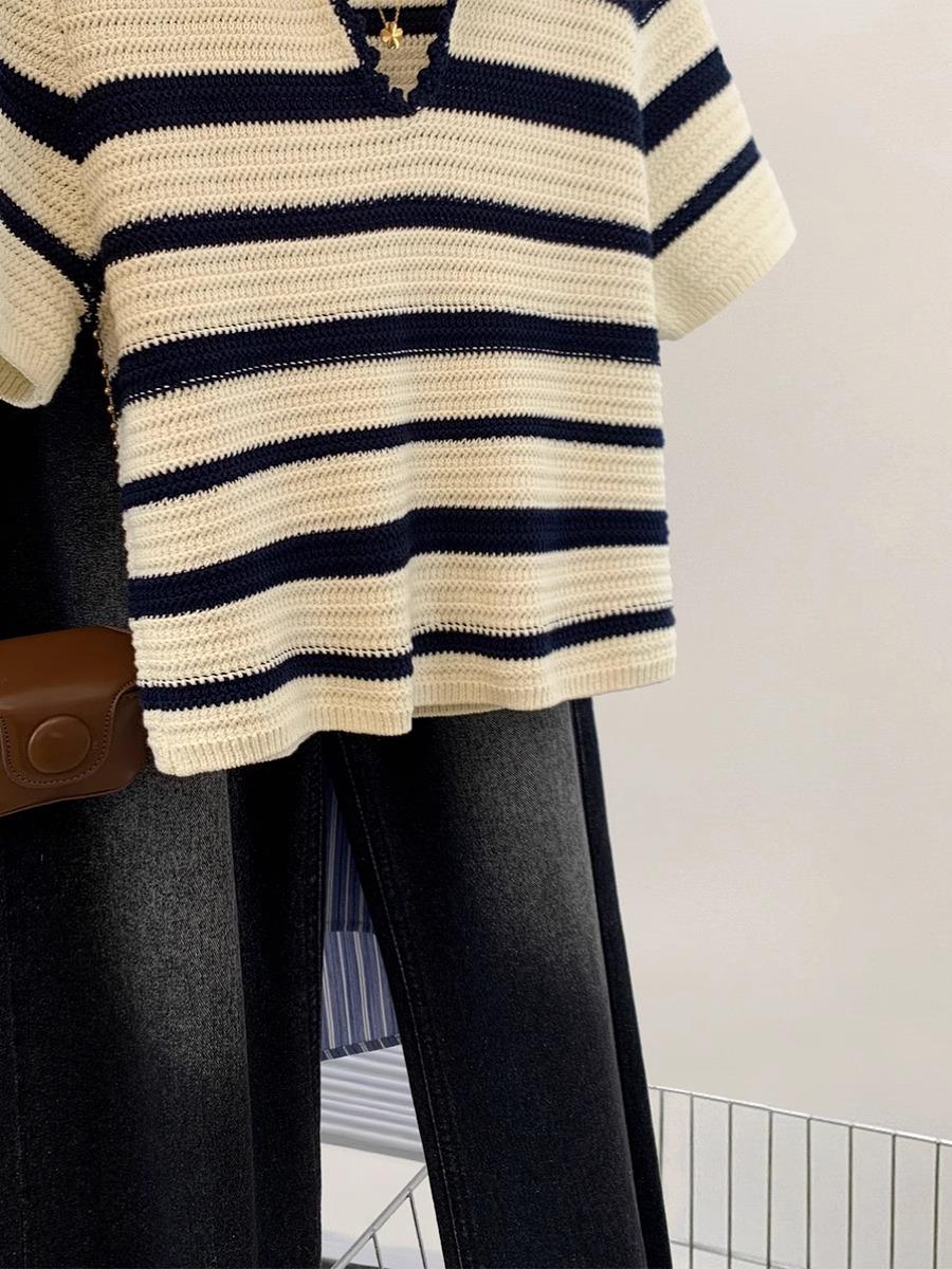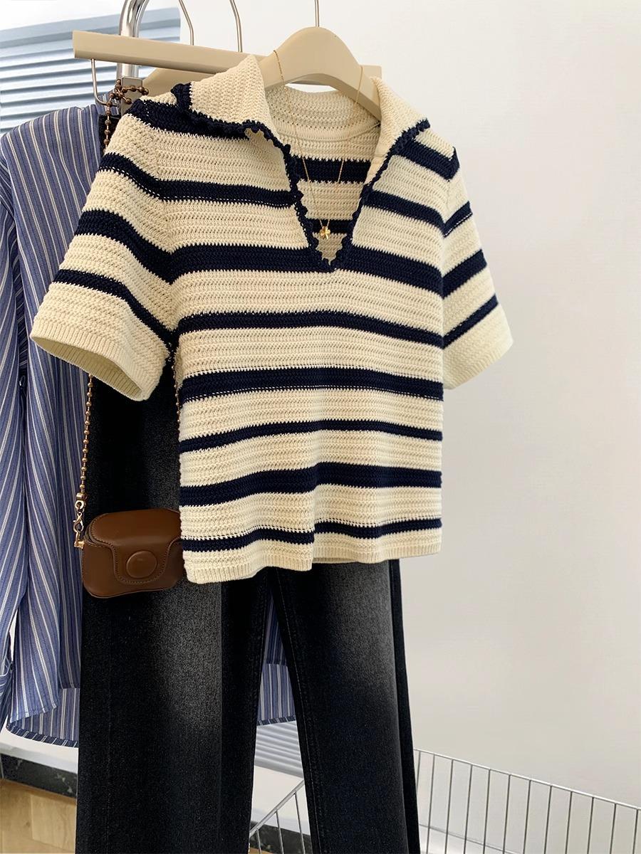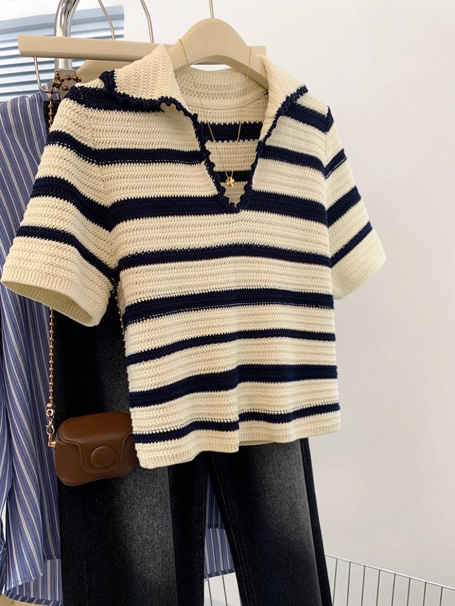 Playera de Punto de Manga Corta con Cuello en V y Hombro Rayado para Mujer Verano 2025 Nueva Camisa Polo con Cuello de Solapa Top Corto