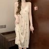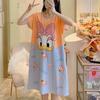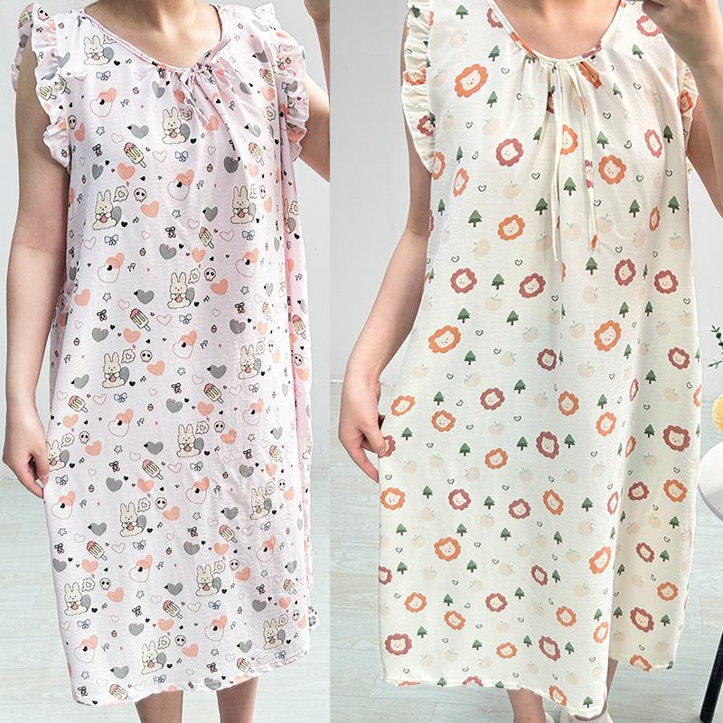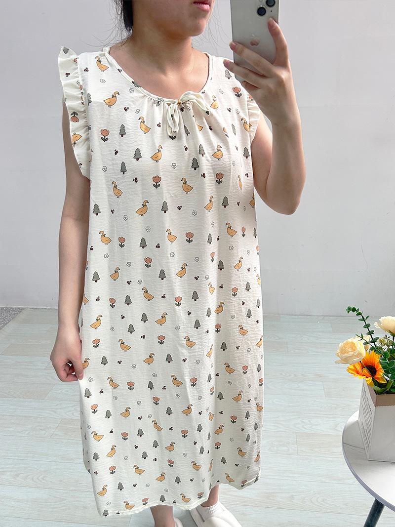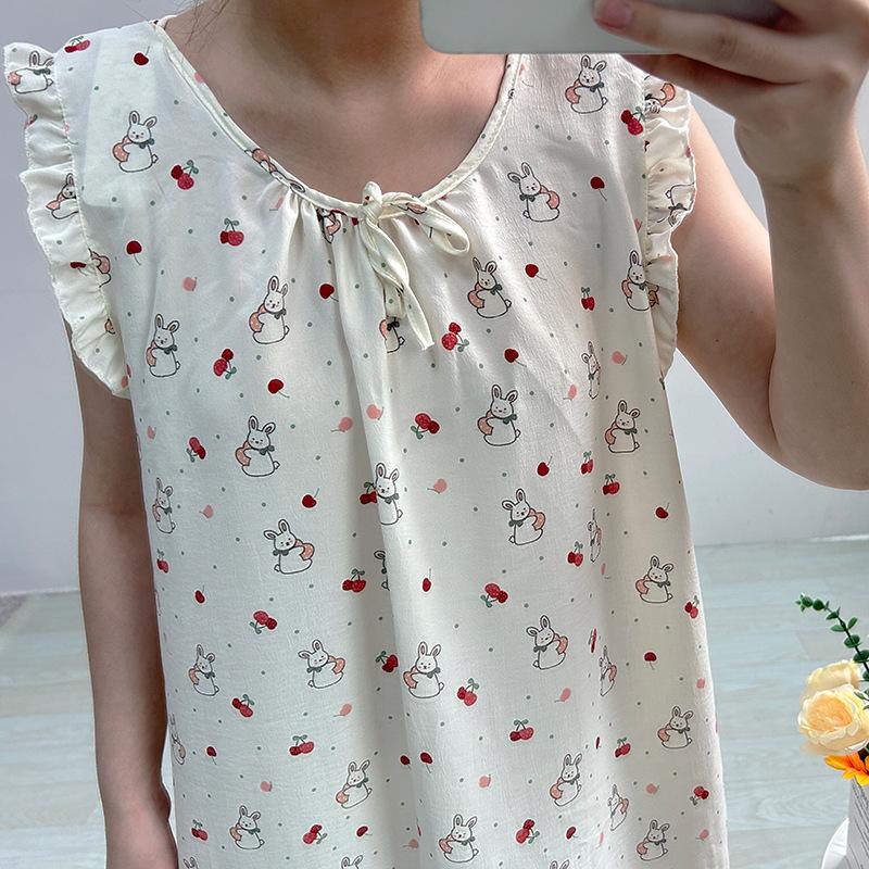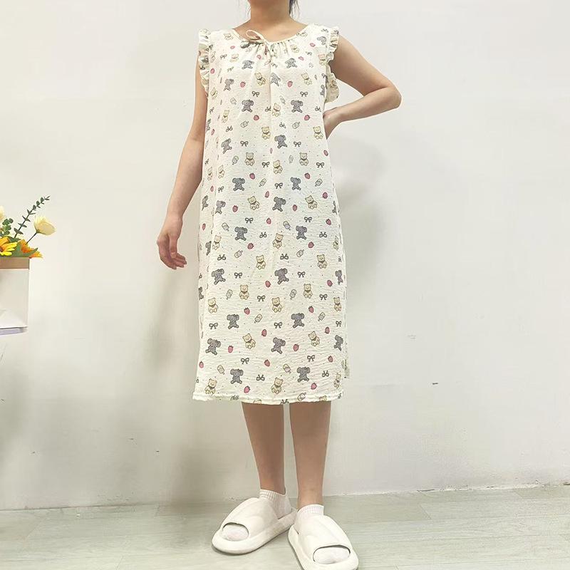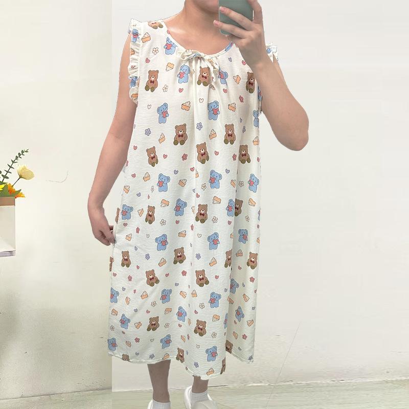 Estilo Coreano Verano Camisón de Encaje sin Mangas para Mujer Estampado de Dibujos Animados Cuello Redondo Jersey Largo Medio Dulce Falda para Casa para Uso Exterior