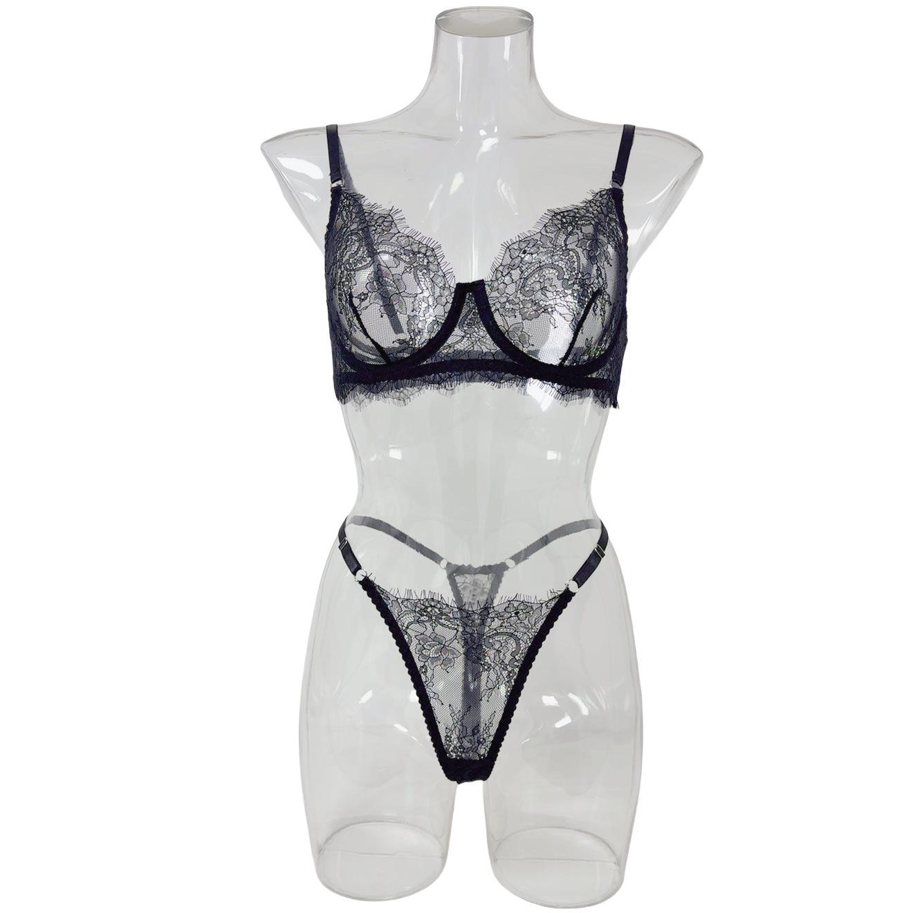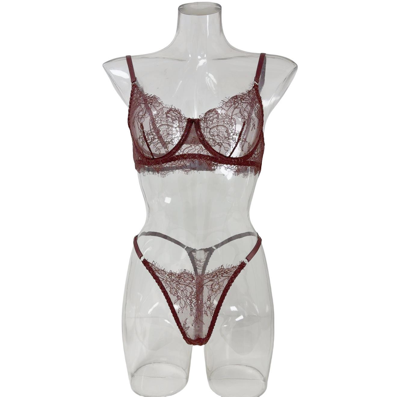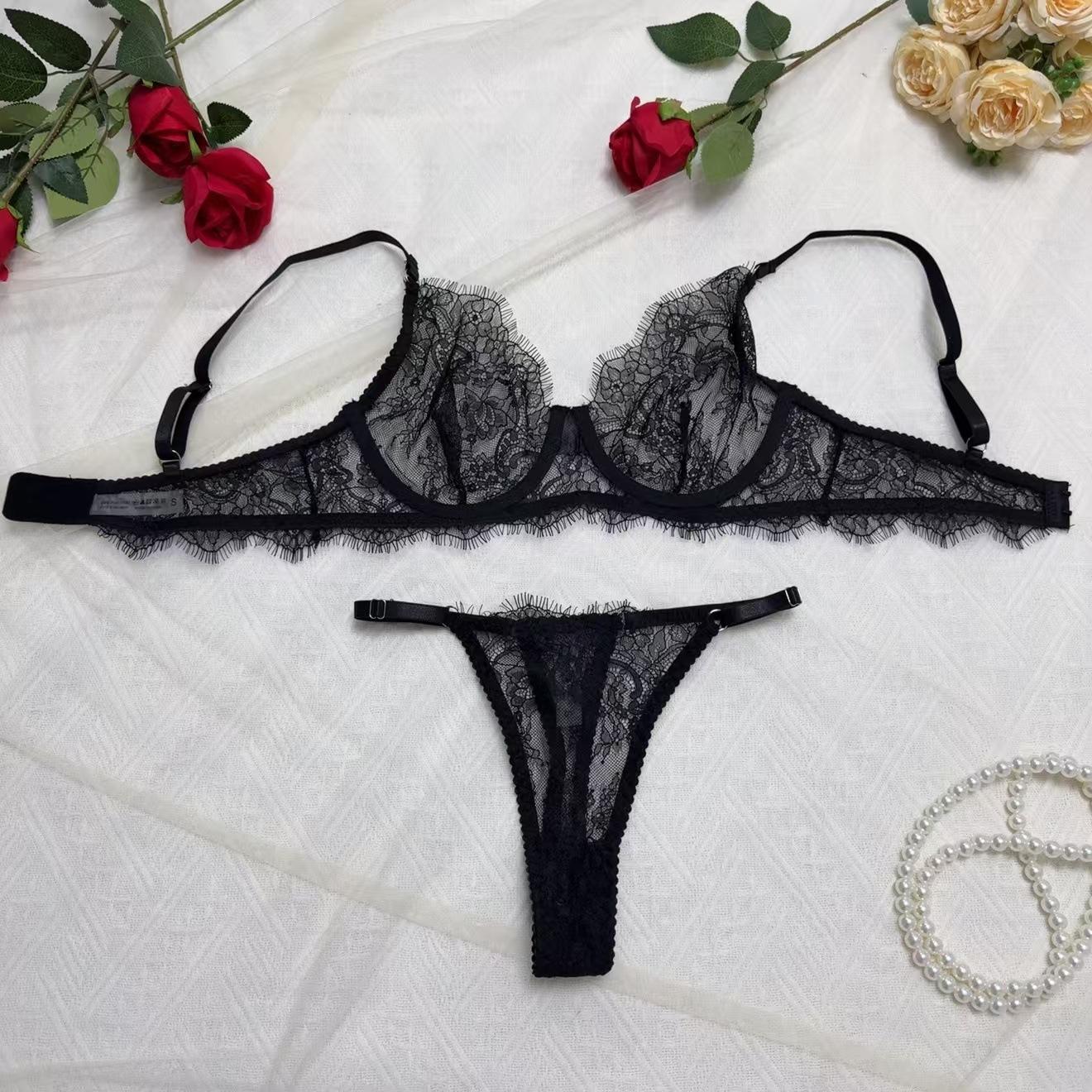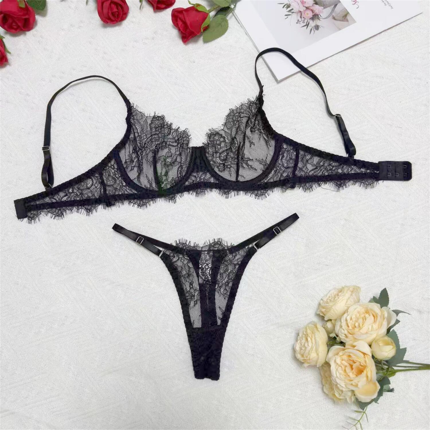Ropa interior de encaje transfronteriza europea y americana para mujer, sexy, bordada, ultradelgada, transparente, tentación, con aro de acero, conjunto de brasier sexy, venta al por mayor