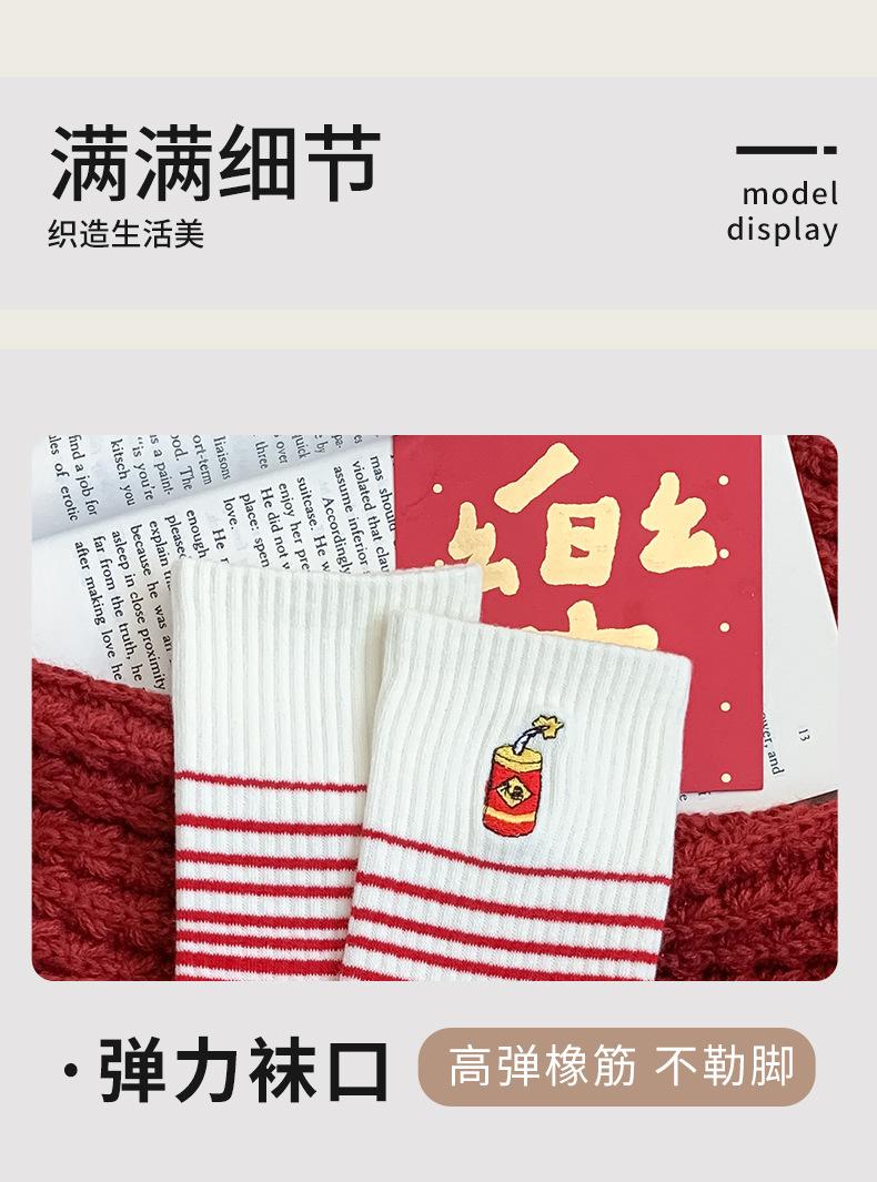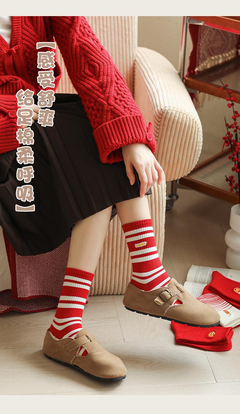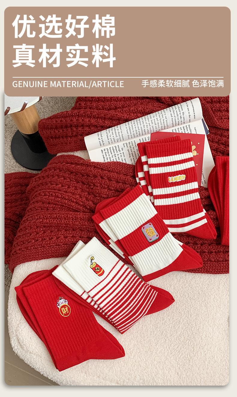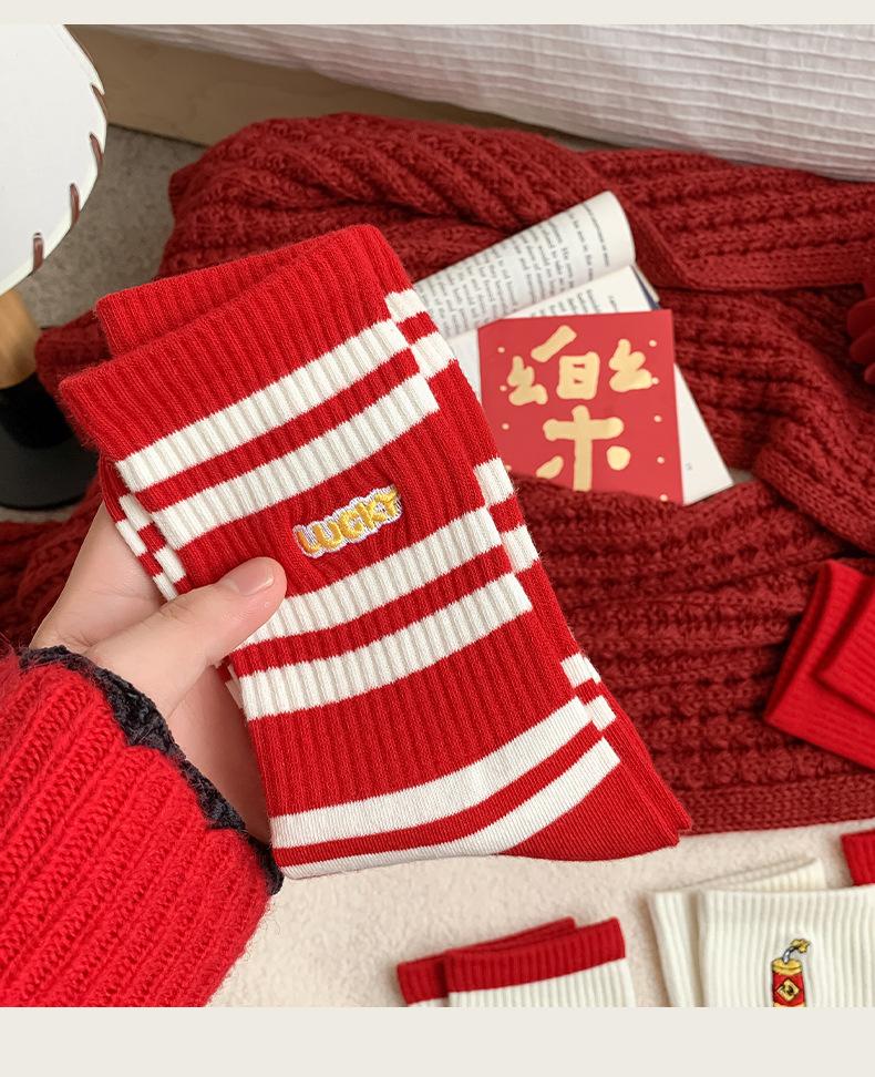 Calcetines Rojos Calcetines de Media Caña para Mujer Calcetines sin Costuras Bordado de Dibujos Animados Calcetines de Año Nuevo Rayados Modernos Versátiles Algodón Peinado Calcetines de Año Nuevo