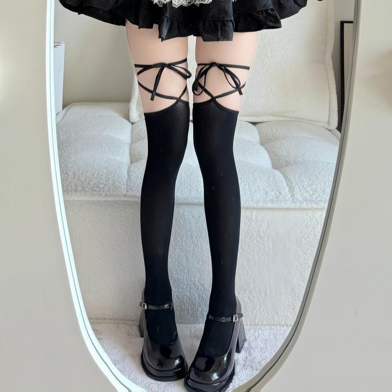 Calcetines Media Pantorrilla Lolita Primavera y Otoño Medias Negras Calcetines con Tiras Cruzadas Negros Media Longitud Hasta la Rodilla Jk Calcetines de Pantorrilla